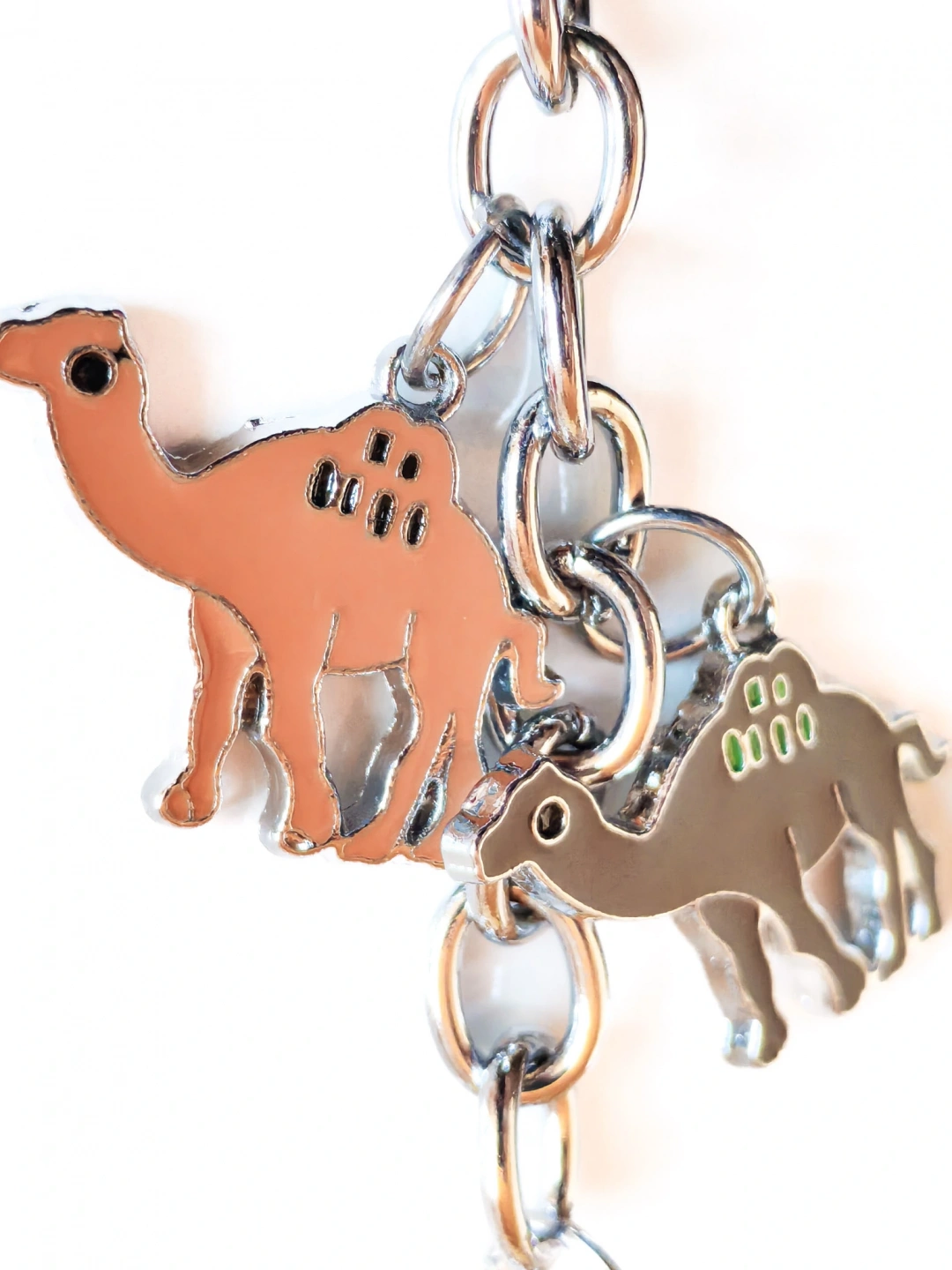Çölün asil ve sabırlı yol arkadaşlarını temsil eden3 farklı renkte deveden oluşan metal anahtarlık, hem kültürel bir anlam hem de estetik bir şıklık taşıyor. Farklı renklerdeki deve figürleri bir araya gelerek hem görsel bir uyum hem de sembolik bir derinlik oluşturuyor. Yolculuğu, dayanıklılığı ve bereketi simgeleyen bu tasarım, anahtarlarınıza ya da çantanıza taktığınızda size sadece pratik bir kullanım değil, aynı zamanda özel bir anlam da katıyor.