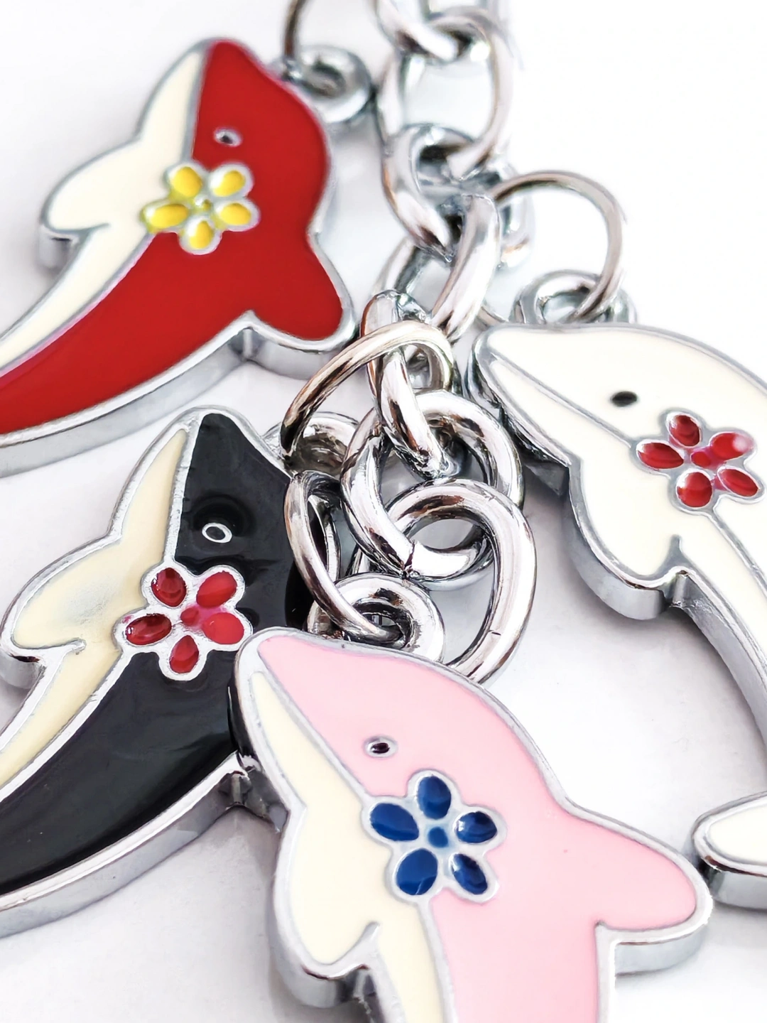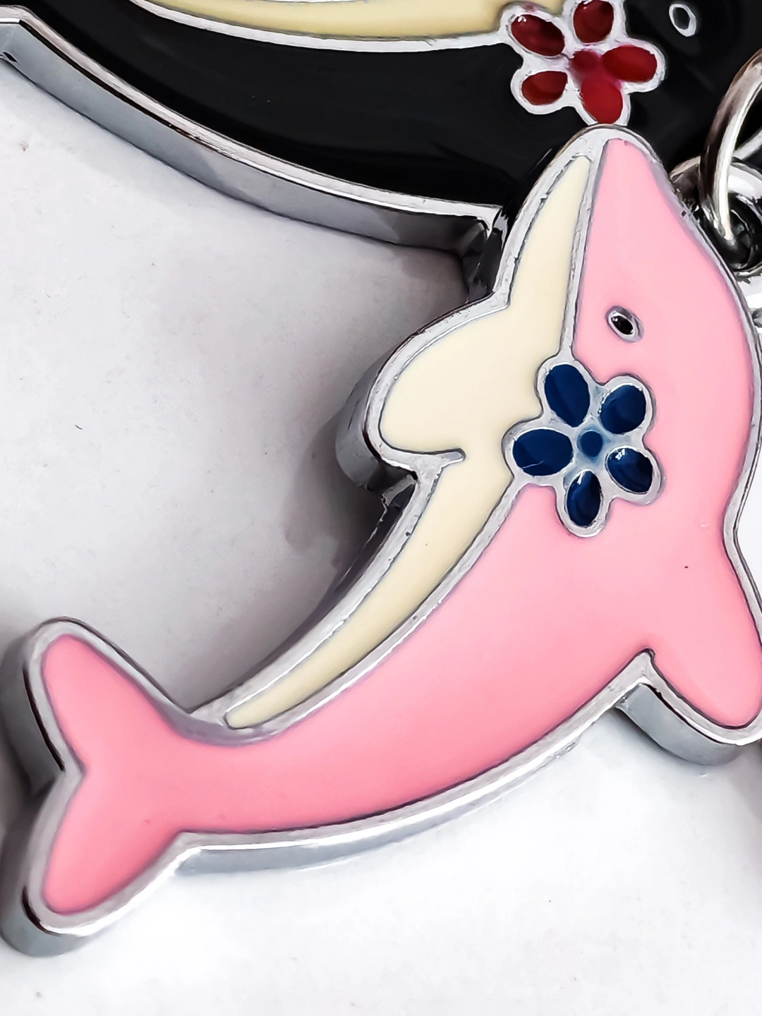 Dört farklı renkte tasarlanmış sevimli yunus balıklarının bir araya gelmesiyle oluşan bu metal anahtarlık, deniz ve doğa severler için özel bir aksesuardır. Canlı renkleriyle enerjik bir görünüm sunarken, zarif detaylarıyla günlük kullanımda şıklık katar.
