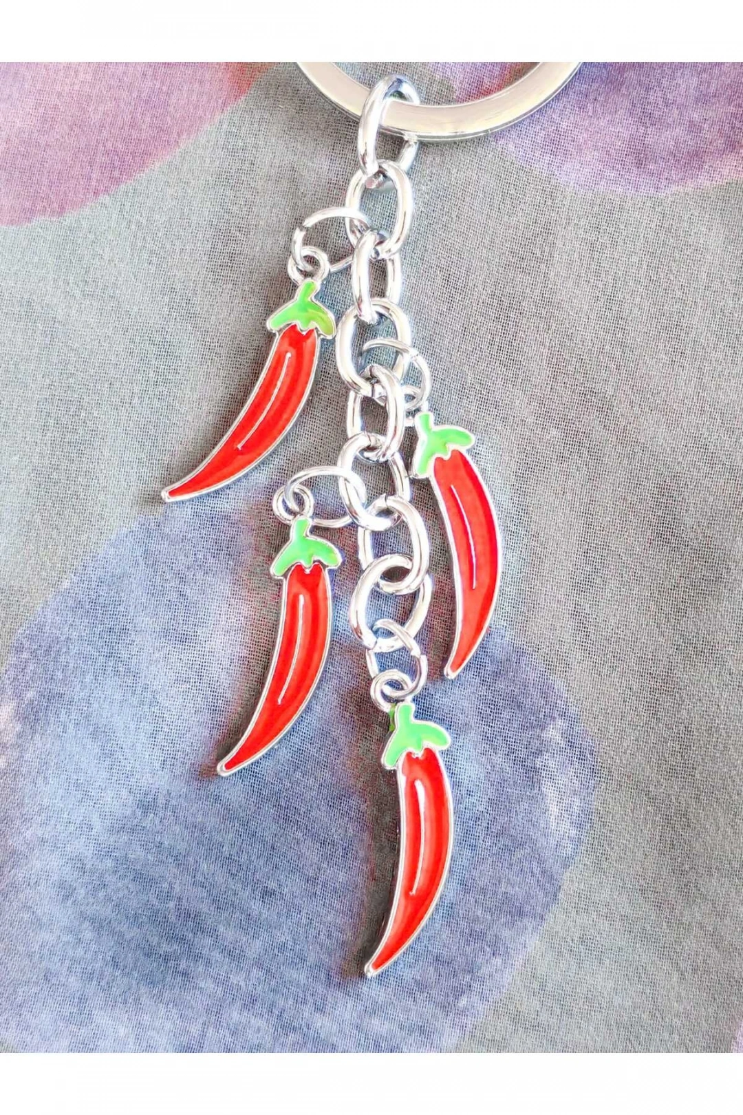 Canlı kırmızı rengiyle dikkat çeken 4 biber figüründen oluşan metal anahtarlık, enerjik ve eğlenceli bir stil arayanlar için tasarlanmıştır. Şans, bereket ve bolluğu simgeleyen biber figürleri, anahtarlarınıza ya da çantanıza farklı bir hava katar. Günlük hayatınıza küçük ama etkili bir detay ekleyen bu aksesuar, sevimli görünümüyle her ortamda fark edilir.