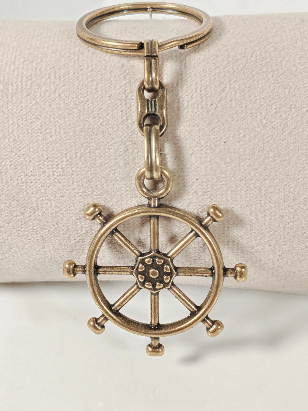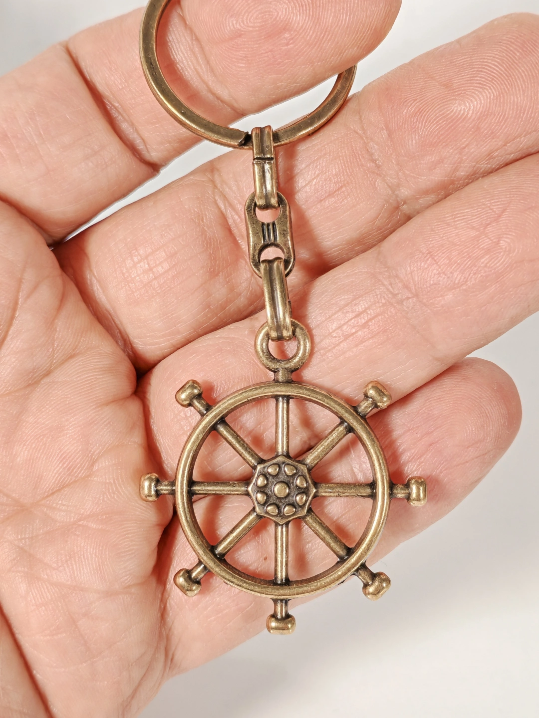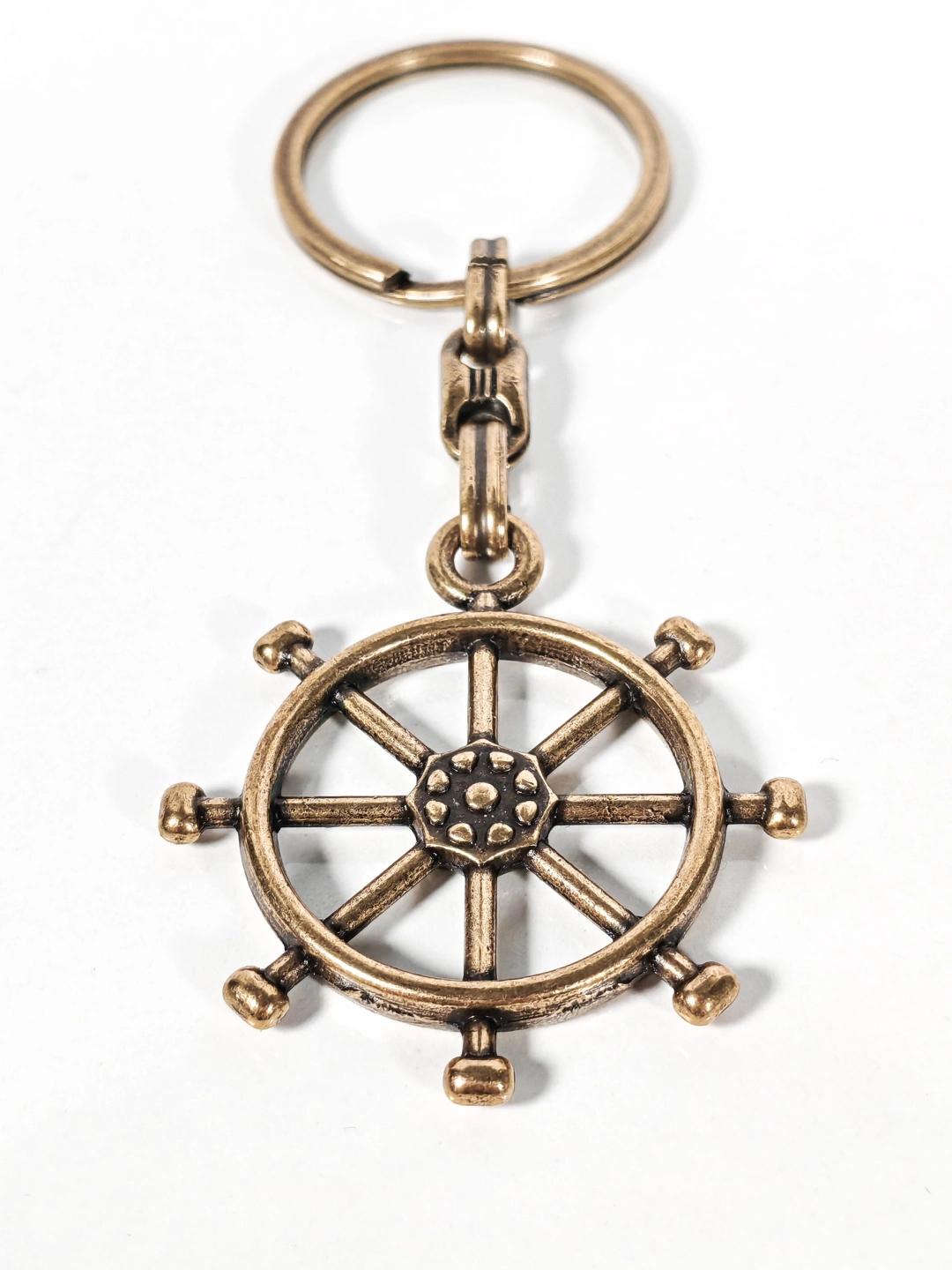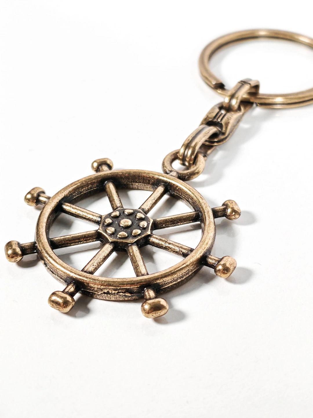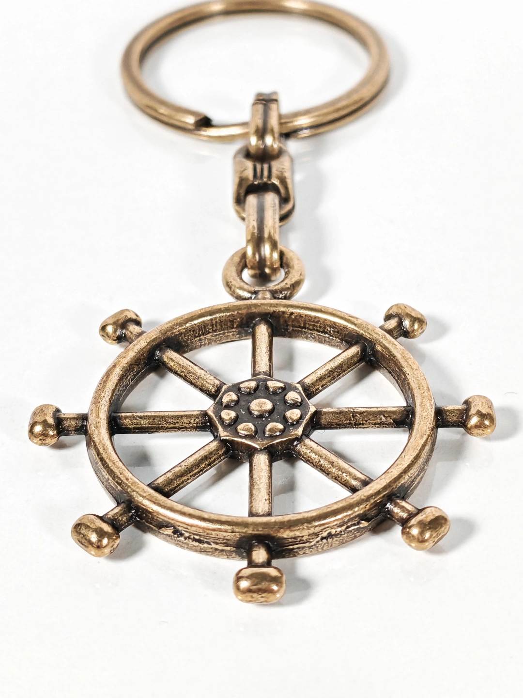 Dayanıklı metal malzemeden üretilmiştir. Antik eskitme yüzeyi sayesinde vintage bir stil sunar ve günlük kullanıma uygundur. Detaylı dümen formu ve kabartmalı yüzey dokusu ürüne güçlü bir görsel etki kazandırırken, sağlam anahtarlık halkası anahtarlarınızı güvenle taşımanızı sağlar. Dengeli ağırlığı sayesinde cepte veya çantada rahat bir kullanım sunar.