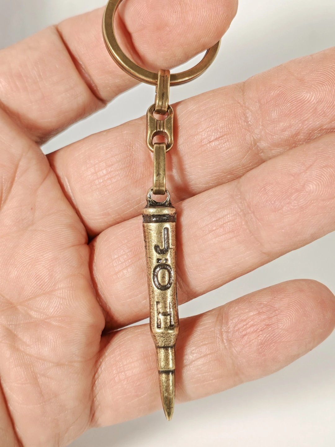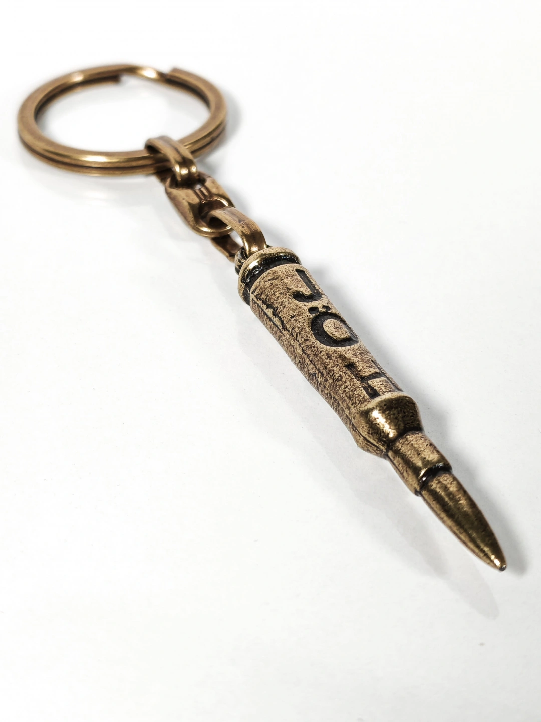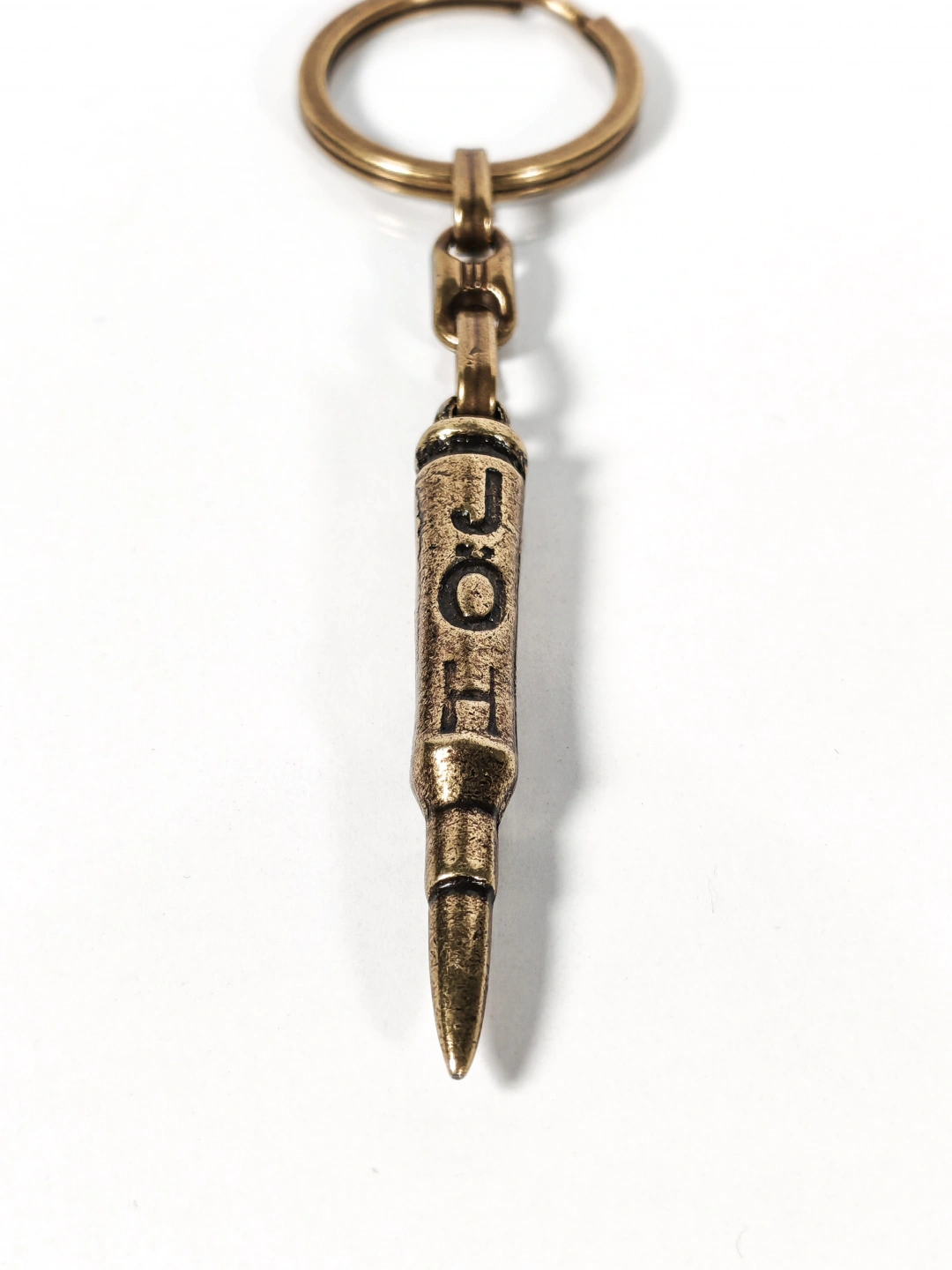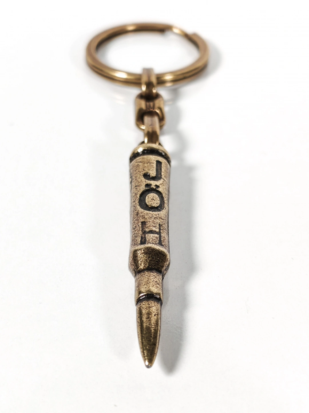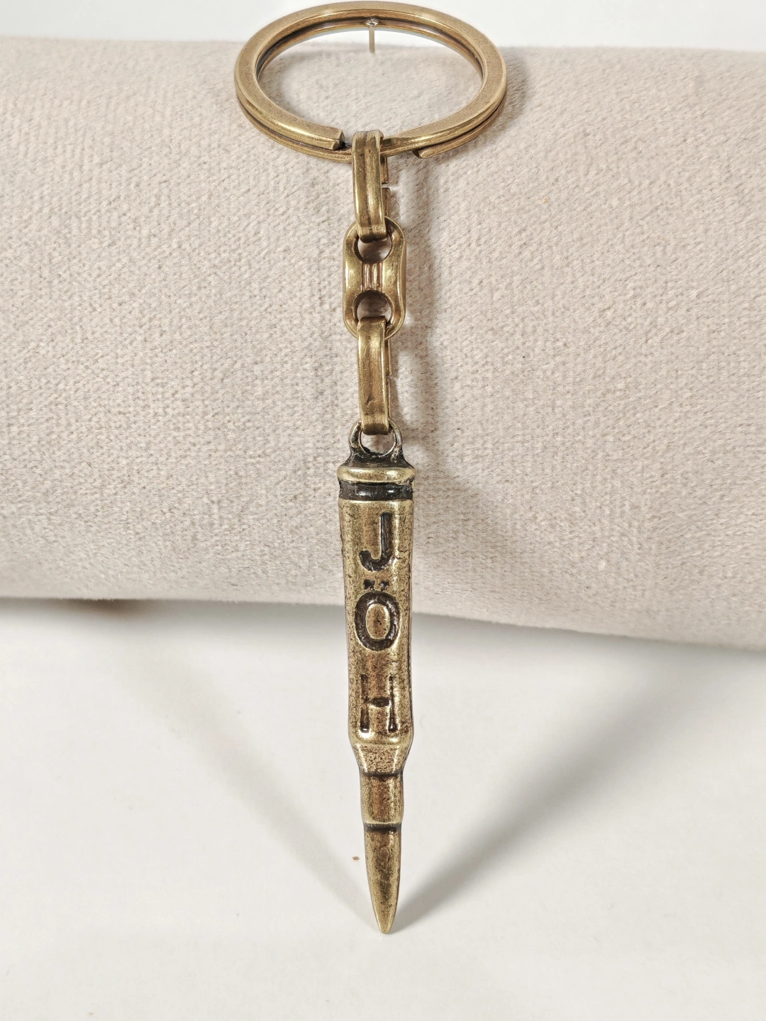 Antik bronz tonuyla tasarlanan mermi figürlü bu metal anahtarlık, güçlü sembolleri ve maskülen detayları sevenler için özel olarak üretilmiştir. Mermi formu; kararlılığı, cesareti ve hedefe odaklanmayı temsil ederken, üzerindeki “J O H” yazı detayı anahtarlığa karakterli ve özgün bir hava kazandırır.