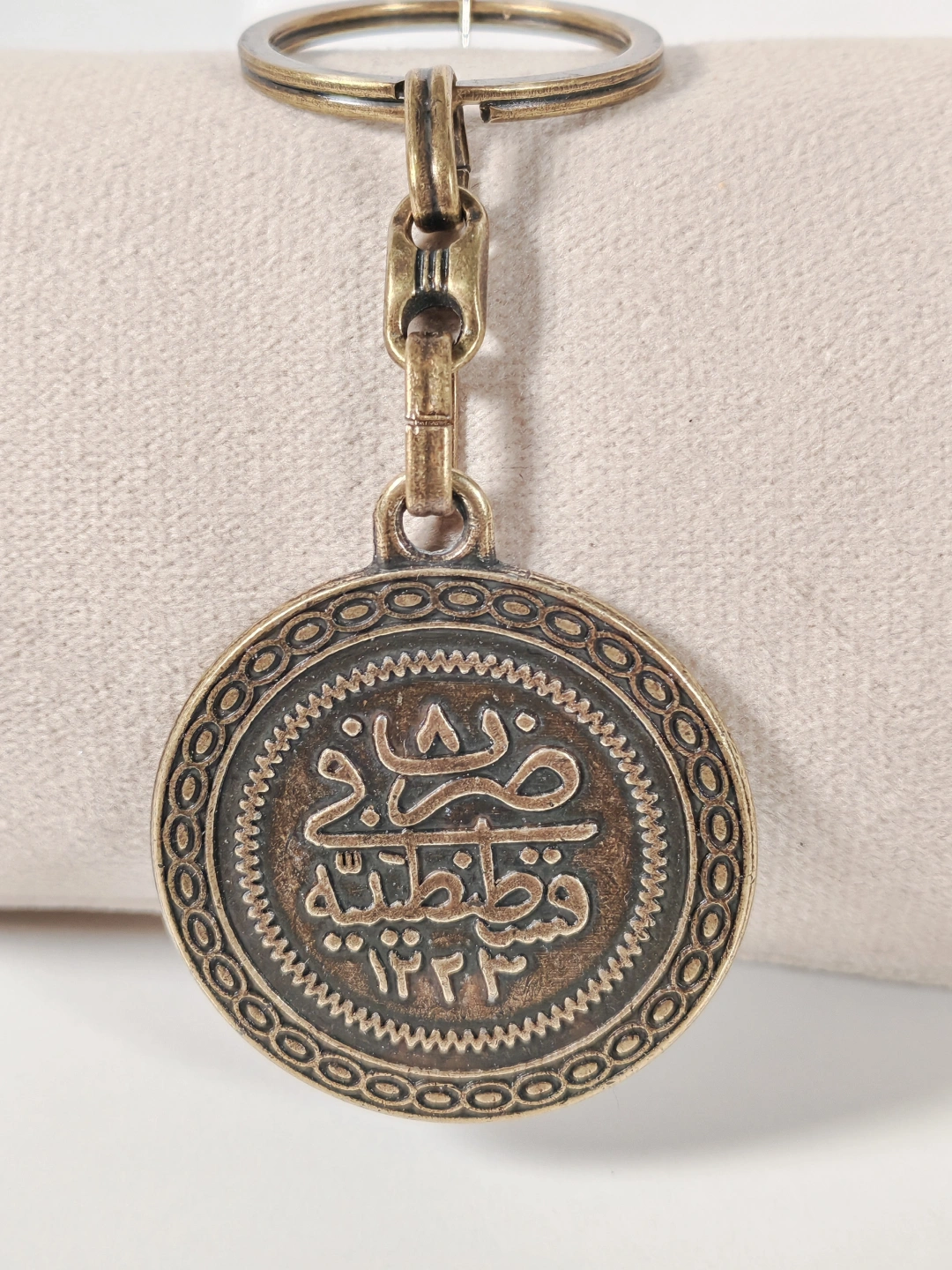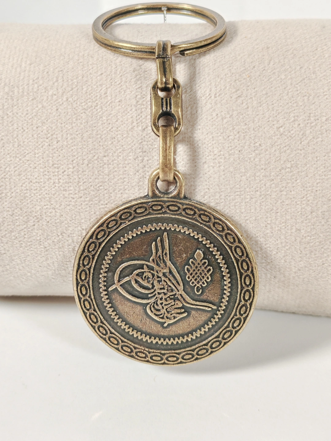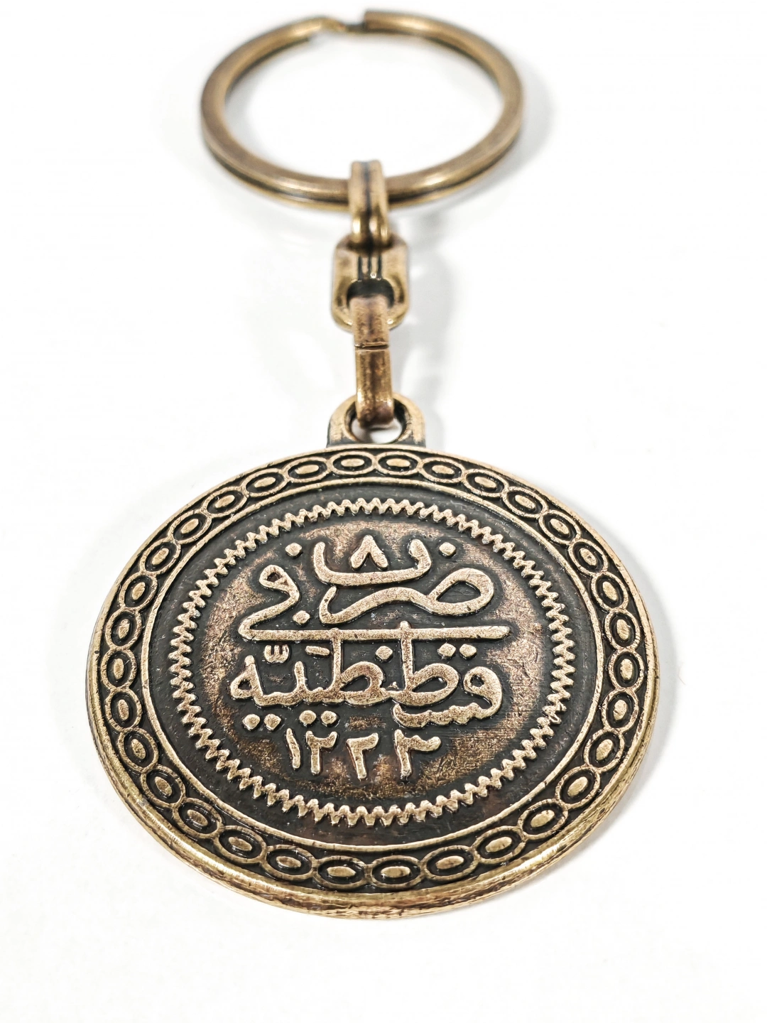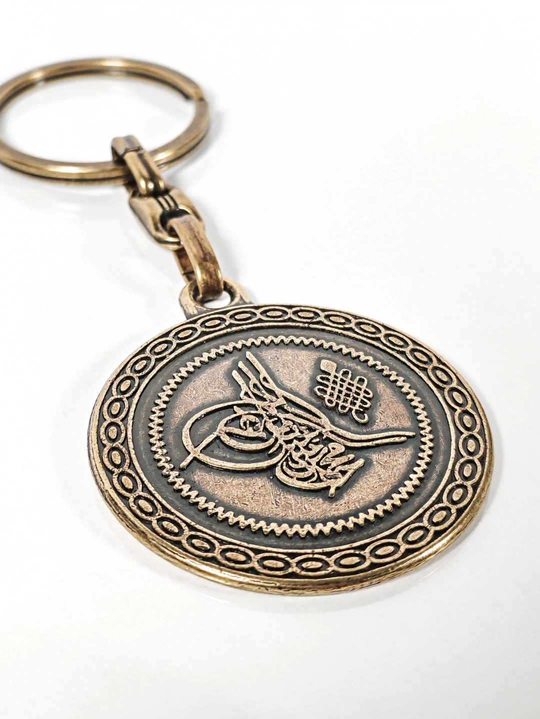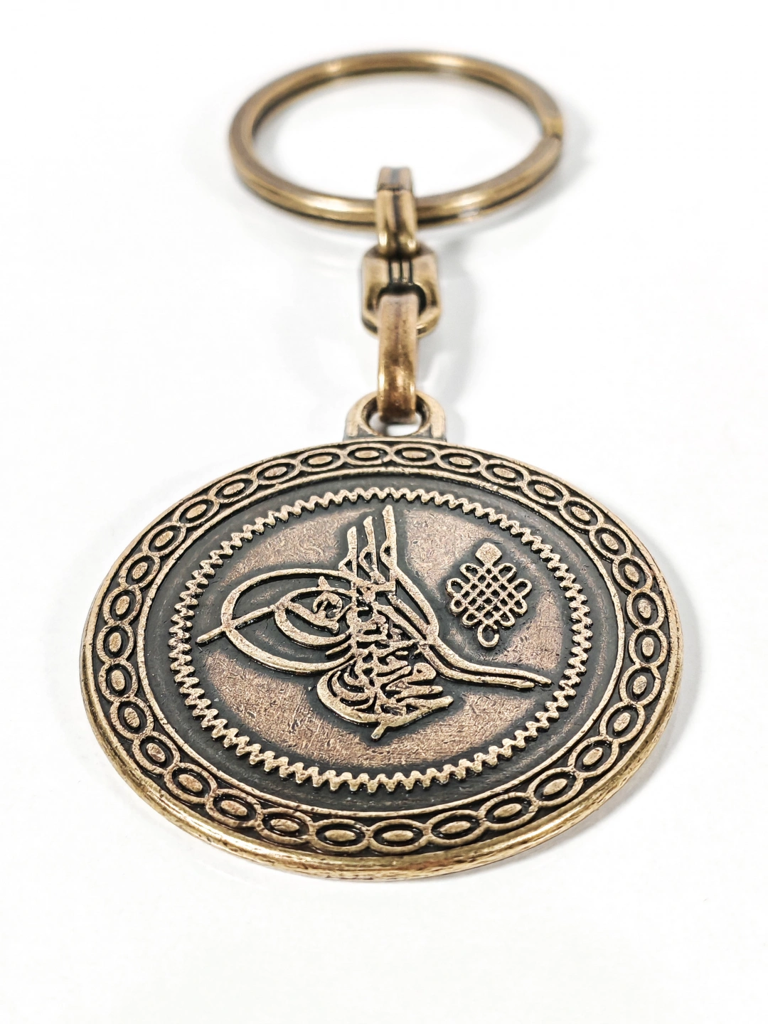 Antik bronz tonuyla tasarlanan bu çift yüzlü Osmanlı tuğralı metal anahtarlık, tarih ve maneviyatı bir arada taşımak isteyenler için özel olarak üretilmiştir. Bir yüzünde Osmanlı tuğrası, diğer yüzünde Osmanlıca hat sanatıyla işlenmiş yazı detayı yer alır. Kabartmalı yüzey dokusu ve dairesel formu anahtarlığa güçlü ve nostaljik bir karakter kazandırır.