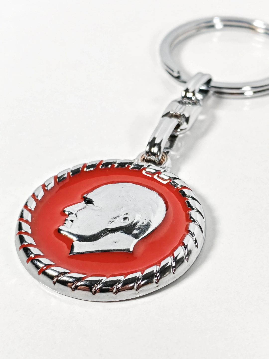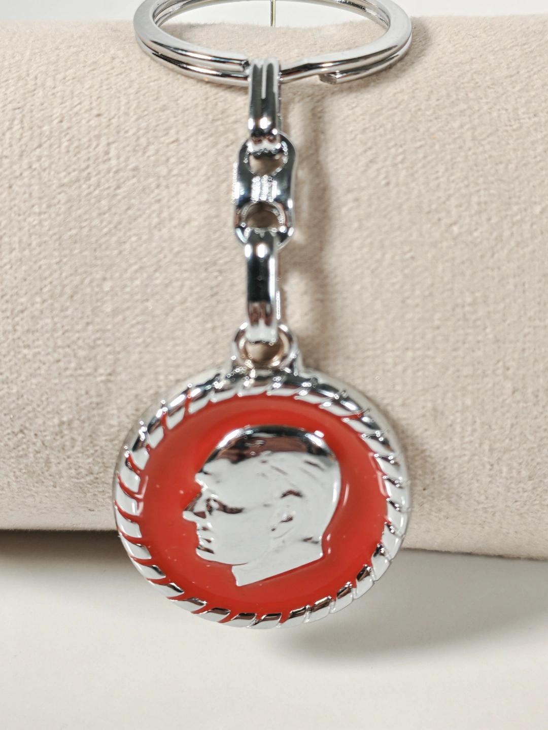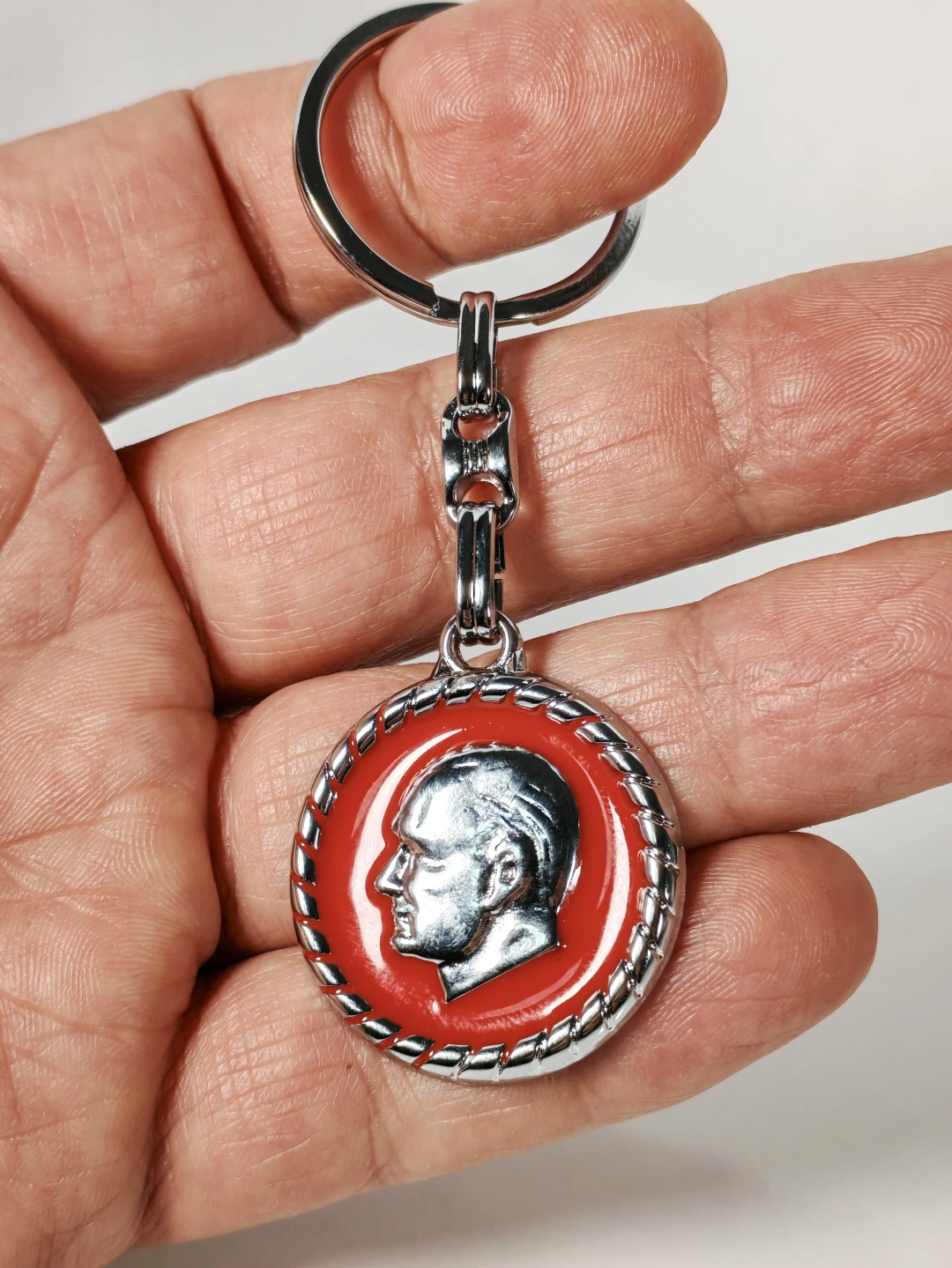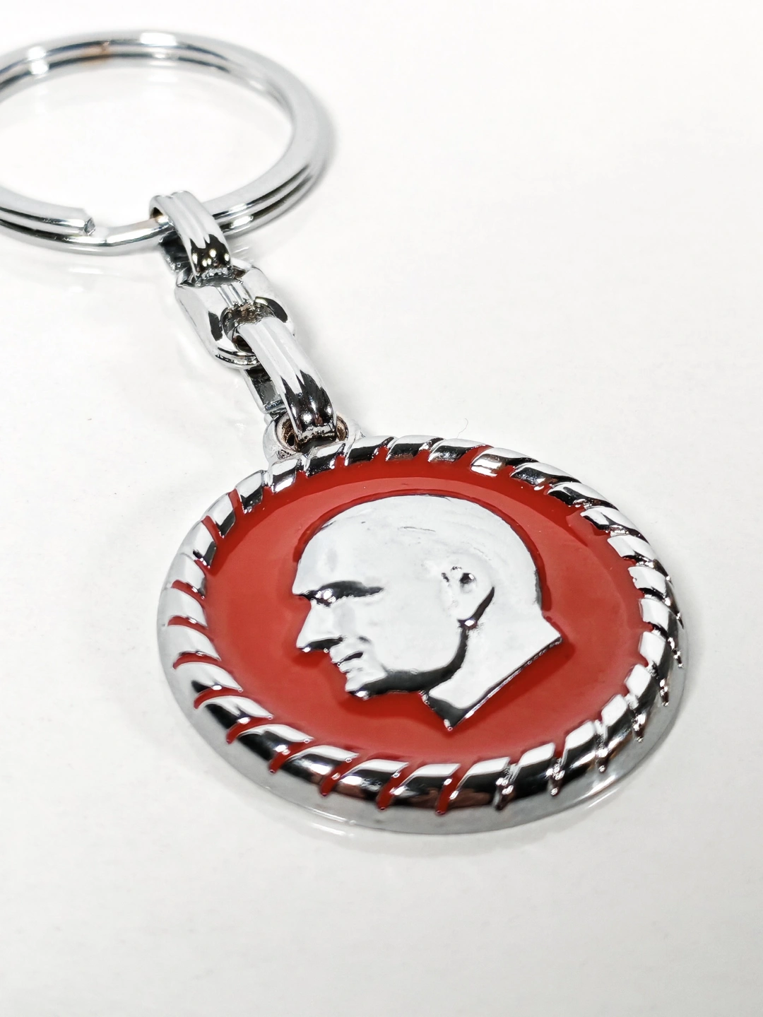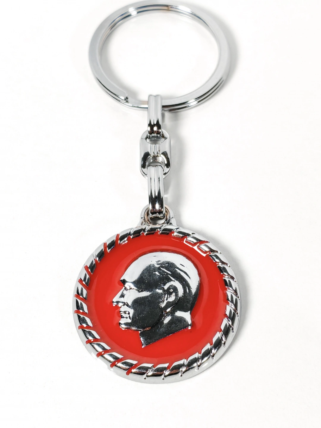 Yuvarlak formda tasarlanan bu metal anahtarlık, kırmızı zemin üzerine işlenmiş Atatürk portresiyle güçlü ve anlamlı bir duruş sergiler. Klasik hatlara sahip portre detayı, ürüne zamansız bir karakter kazandırırken sade tasarımıyla her ortamda rahatlıkla kullanılabilir.