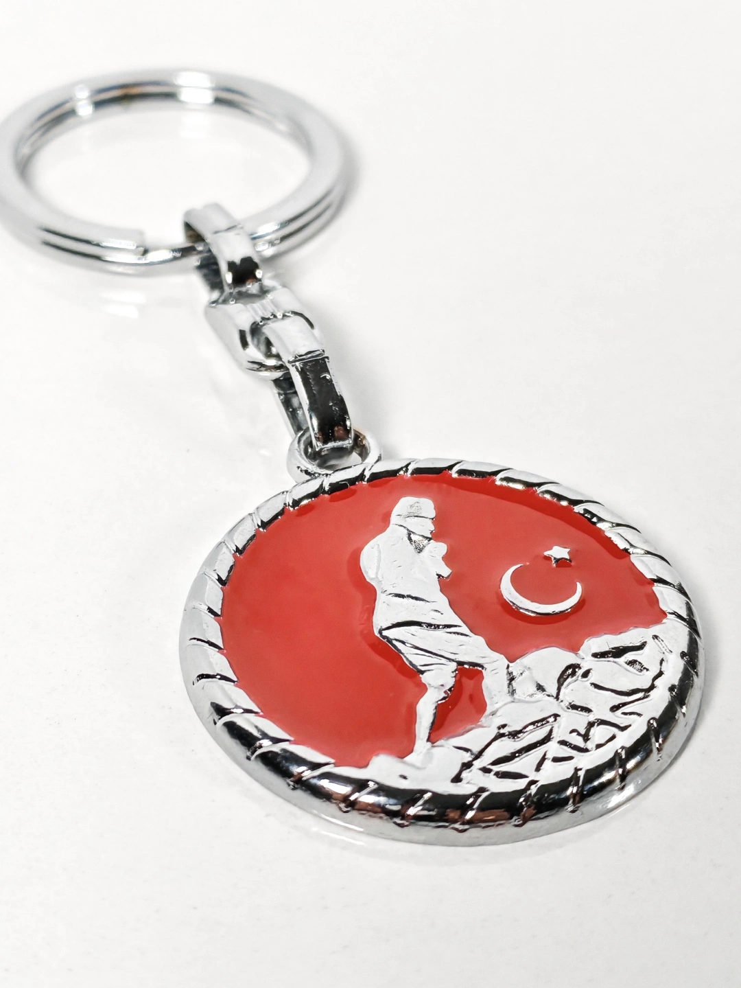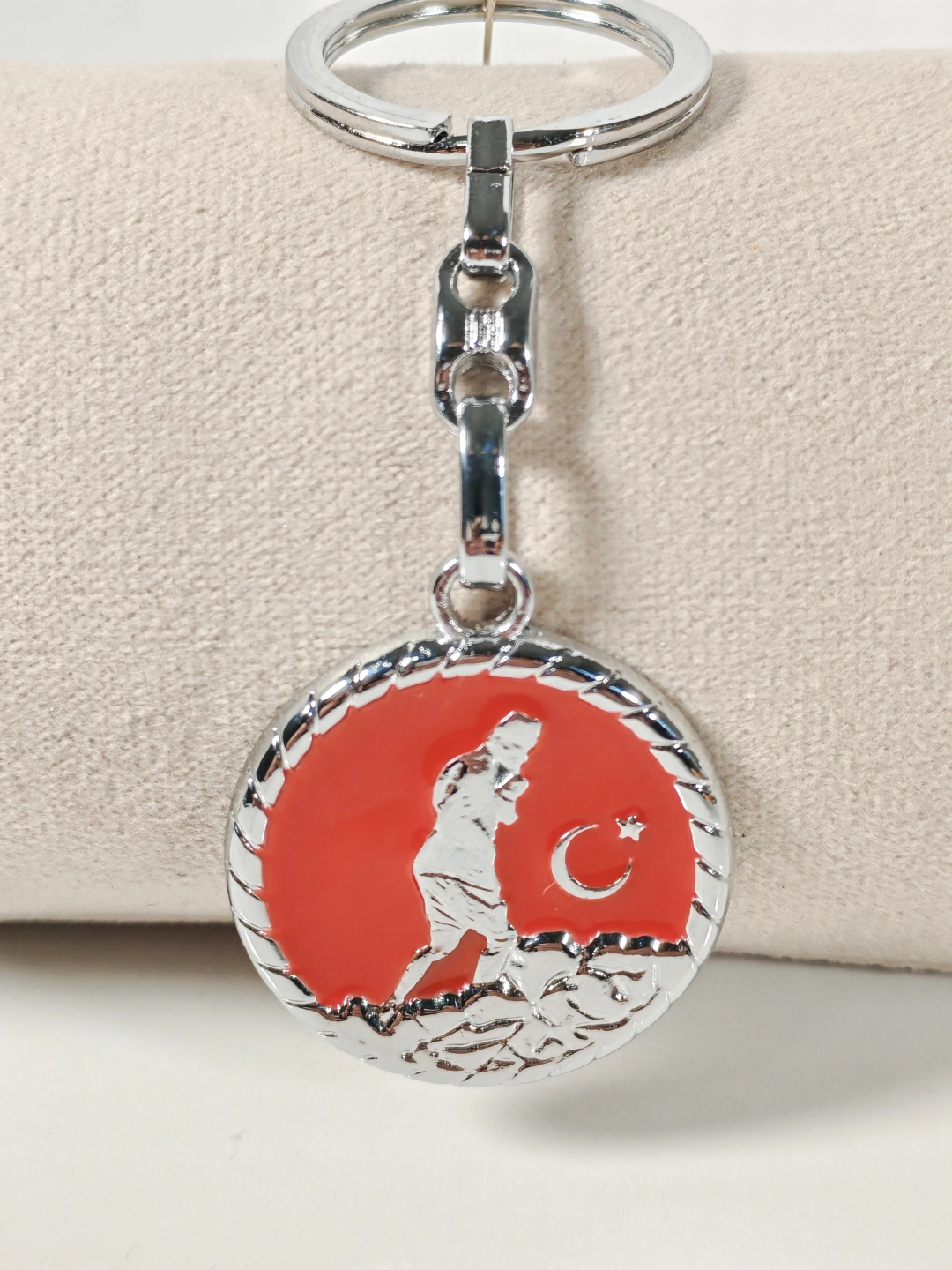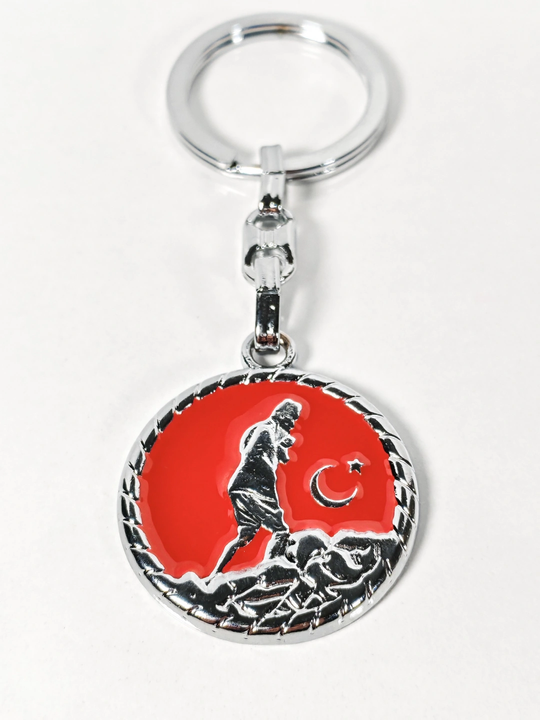 Metal malzemeden üretilmiştir. Yüzeyinde mine kaplama bulunmaz. Kabartmalı Atatürk silüeti ve ay yıldız figürü, metal dokusuyla net ve güçlü bir duruş sergiler. Sağlam anahtar halkası sayesinde anahtarlarınızı güvenle taşımanıza yardımcı olur.
