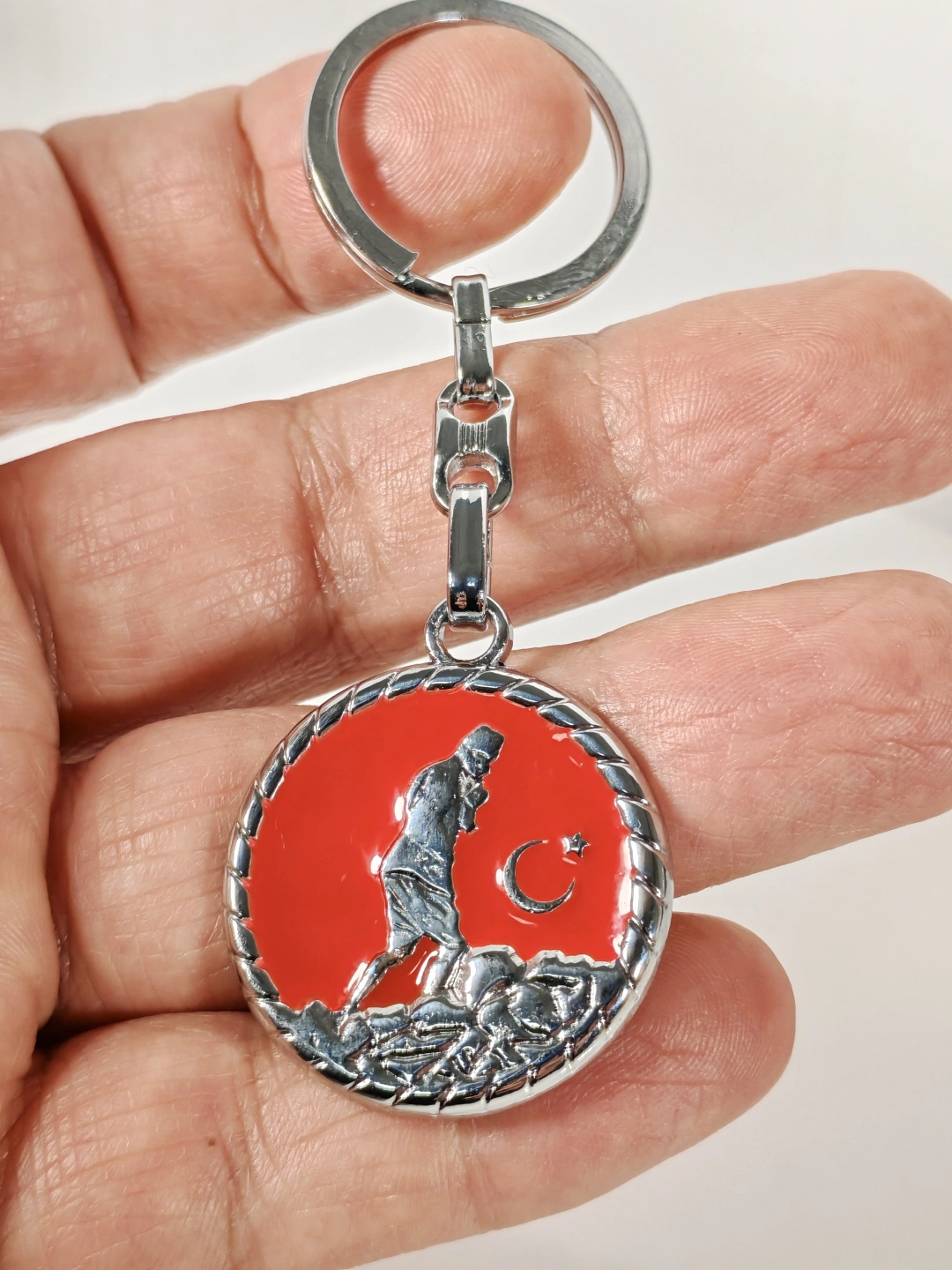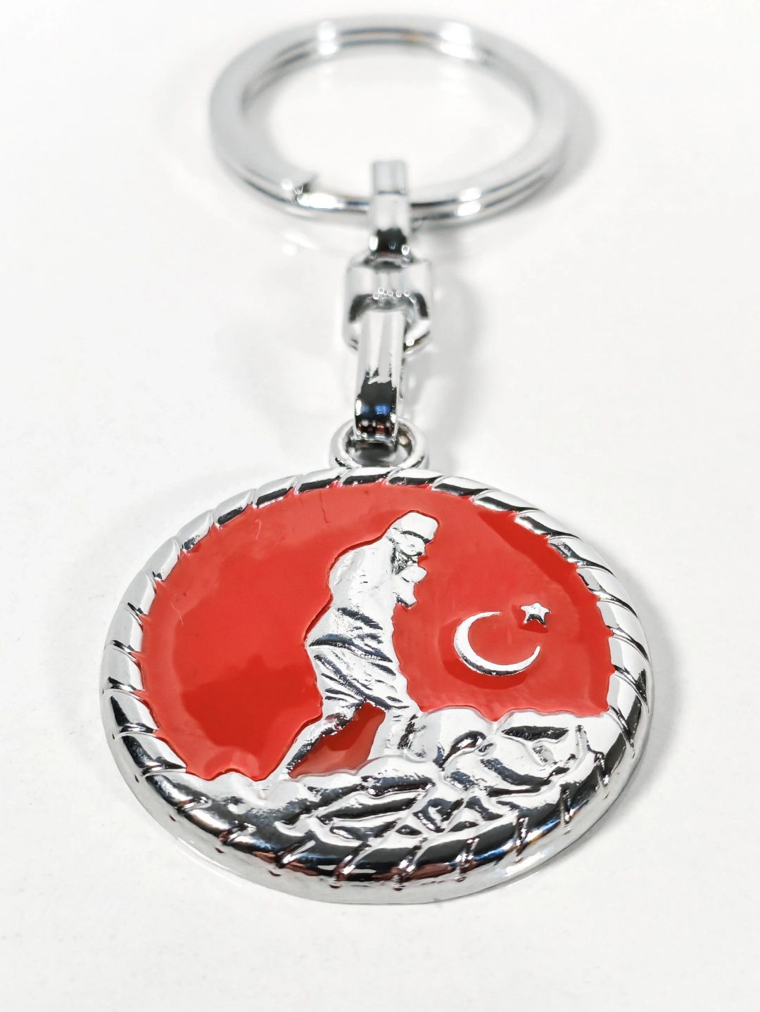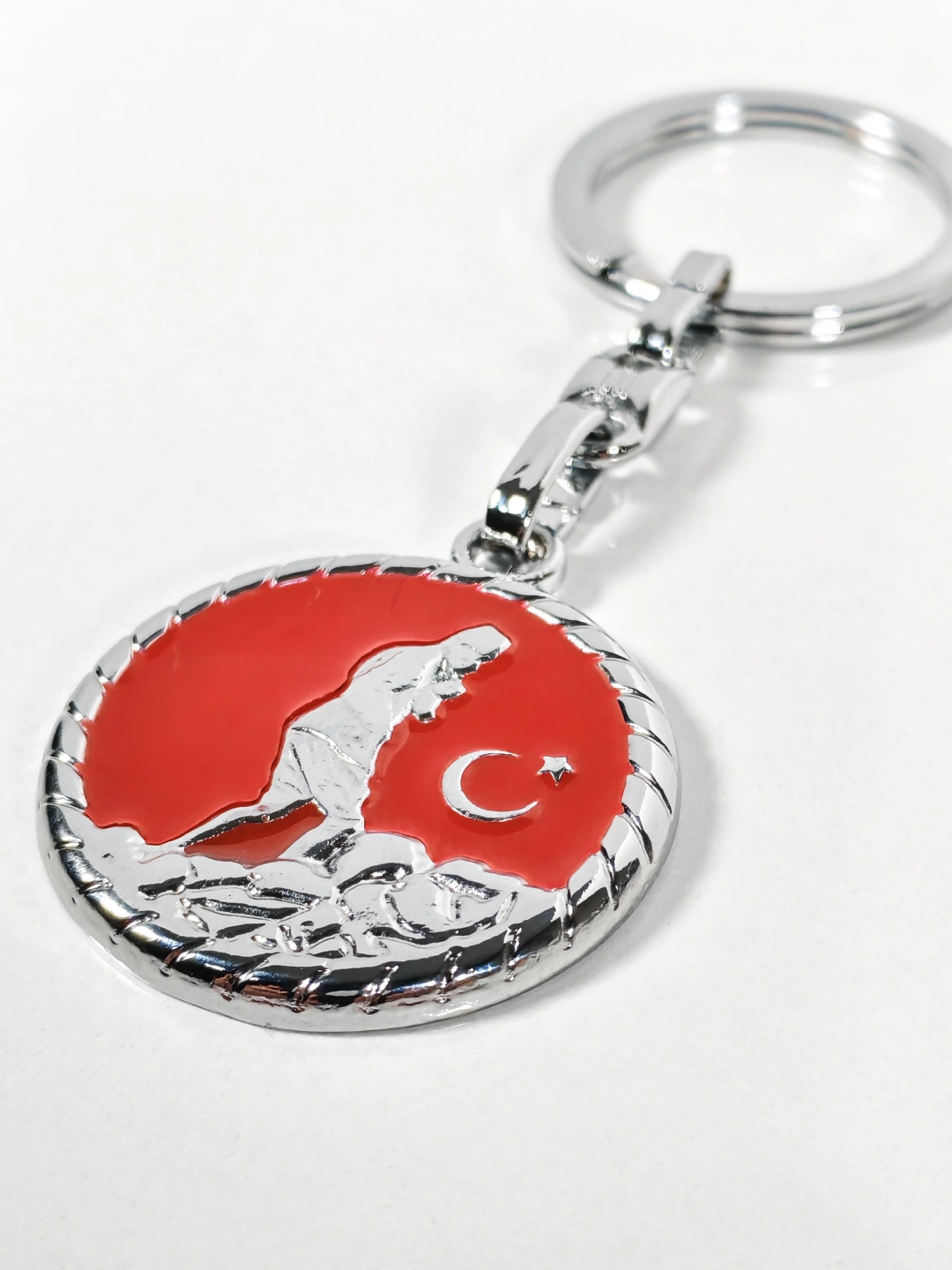 Metal malzemeden üretilmiştir. Yüzeyinde mine kaplama bulunmaz. Kabartmalı Atatürk silüeti ve ay yıldız figürü, metal dokusuyla net ve güçlü bir duruş sergiler. Sağlam anahtar halkası sayesinde anahtarlarınızı güvenle taşımanıza yardımcı olur.