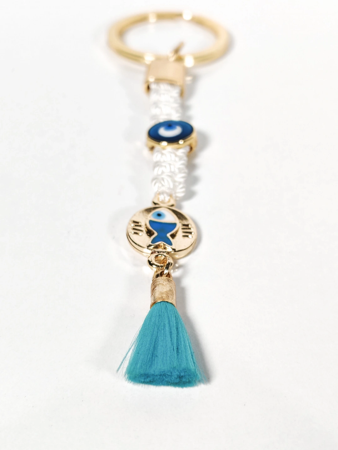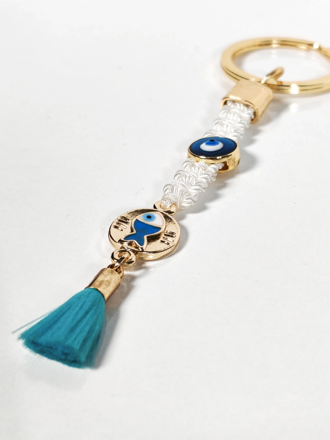 Beyaz örgü ip detayı, nazar boncuğu figürleri ve balık sembolüyle tasarlanan bu anahtarlık; sade şıklığı, geleneksel anlamlarla buluşturan özel bir aksesuardır. Altın tonlu metal halka ve bağlantı parçaları, ürüne zarif bir görünüm kazandırırken beyaz ipin sadeliği ile turkuaz püskülün canlılığı dengeli ve estetik bir bütün oluşturur. Günlük kullanımda hem şık hem de anlamlı bir tamamlayıcıdır.