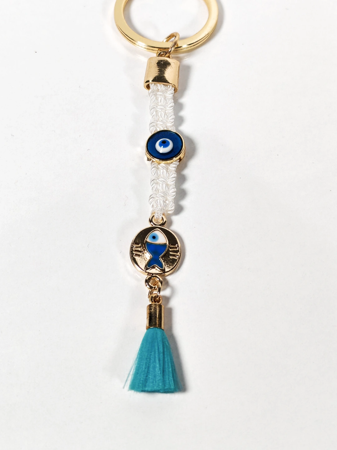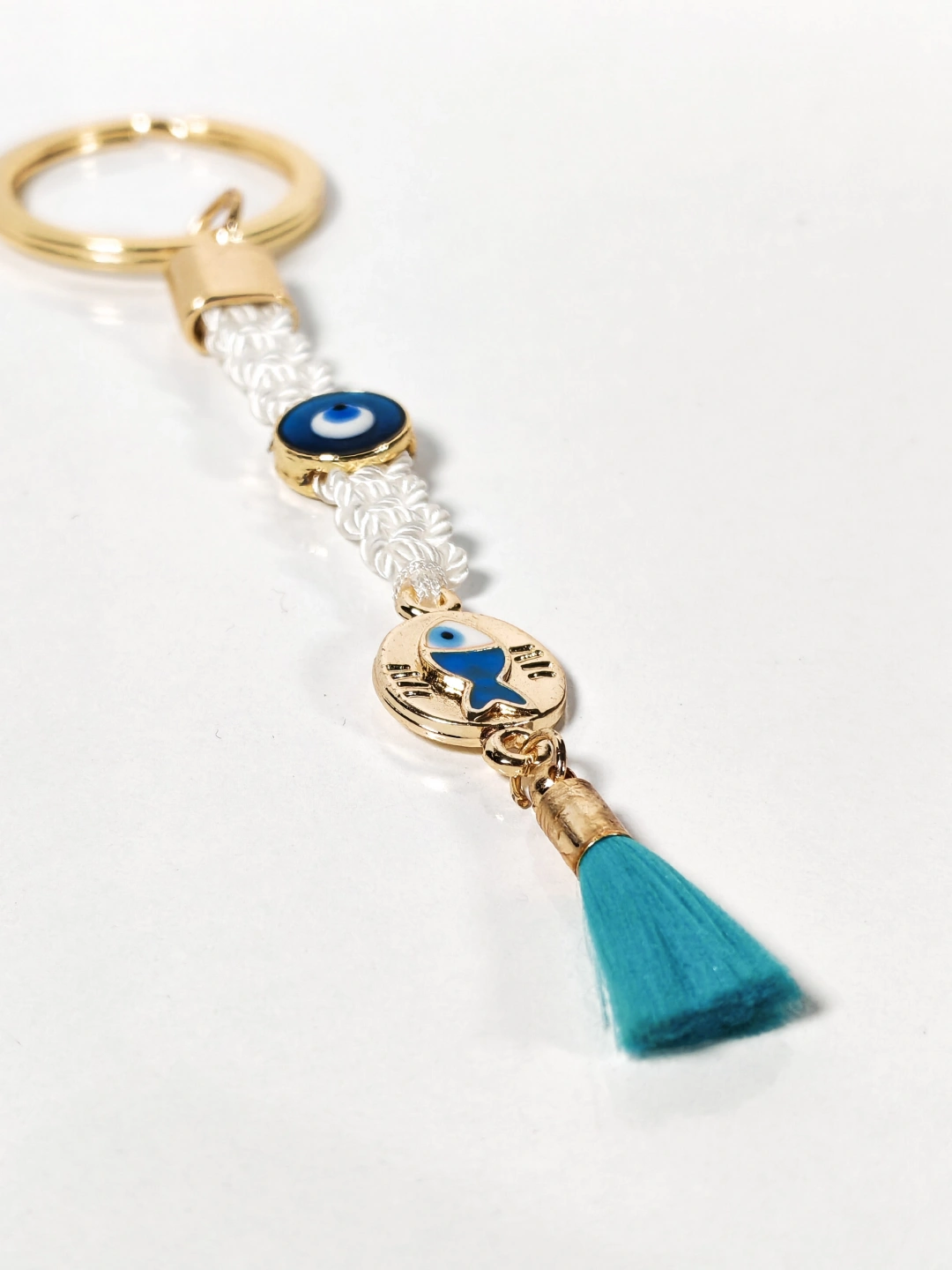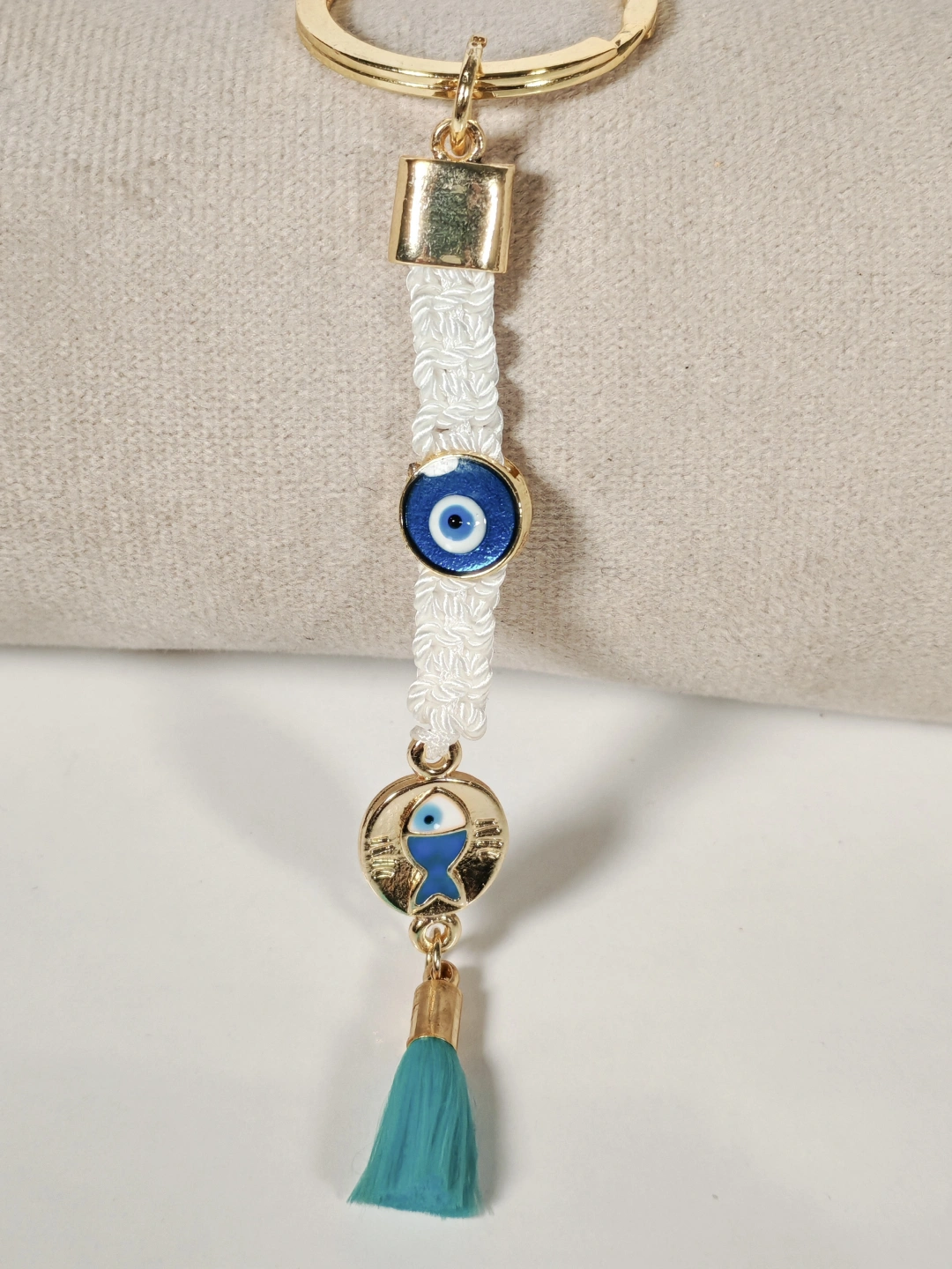 Beyaz Örgü İpli Nazar Boncuğu ve Balık Figürlü Püsküllü Anahtarlık – Zarif, Anlamlı ve Şık Tasarım