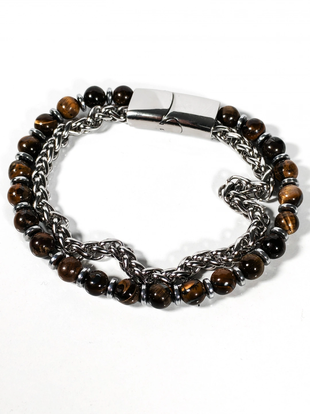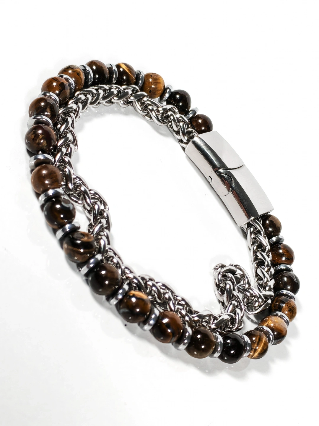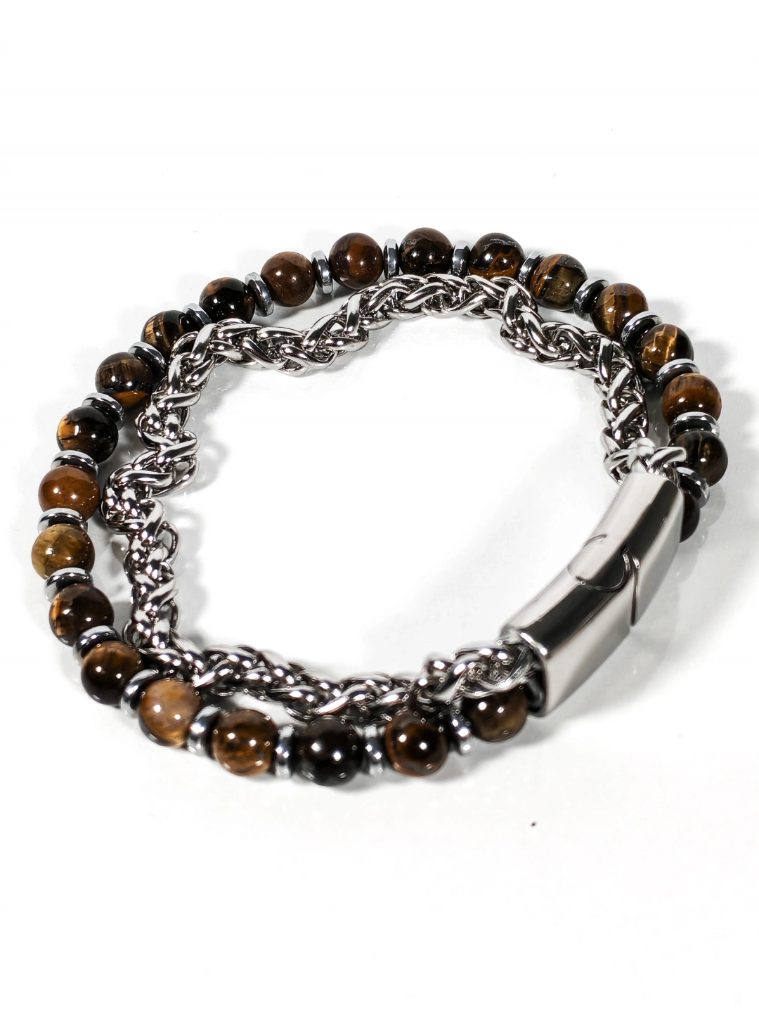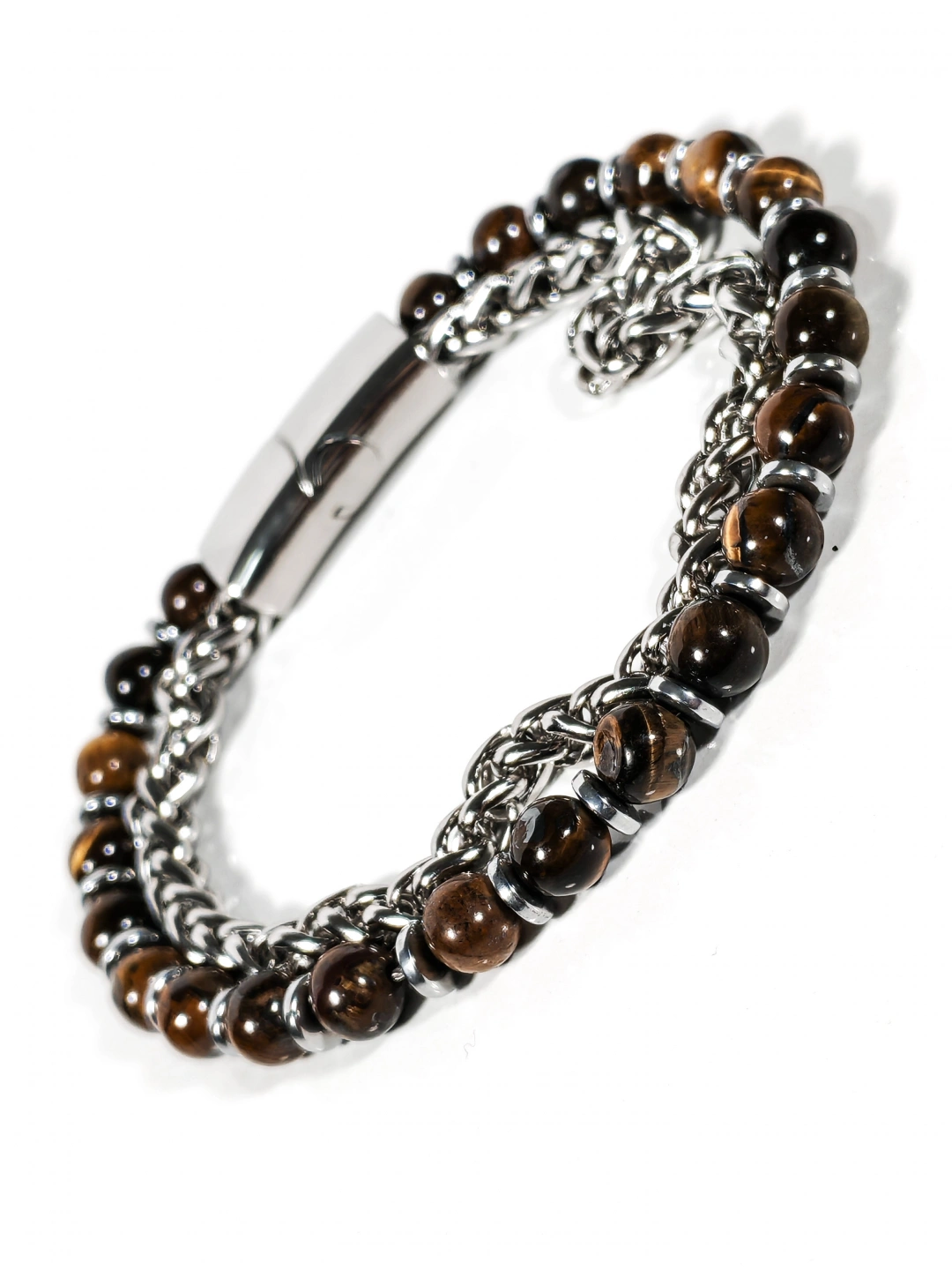 Parlak çelik zincir yapısı ile doğal taşların güçlü enerjisini bir araya getiren bu özel bileklik, maskülen ve iddialı bir stil sunar. Paslanmaz çelik zincirin sağlam ve parlak dokusu, kaplan gözü taşlarının sıcak kahverengi tonları ve hematit taşlarının metalik ışıltısıyla dengelenerek bilekte güçlü ve kararlı bir duruş oluşturur. Zincir ve taşların birlikte kullanıldığı tasarım, klasik ile moderni aynı çizgide buluşturur.