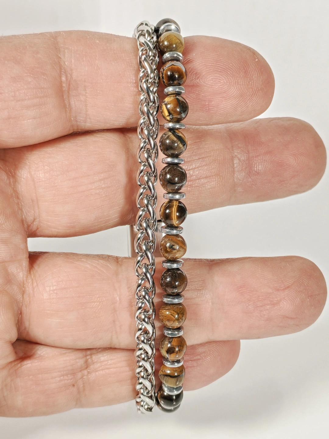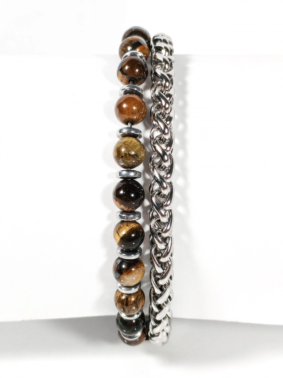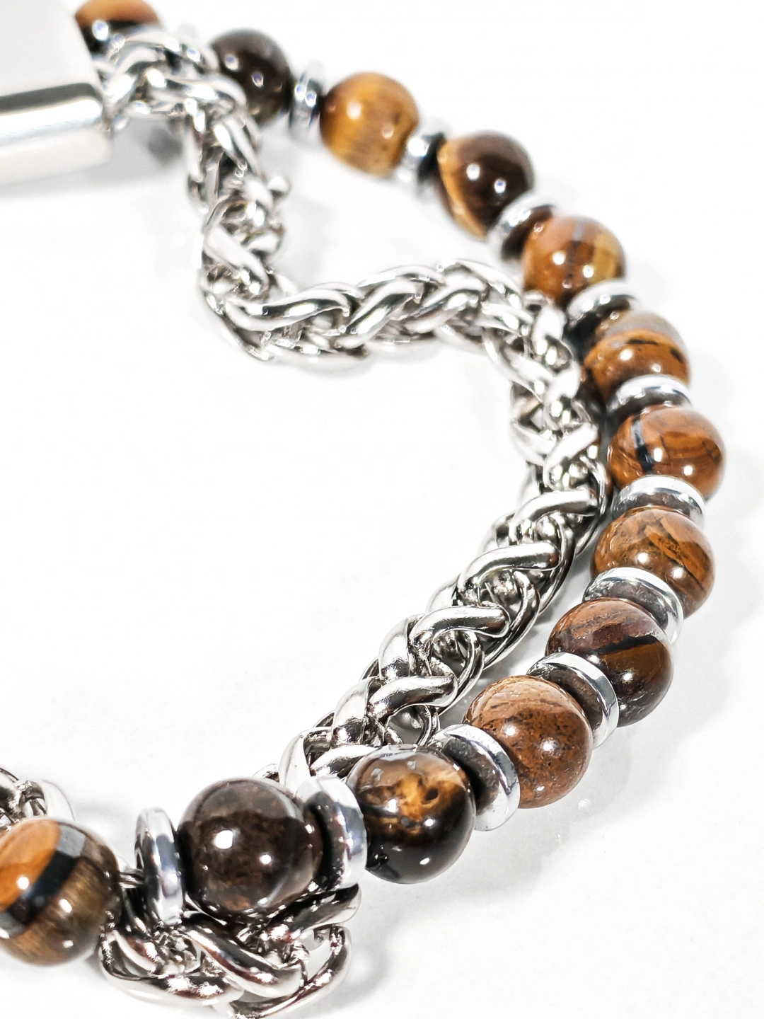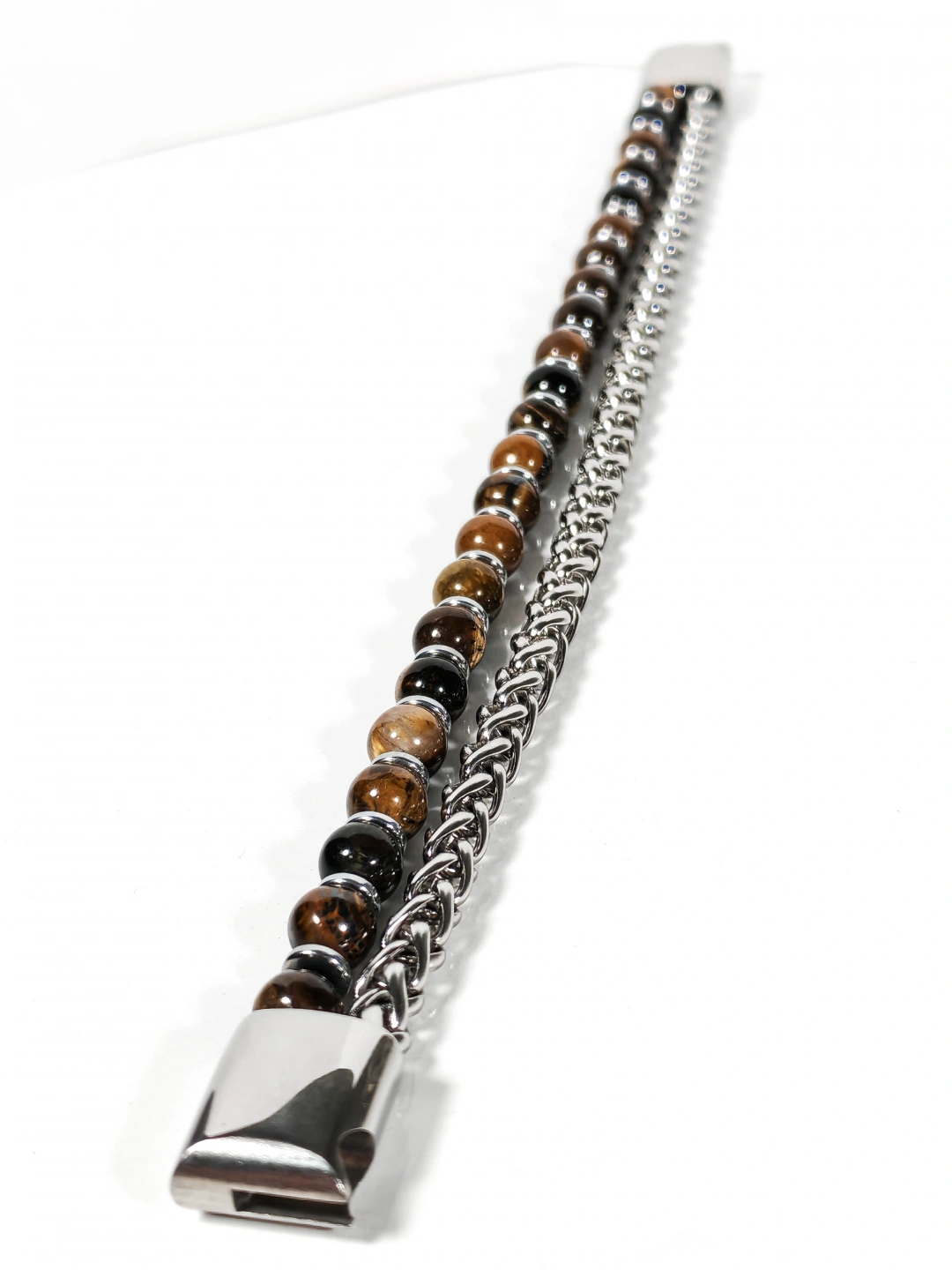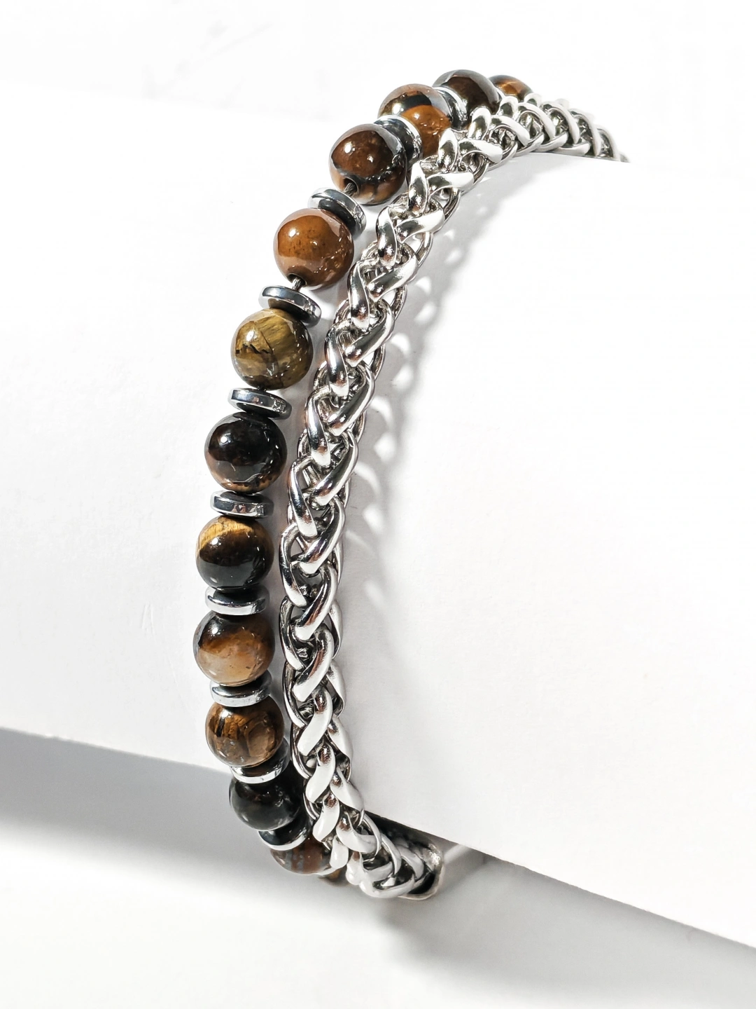 Parlak çelik zincir yapısı ile doğal taşların güçlü enerjisini bir araya getiren bu özel bileklik, maskülen ve iddialı bir stil sunar. Paslanmaz çelik zincirin sağlam ve parlak dokusu, kaplan gözü taşlarının sıcak kahverengi tonları ve hematit taşlarının metalik ışıltısıyla dengelenerek bilekte güçlü ve kararlı bir duruş oluşturur. Zincir ve taşların birlikte kullanıldığı tasarım, klasik ile moderni aynı çizgide buluşturur.