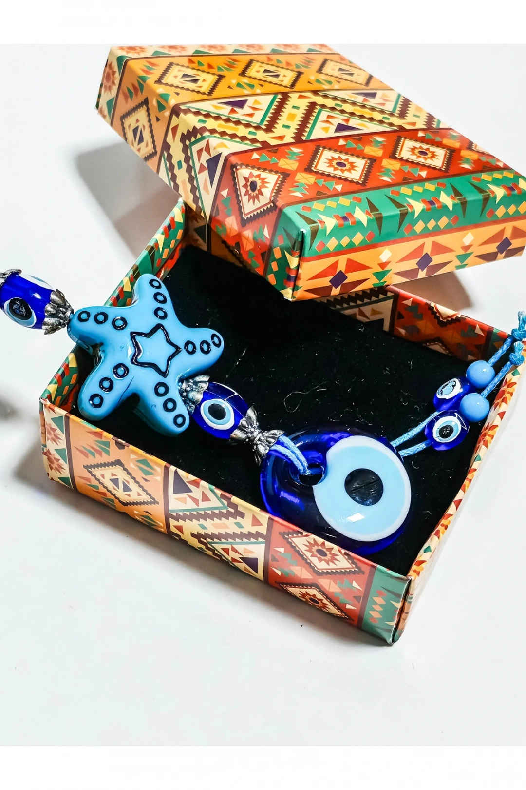 Deniz yıldızının özgürlüğü ve cam nazar boncuğunun koruyucu enerjisi, bu özel anahtarlıkta zarif bir uyumla buluşuyor. El işçiliği cam detayları ve deniz temalı tasarımıyla hem ruhunuza hem stilinize iyi gelecek bir aksesuar.