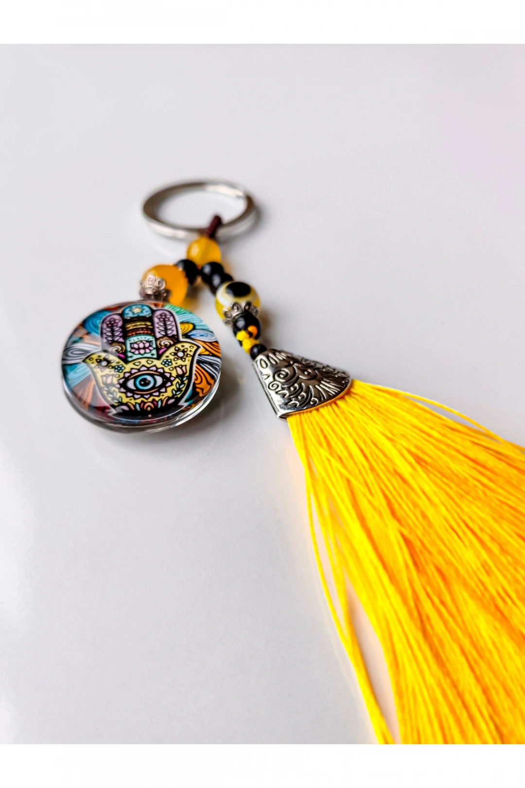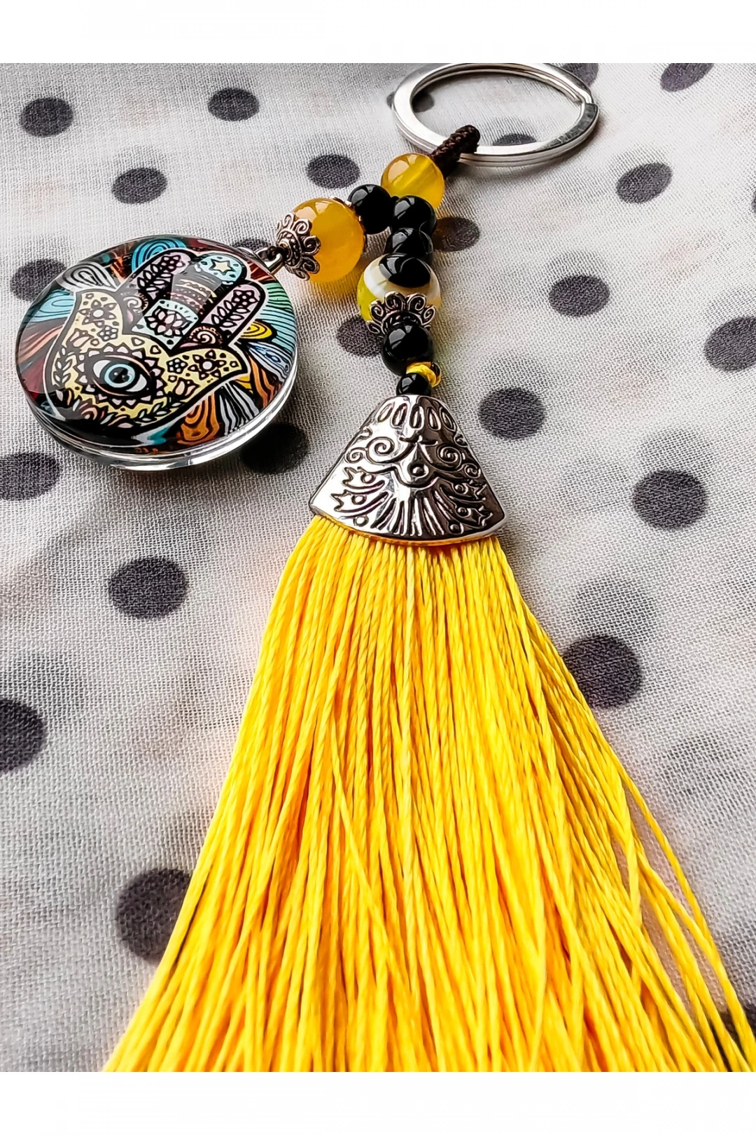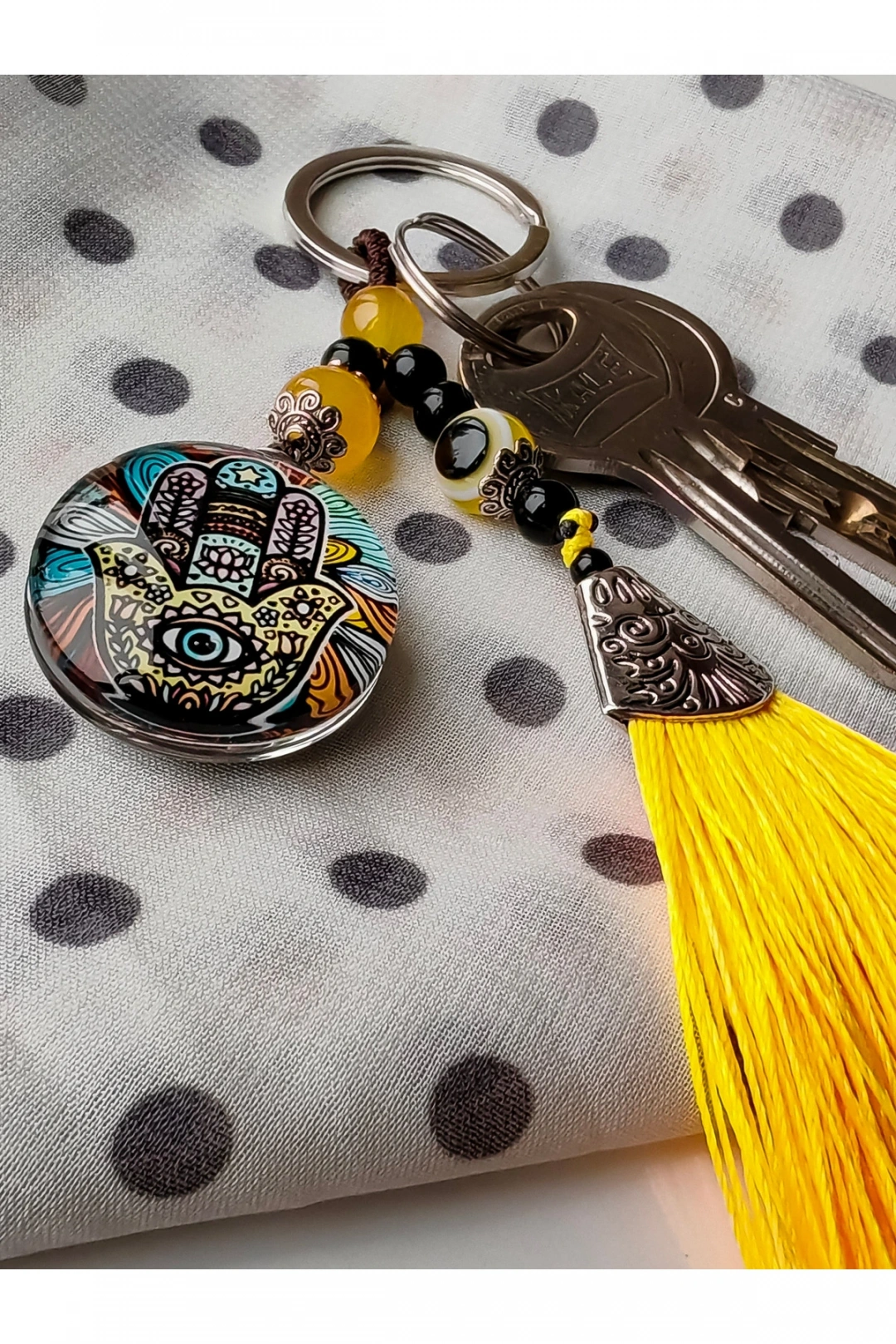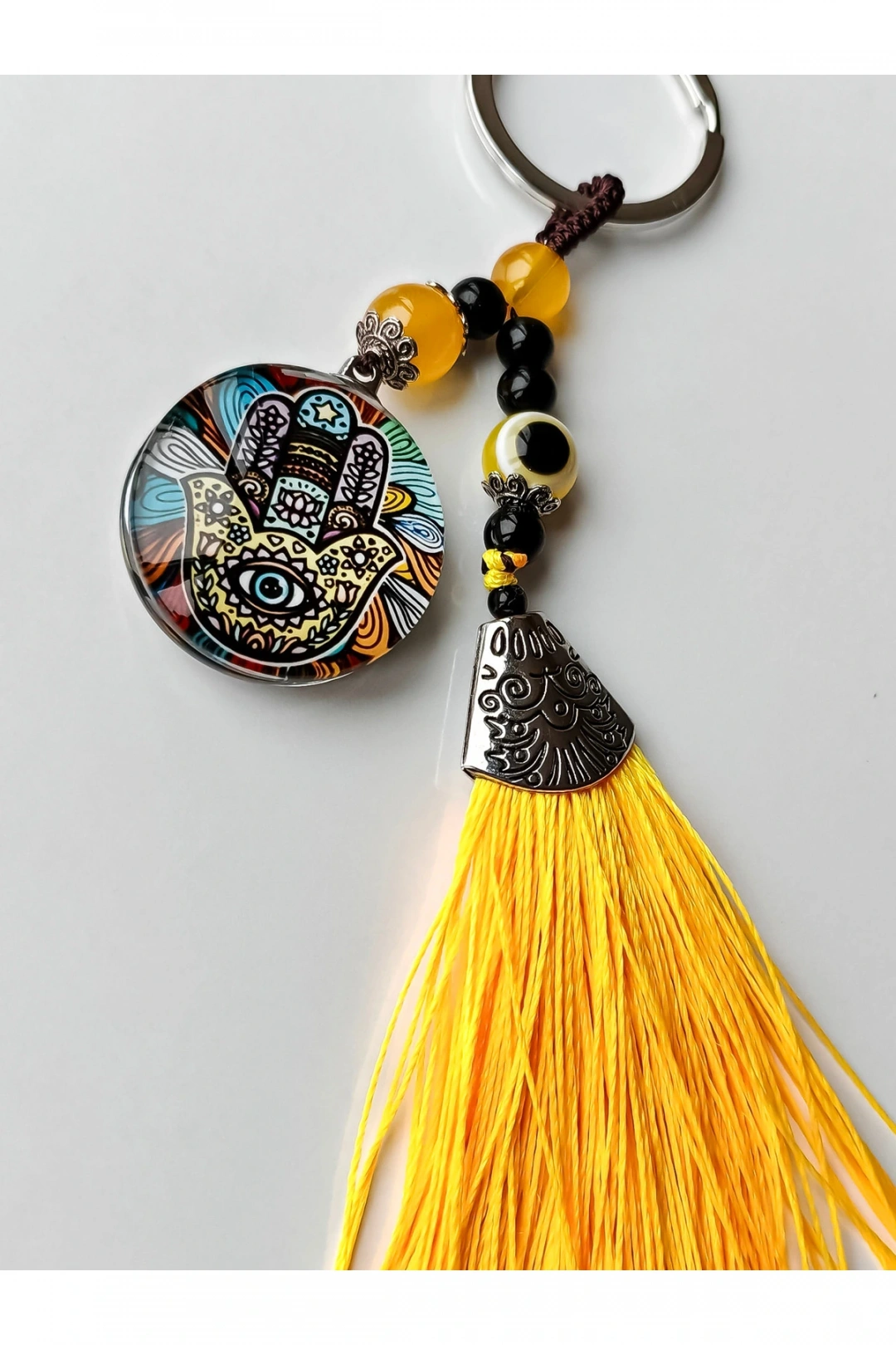 Fatımanın Eli Cam Boncuklu ve Sarı Püsküllü Anahtarlık.
