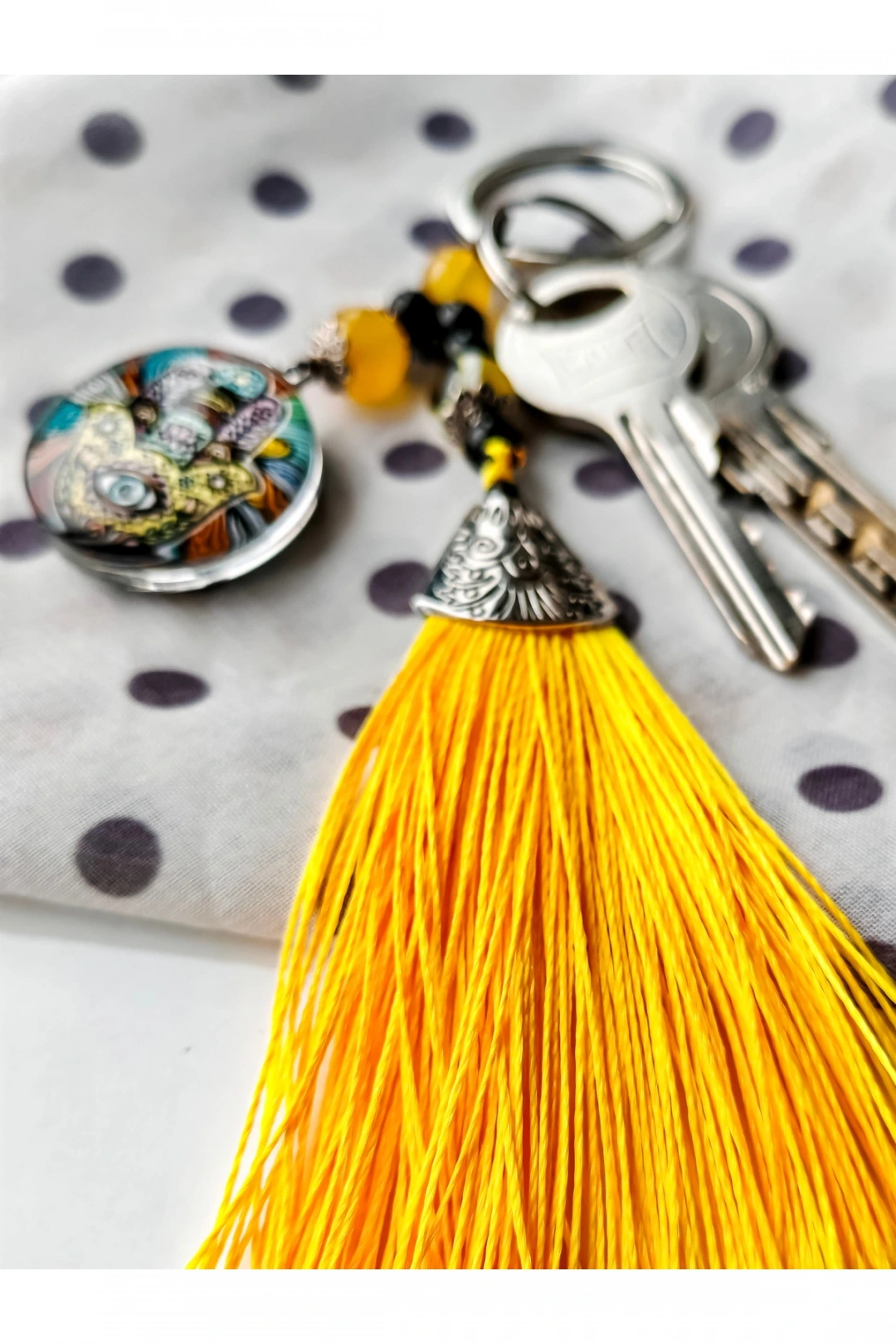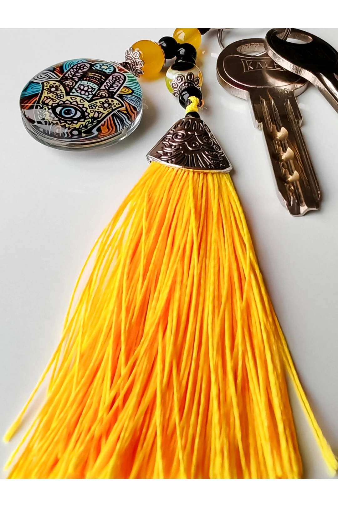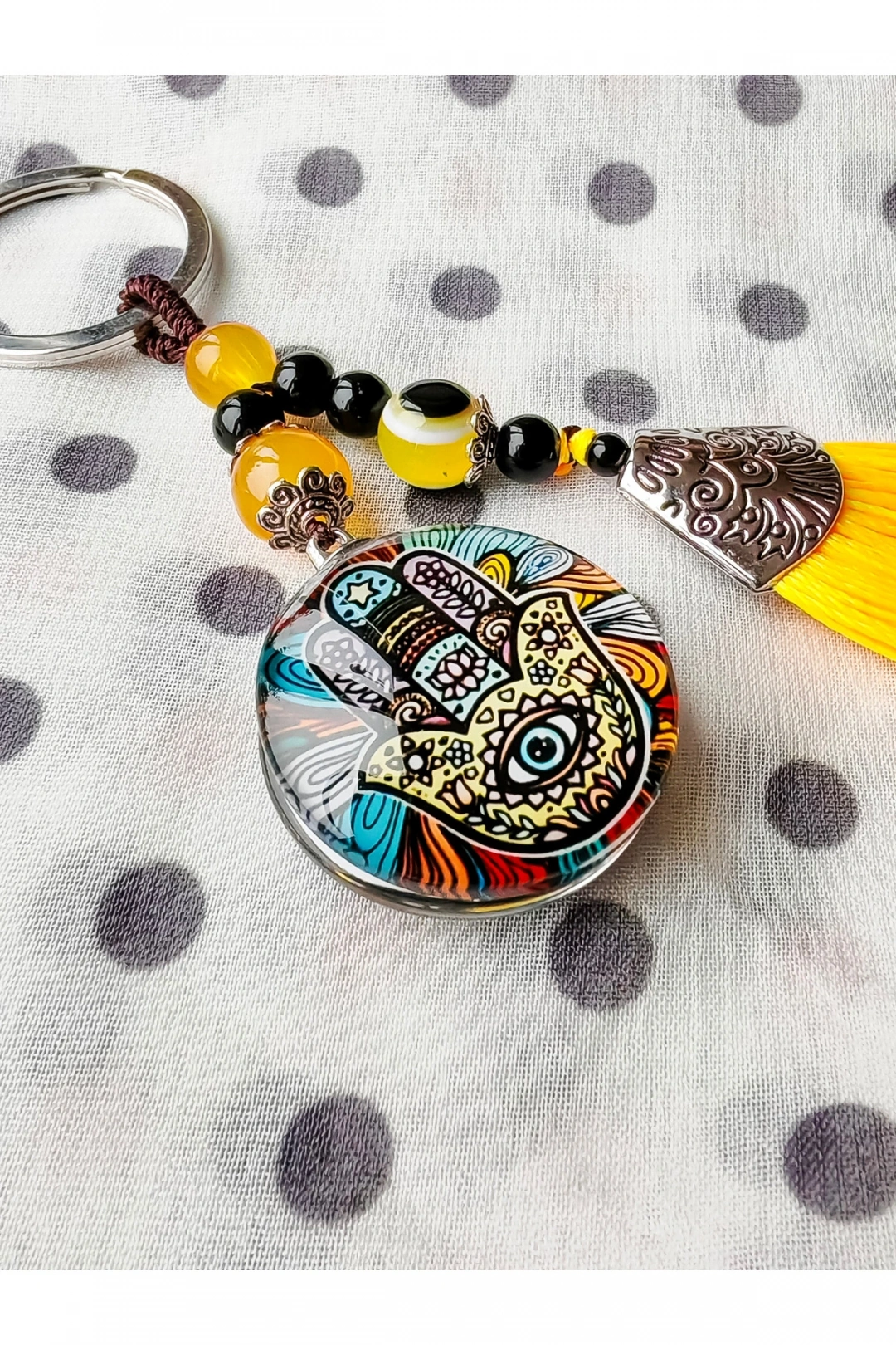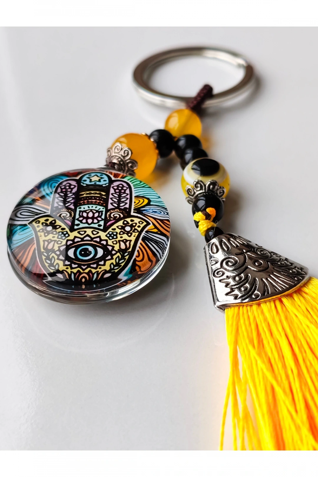 Fatımanın Eli Cam Boncuklu ve Sarı Püsküllü Anahtarlık.