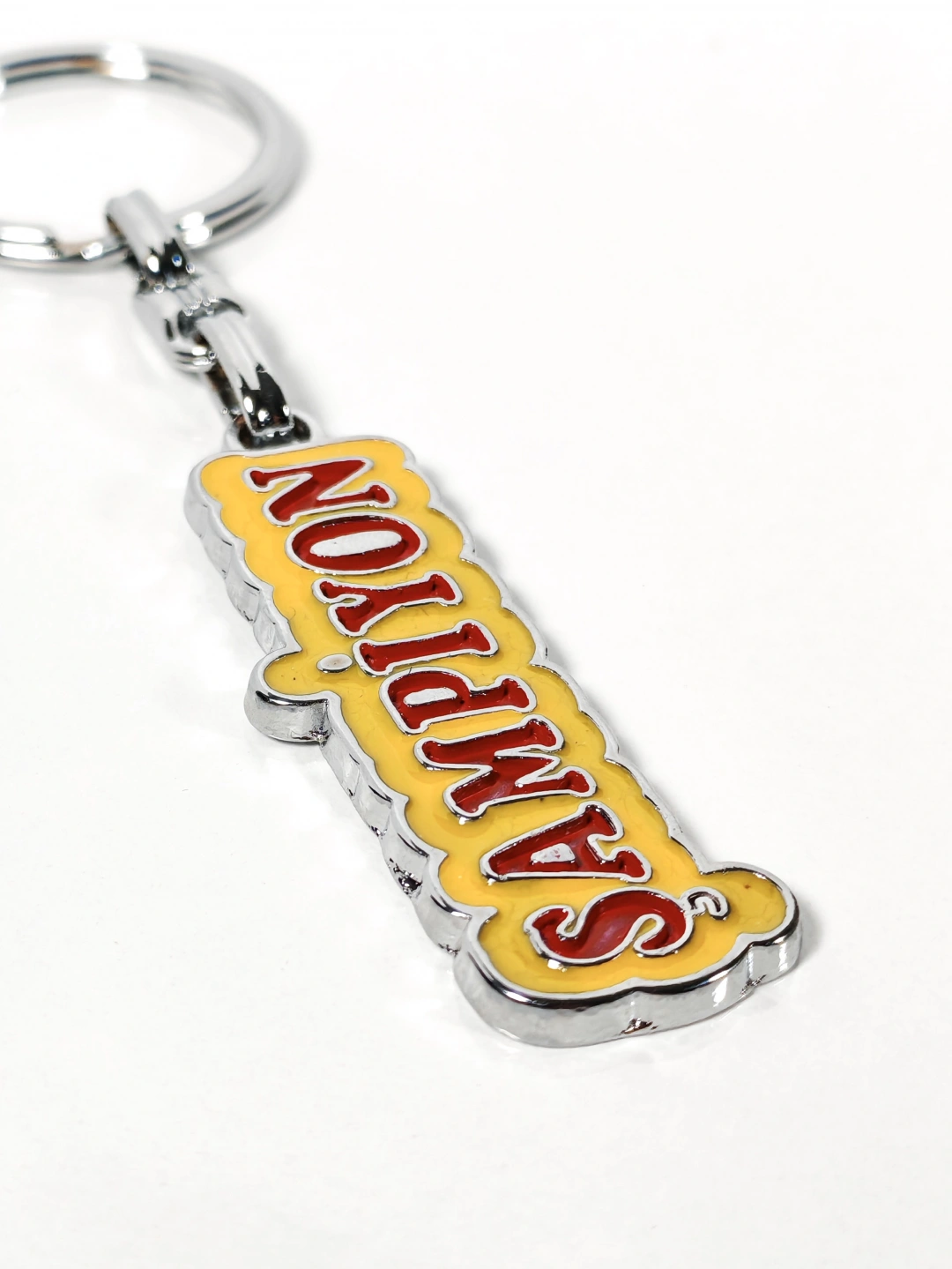 Şampiyon Yazılı Sarı Kırmızı Metal Anahtarlık – Enerjik Tasarım ve Güçlü Duruşun Eğlenceli İfadesi