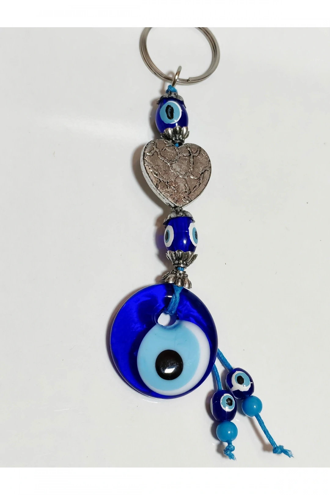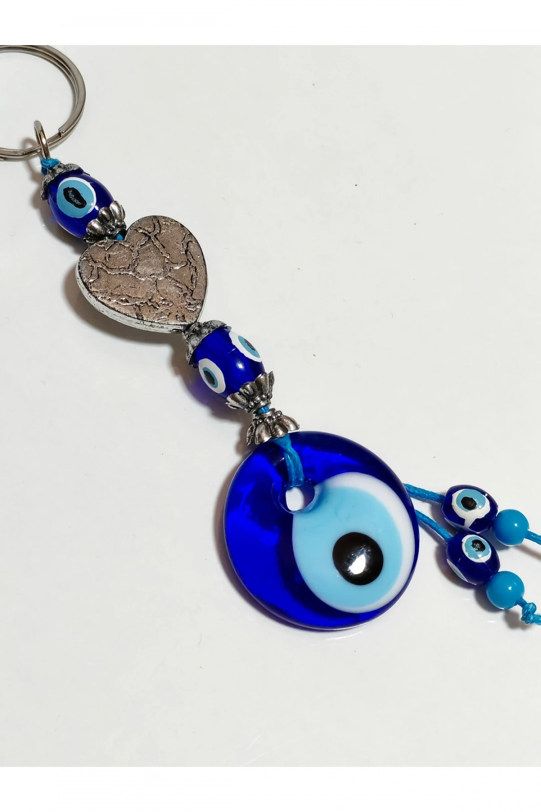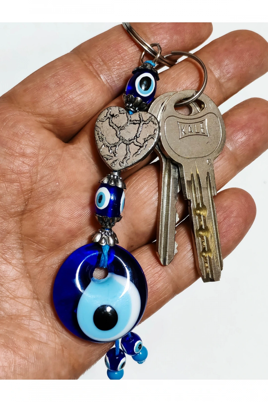 Gümüş Renkli Kalp ve Mavi Cam Nazar Boncuklu Anahtarlık – Sevgi ve Koruma Yanınızda