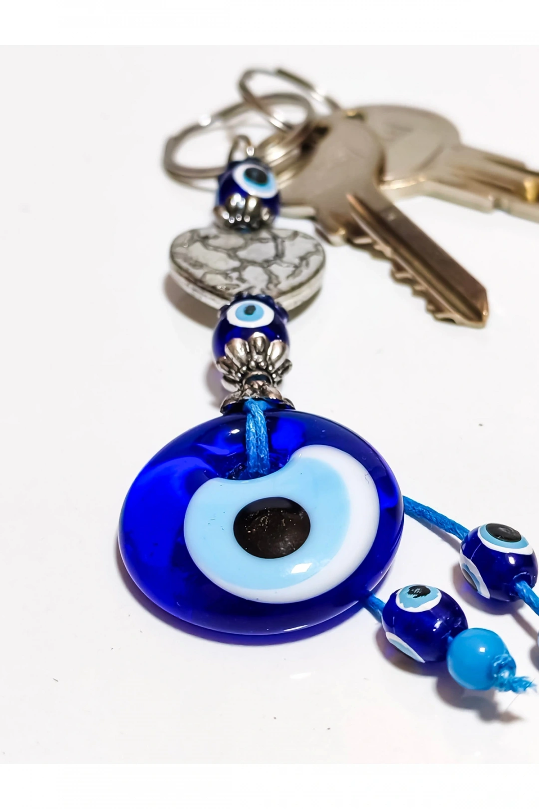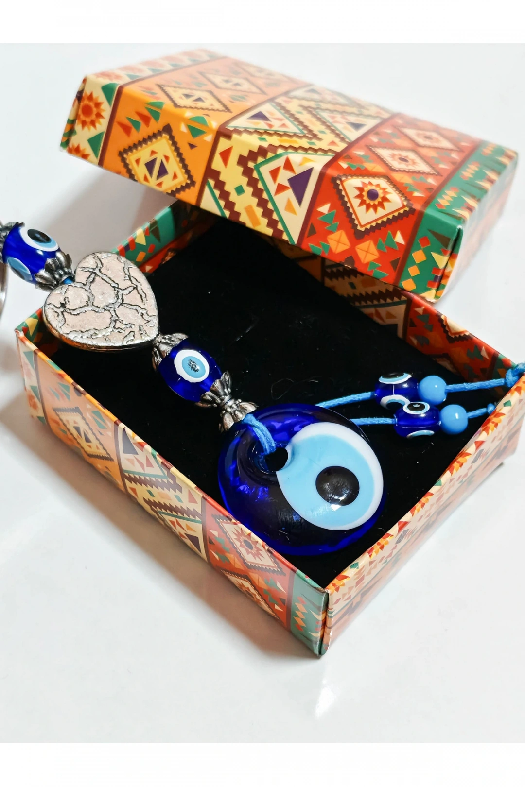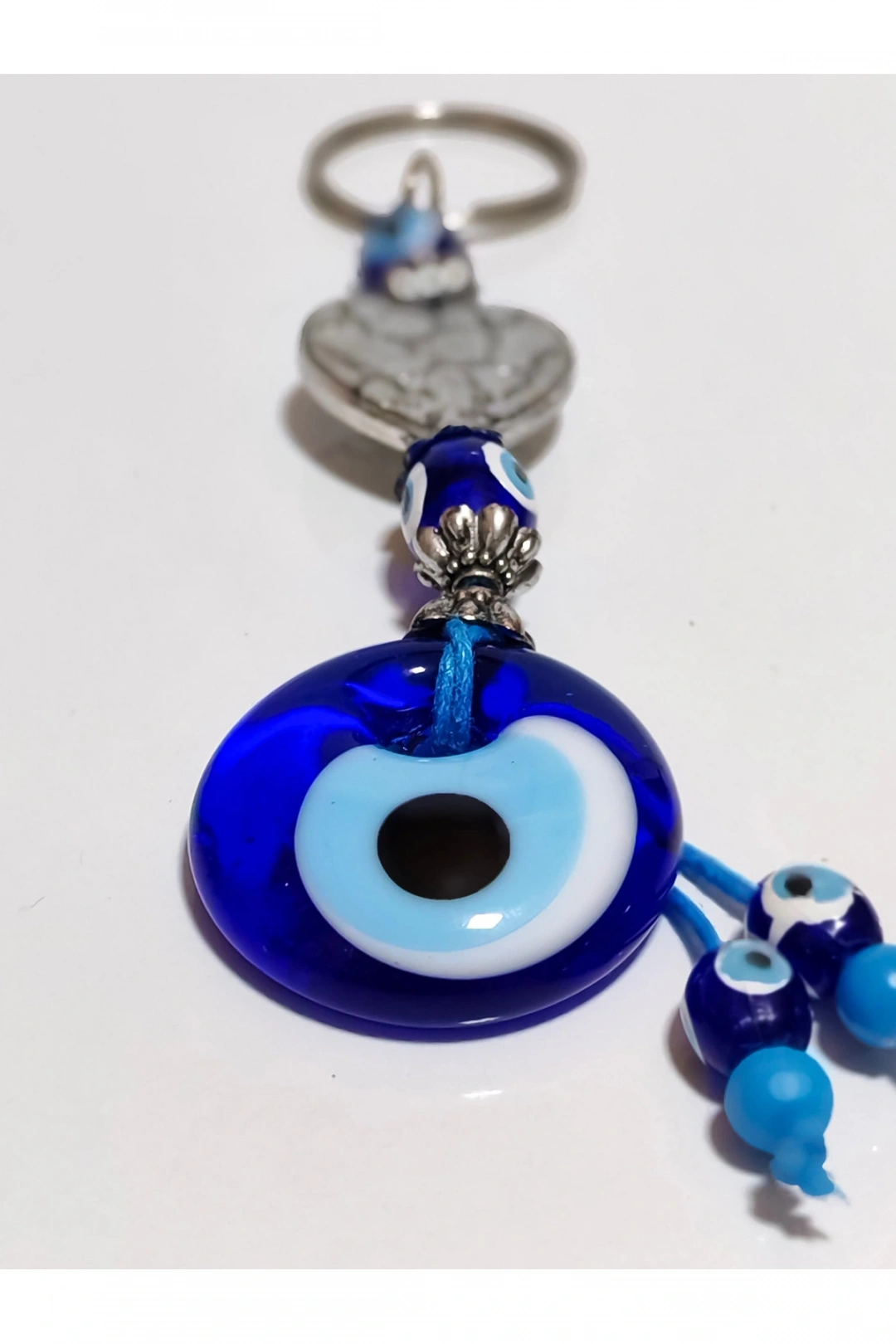 Gümüş Renkli Kalp ve Mavi Cam Nazar Boncuklu Anahtarlık – Sevgi ve Koruma Yanınızda
