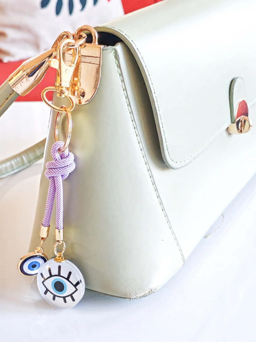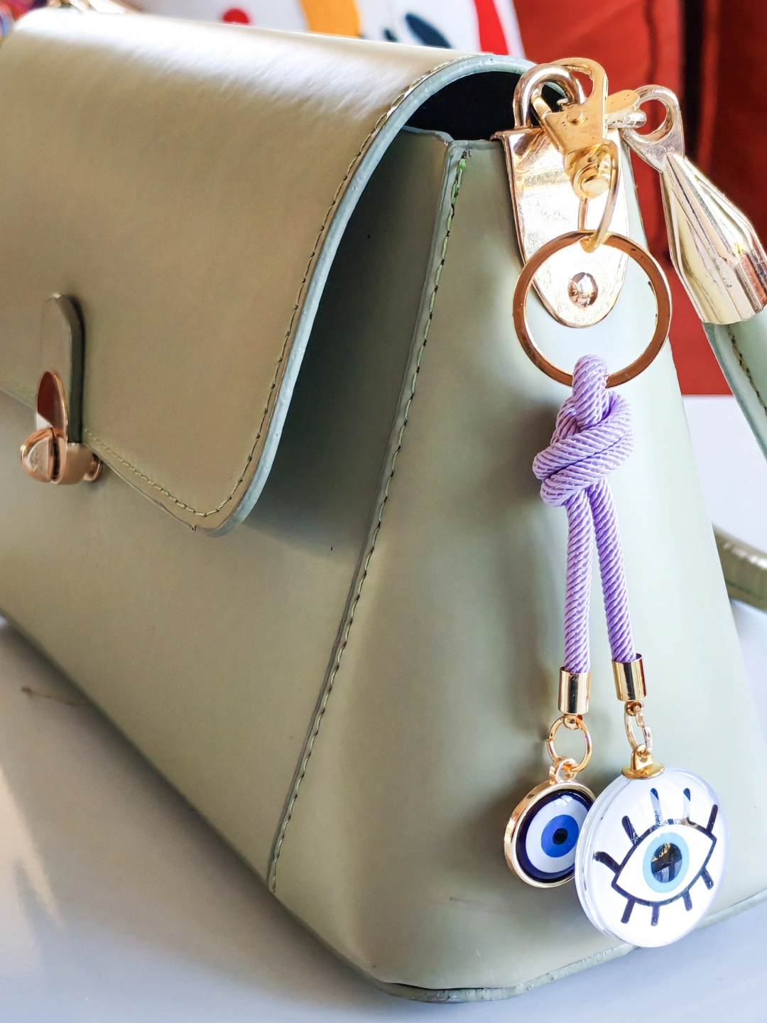 İpli yapısı ve hafif tasarımı sayesinde çantaya kolayca takılır ve günlük kullanımda konfor sağlar. Beyaz tonların sade şıklığı, nazar boncuğu detayının anlamlı sembolizmiyle birleşerek çanta üzerinde zarif ama dikkat çekici bir aksesuar oluşturur. Günlük, casual ve yaz kombinleriyle uyumlu bir tamamlayıcıdır.