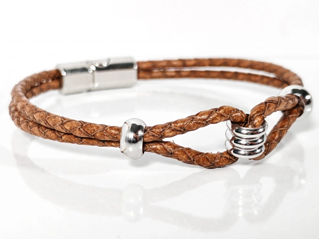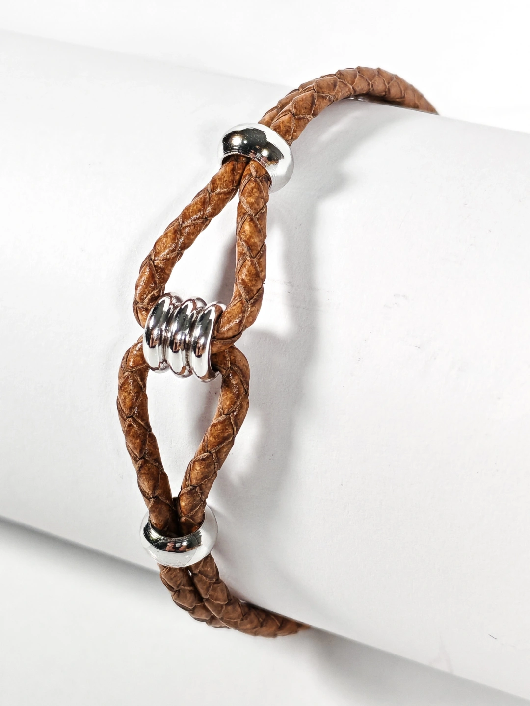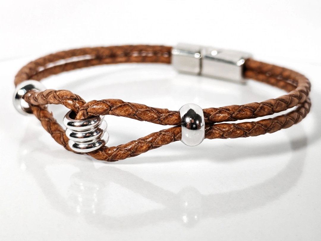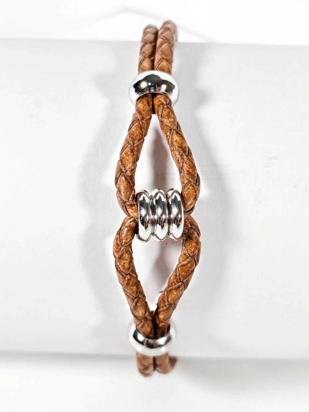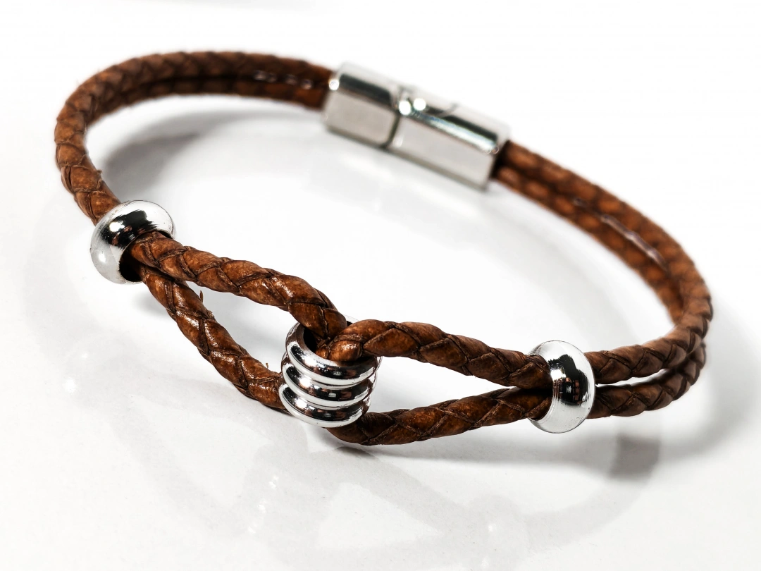 Doğal kahverengi tonu ve çift sıra örgü tasarımıyla öne çıkan örgü deri bileklik, sade ama güçlü bir stil arayanlar için özel olarak tasarlanmıştır. Derinin doğal dokusu ile metal detayların uyumu, bilekliğe hem modern hem de zamansız bir görünüm kazandırır.