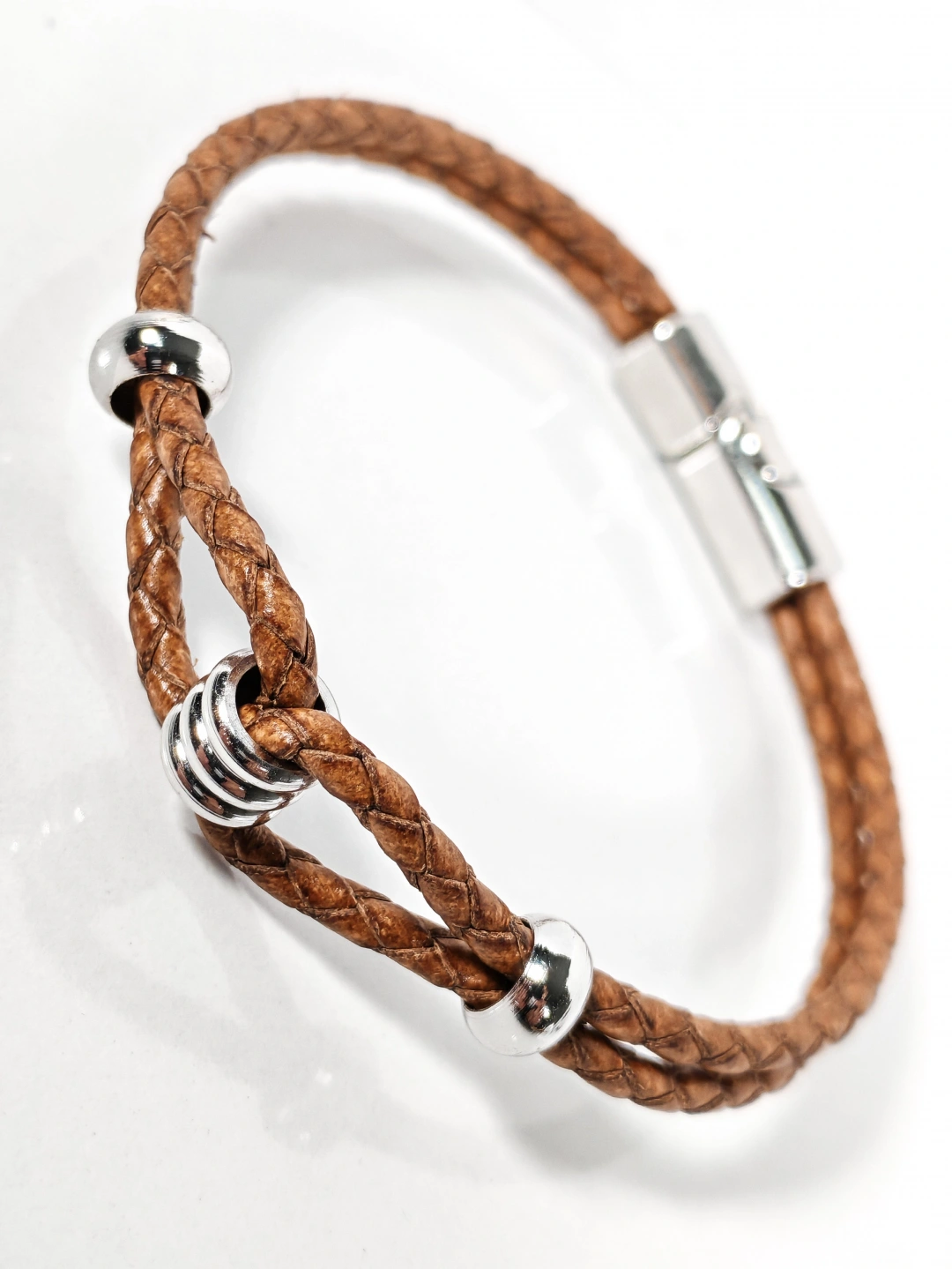 Kaliteli örgü deri malzemeden üretilmiştir. Esnek yapısı sayesinde bileğe rahatça uyum sağlar ve gün boyu konforlu bir kullanım sunar. Parlak metal geçiş halkaları tasarıma şık bir hareket katarken, sağlam manyetik kilit yapısı bilekliğin güvenle kullanılmasını sağlar.