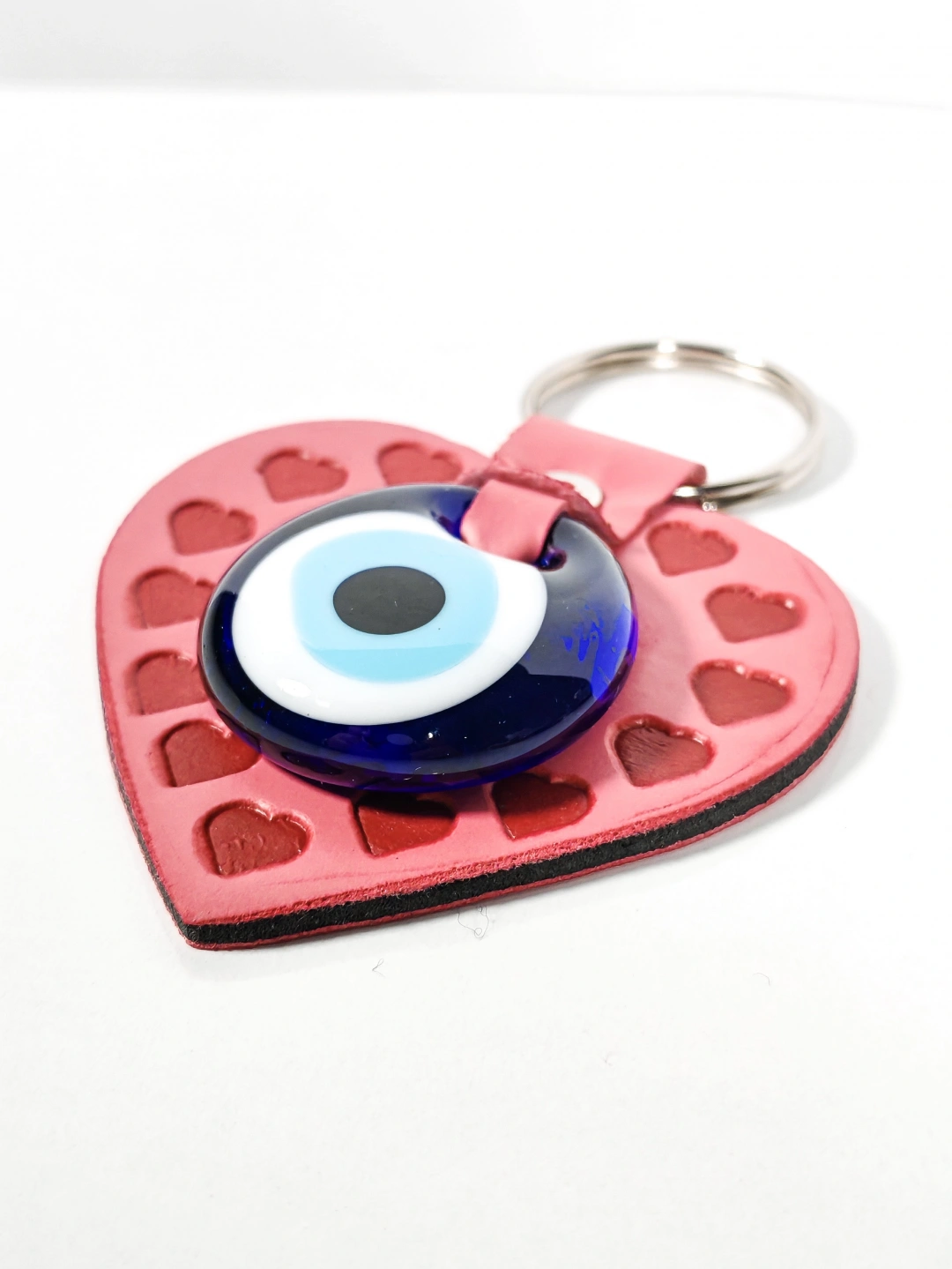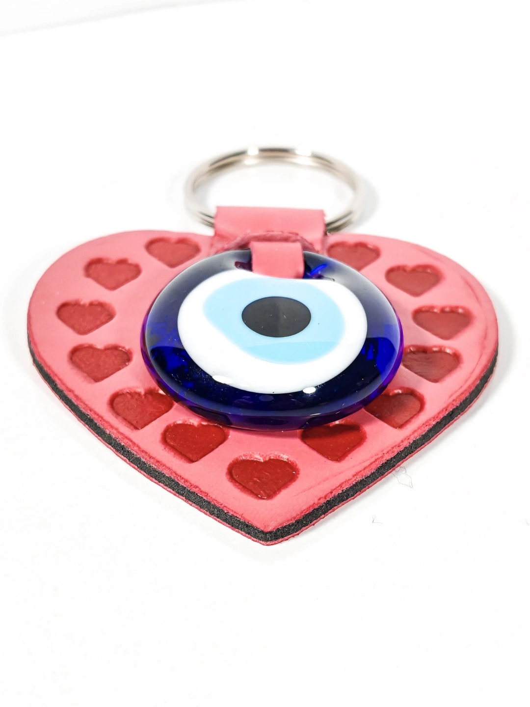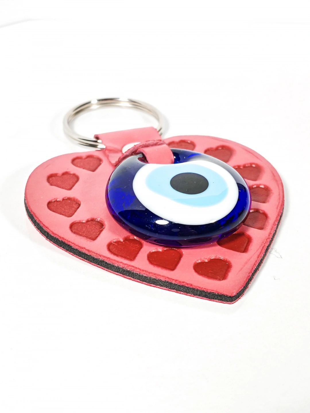 Kalp formunda suni deri plaka üzerine tasarlanan ve hareketli bağlantı ile yerleştirilmiş nazar boncuğu detayıyla tamamlanan bu anahtarlık, sevgi sembolünü koruyucu bir anlamla birleştirir. Canlı kırmızı kalp zemin üzerindeki kabartmalı kalp detayları ürüne sıcak ve dikkat çekici bir görünüm kazandırırken, hareketli yapıya sahip nazar boncuğu anahtarlığa dinamik ve özgün bir karakter katar.