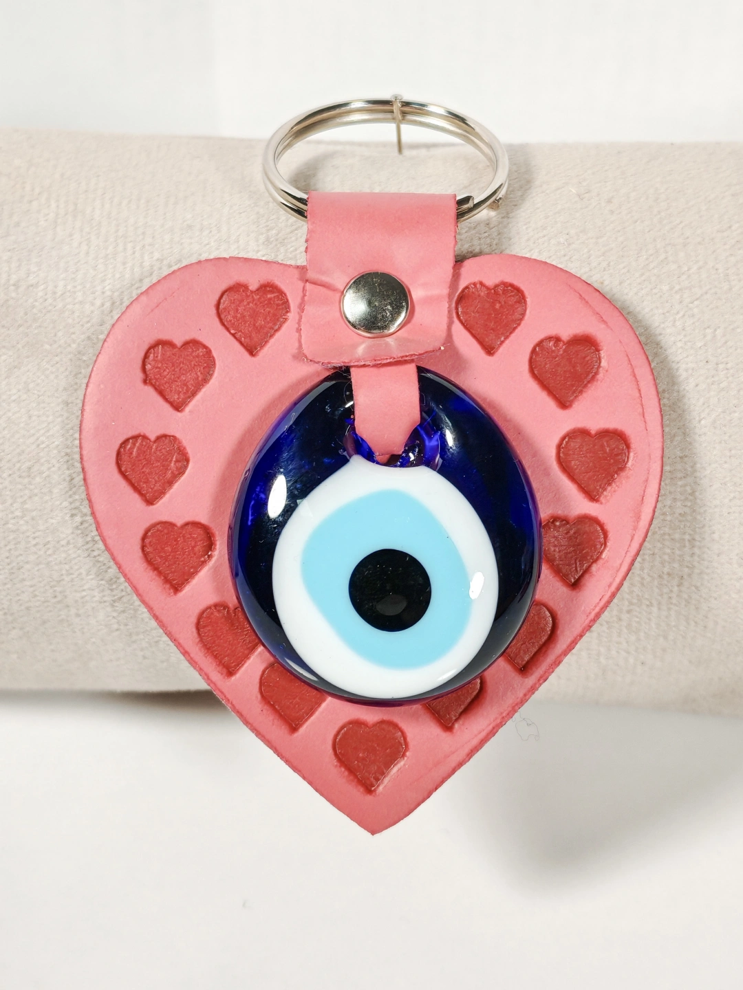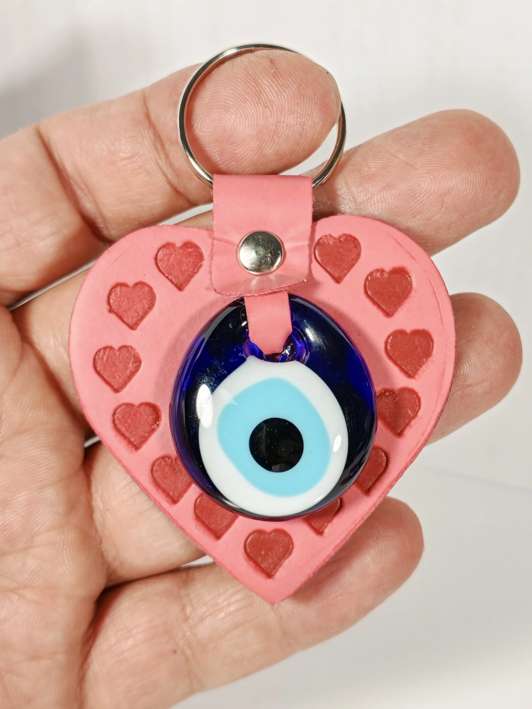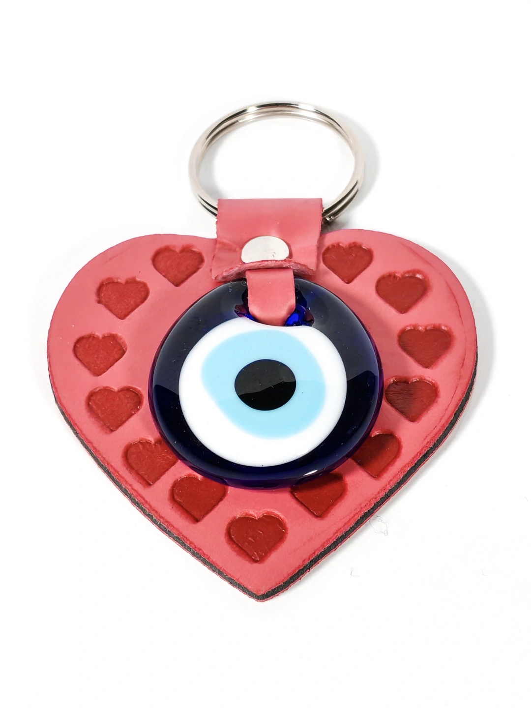 Kalp formunda suni deri plaka üzerine tasarlanan ve hareketli bağlantı ile yerleştirilmiş nazar boncuğu detayıyla tamamlanan bu anahtarlık, sevgi sembolünü koruyucu bir anlamla birleştirir. Canlı kırmızı kalp zemin üzerindeki kabartmalı kalp detayları ürüne sıcak ve dikkat çekici bir görünüm kazandırırken, hareketli yapıya sahip nazar boncuğu anahtarlığa dinamik ve özgün bir karakter katar.