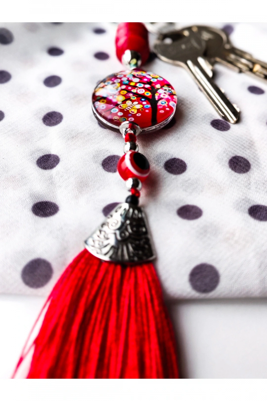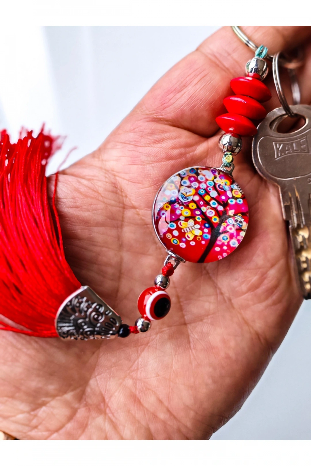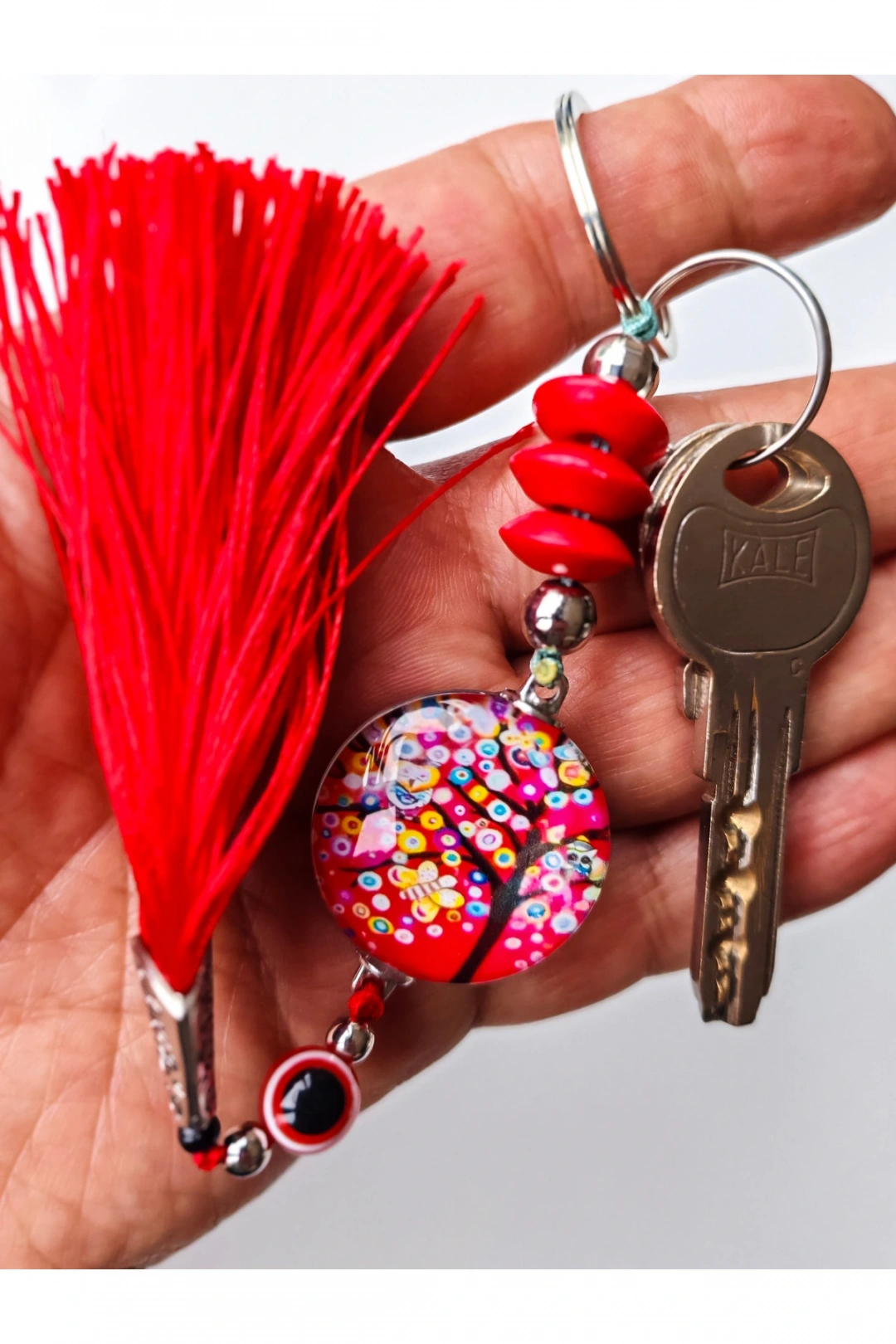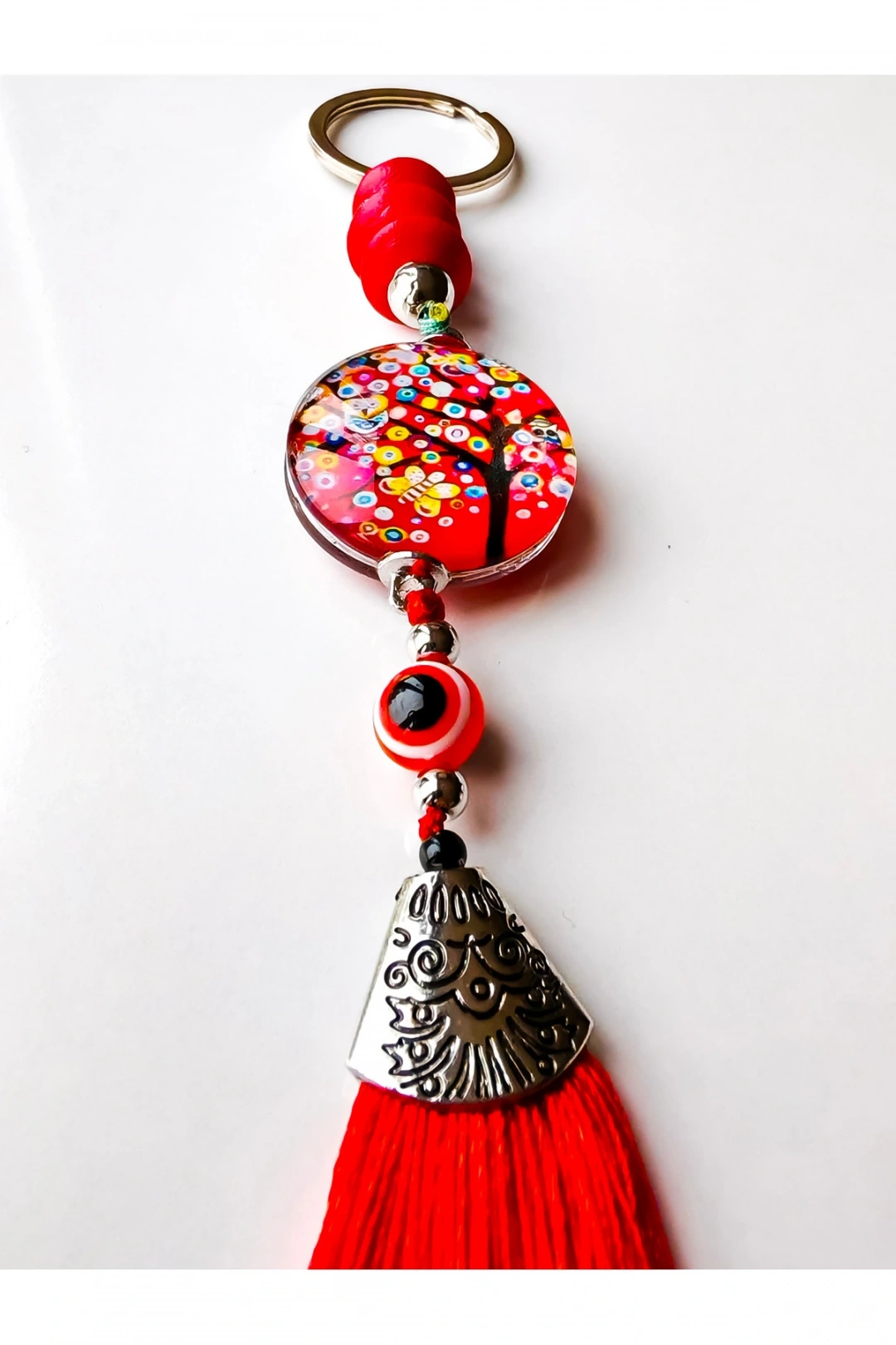 Kırmızı boncuklu hayat ağacı ve kırmızı püsküllü anahtarlık.; Şık ve göz alıcı.; ; Hediye olarakta düşünebilirsiniz.