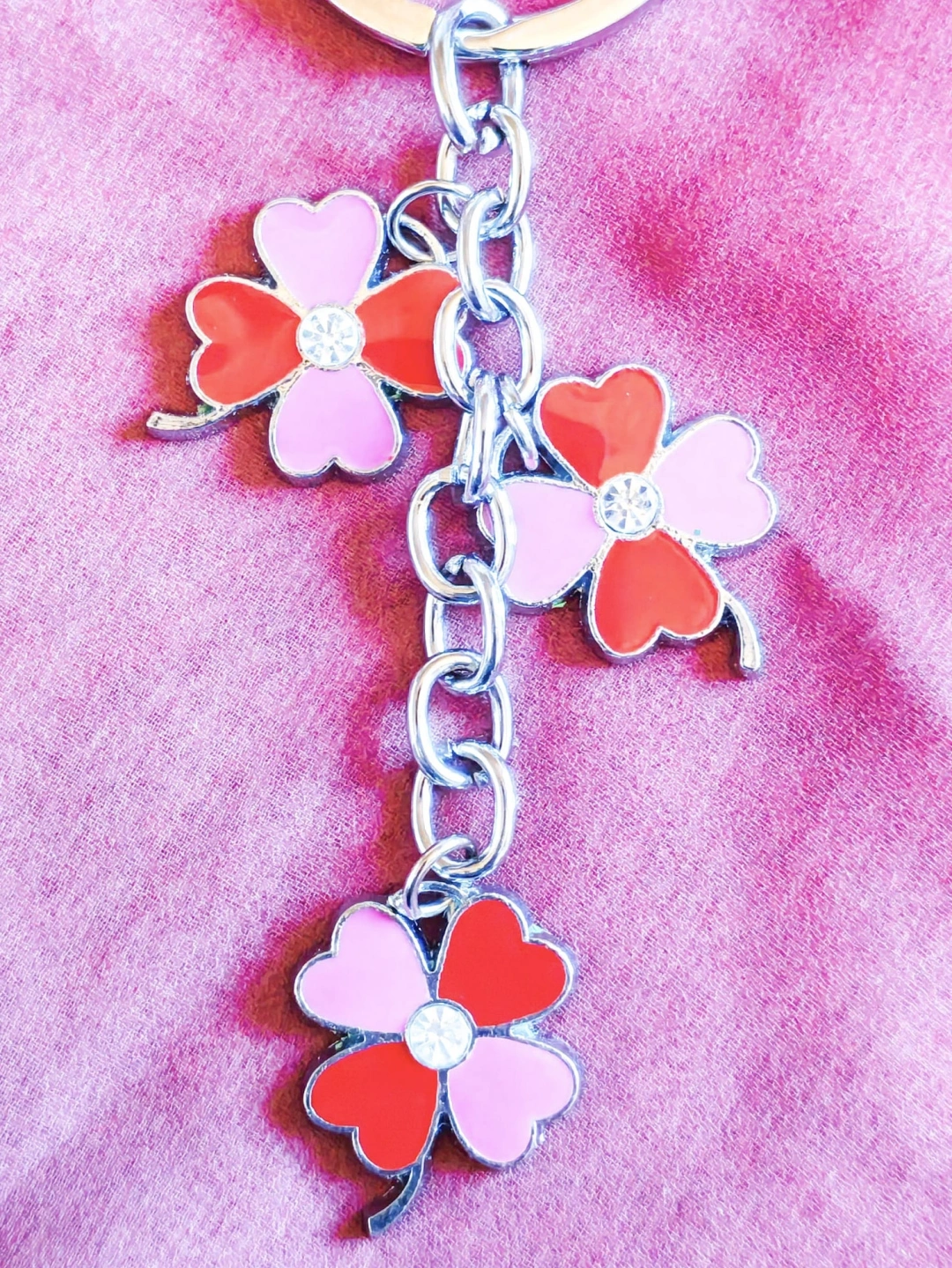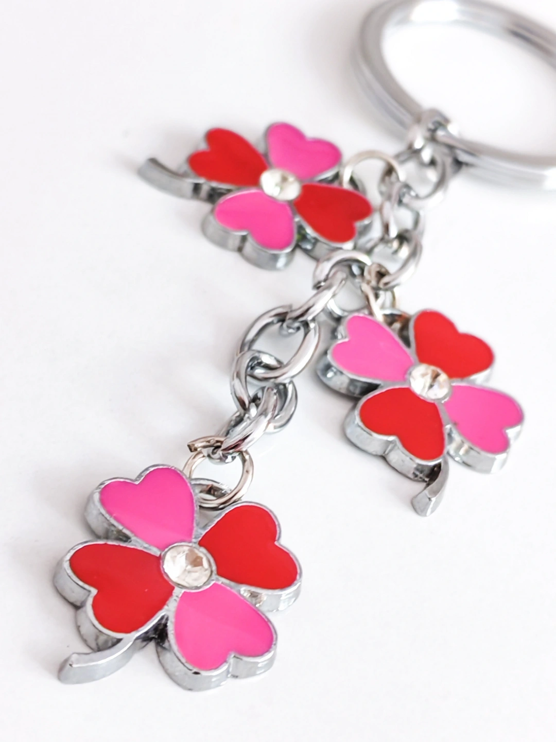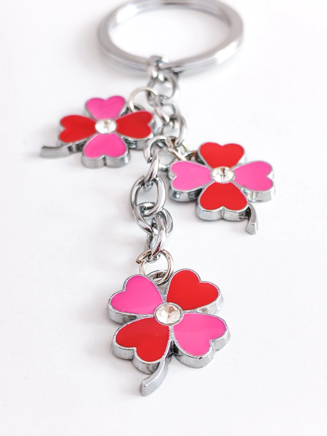 Kırmızı & Pembe Renkli 4 Yapraklı Yonca Metal Anahtarlık – Şans ve Zarafetin SimgesiKırmızı ve pembe tonlarının uyumuyla tasarlanan bu 4 yapraklı yonca metal anahtarlık, hem zarif hem de anlamlı bir aksesuardır. 4 yapraklı yonca, şans, umut, sevgi ve huzuru temsil ederken; canlı renkleriyle günlük kullanımınıza pozitif bir enerji katar.