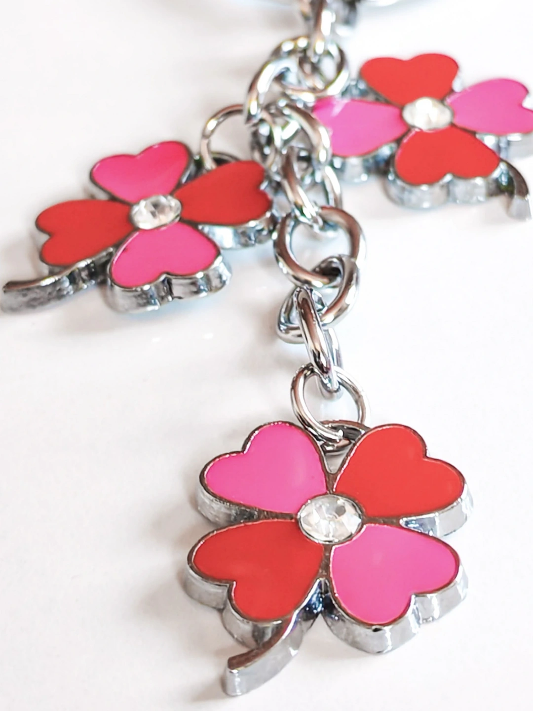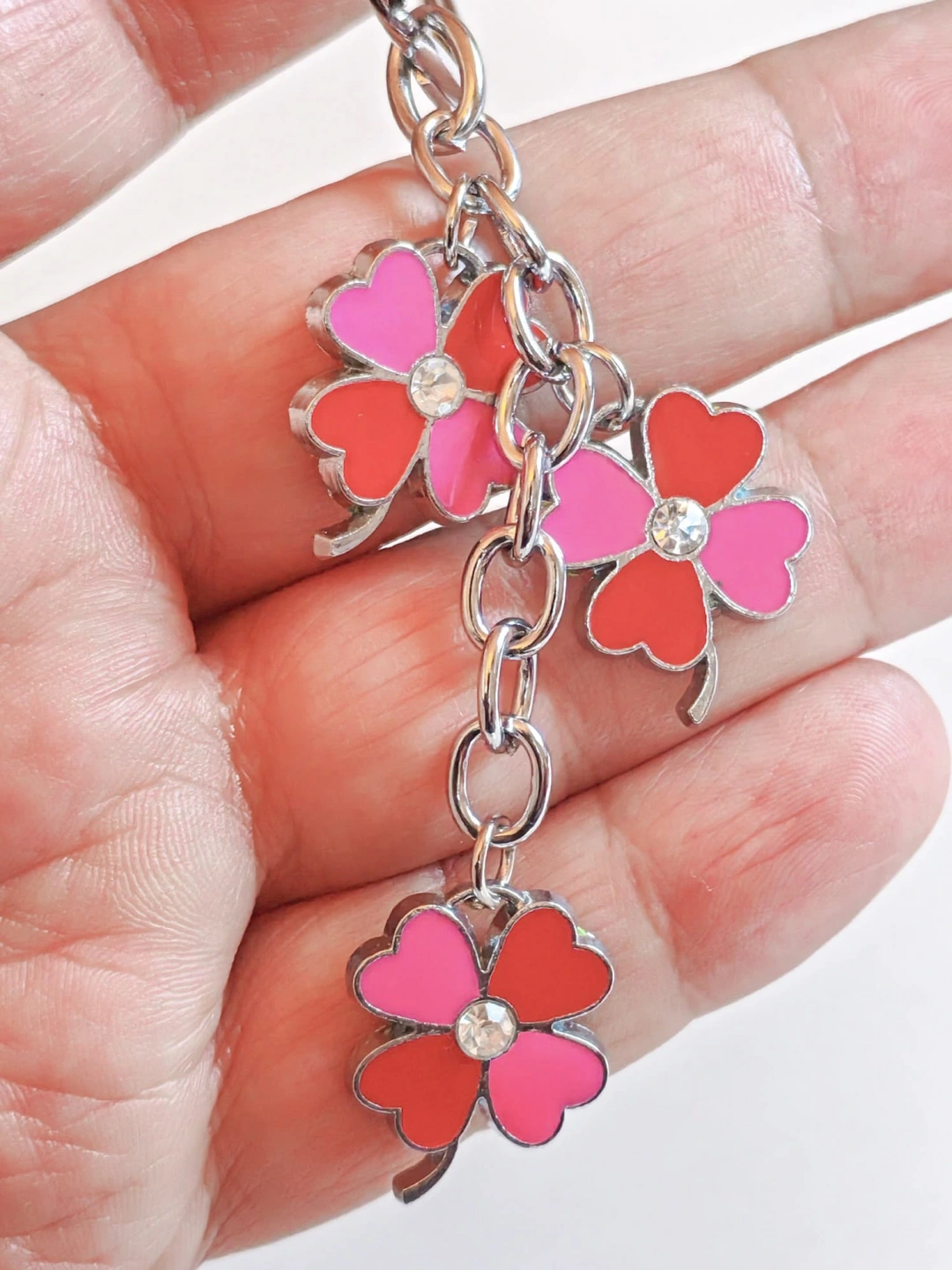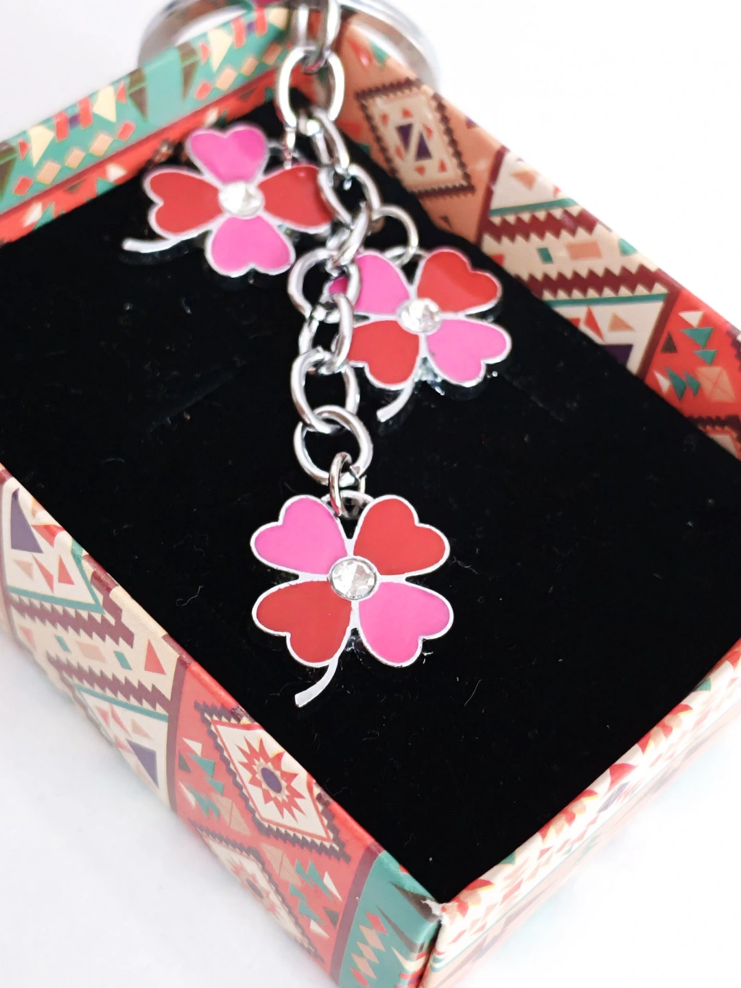 Kırmızı & Pembe Renkli 4 Yapraklı Yonca Metal Anahtarlık – Şans ve Zarafetin SimgesiKırmızı ve pembe tonlarının uyumuyla tasarlanan bu 4 yapraklı yonca metal anahtarlık, hem zarif hem de anlamlı bir aksesuardır. 4 yapraklı yonca, şans, umut, sevgi ve huzuru temsil ederken; canlı renkleriyle günlük kullanımınıza pozitif bir enerji katar.