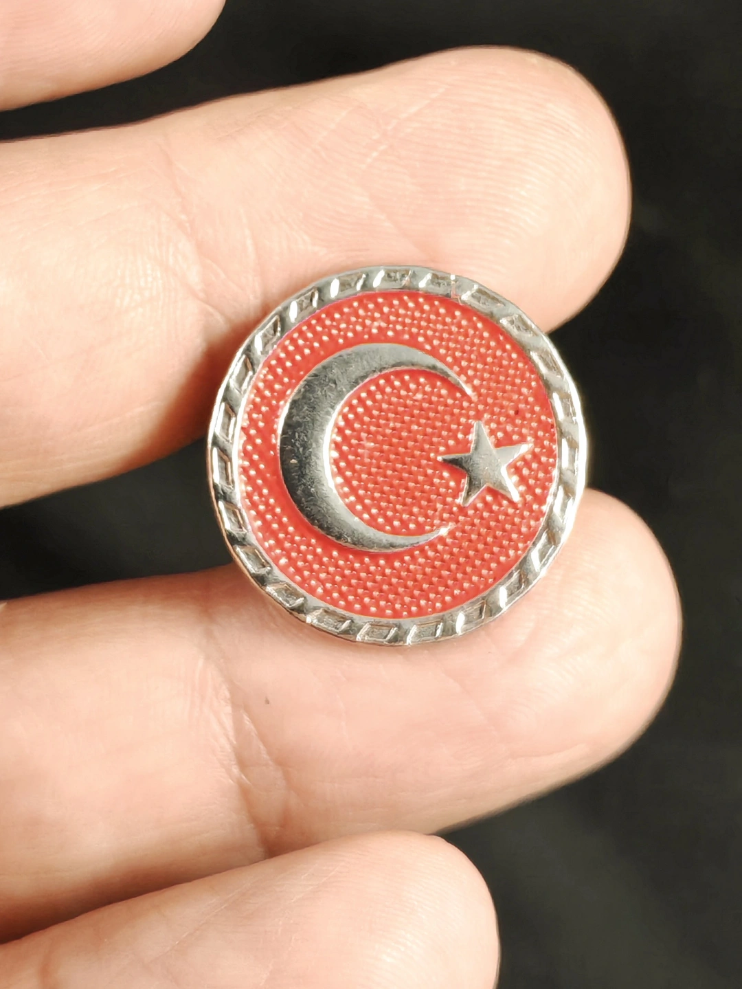 Kaliteli metal malzemeden üretilen rozet, kabartmalı ay yıldız detayı sayesinde derinlikli ve dikkat çekici bir görünüm sunar. Canlı kırmızı rengi ve belirgin kabartmalarıyla öne çıkan bu tasarım, dayanıklı yapısı sayesinde uzun süre formunu ve estetik görünümünü korur. Ceket, mont, yaka, çanta veya şapka üzerinde rahatlıkla kullanılabilir.