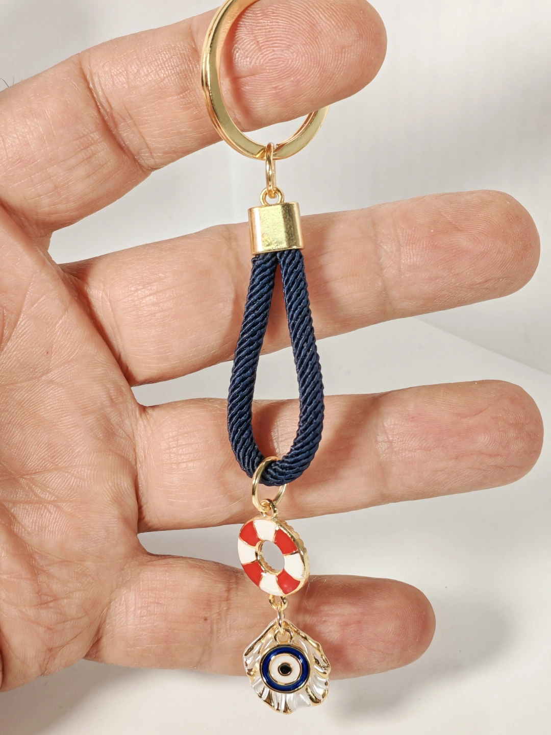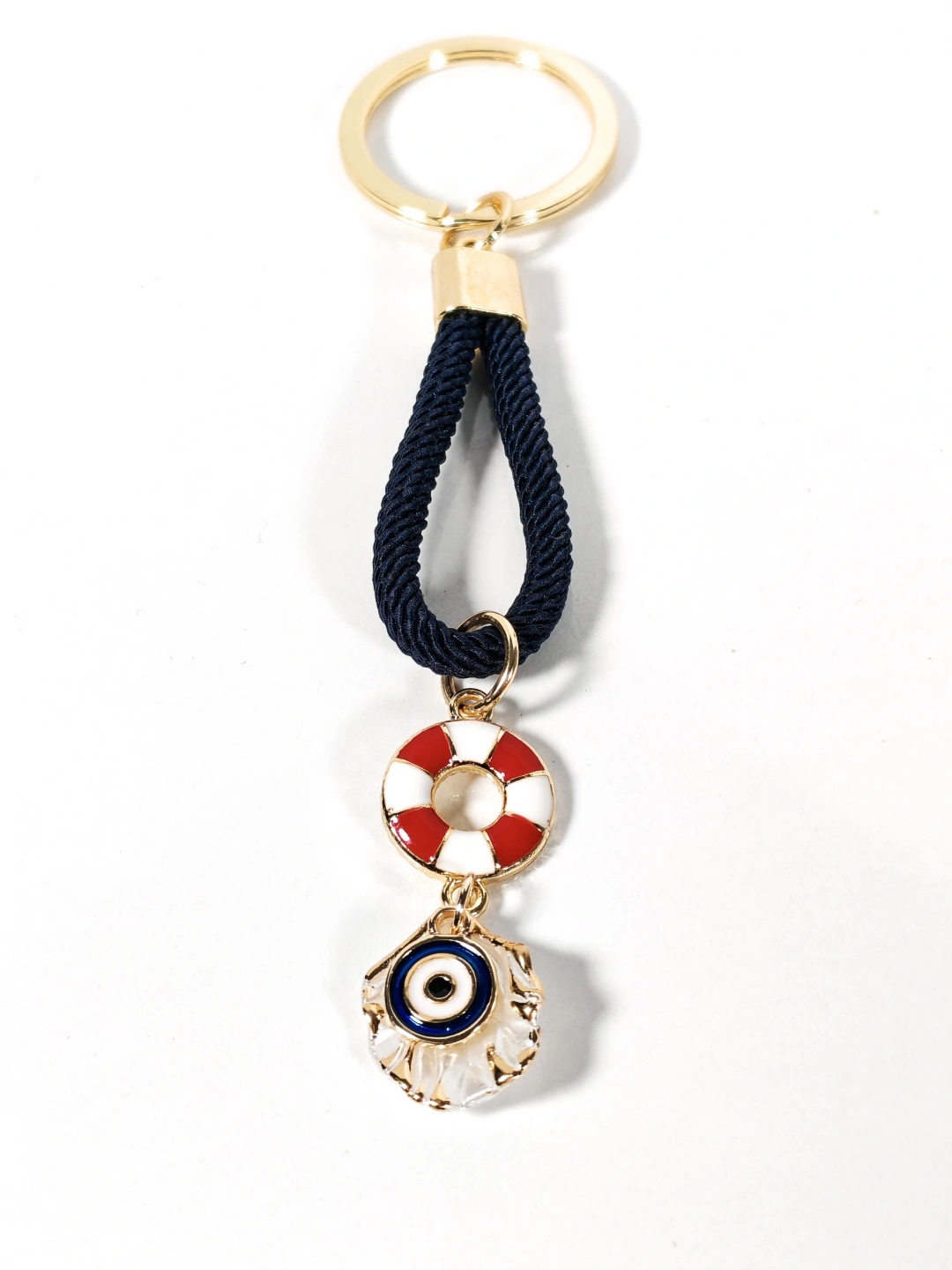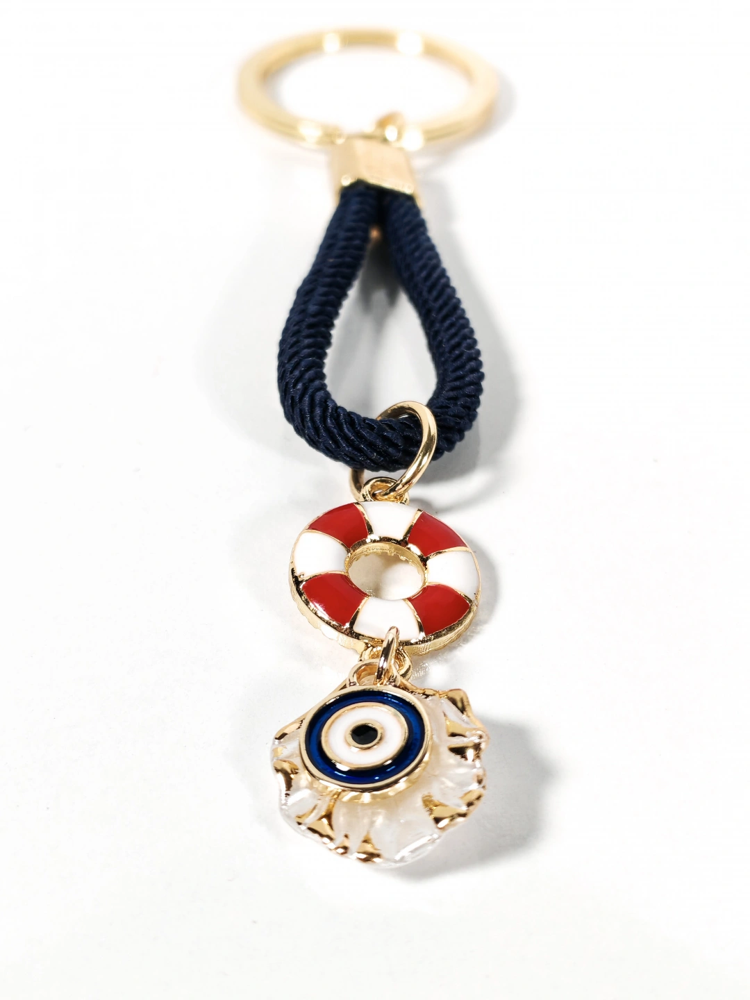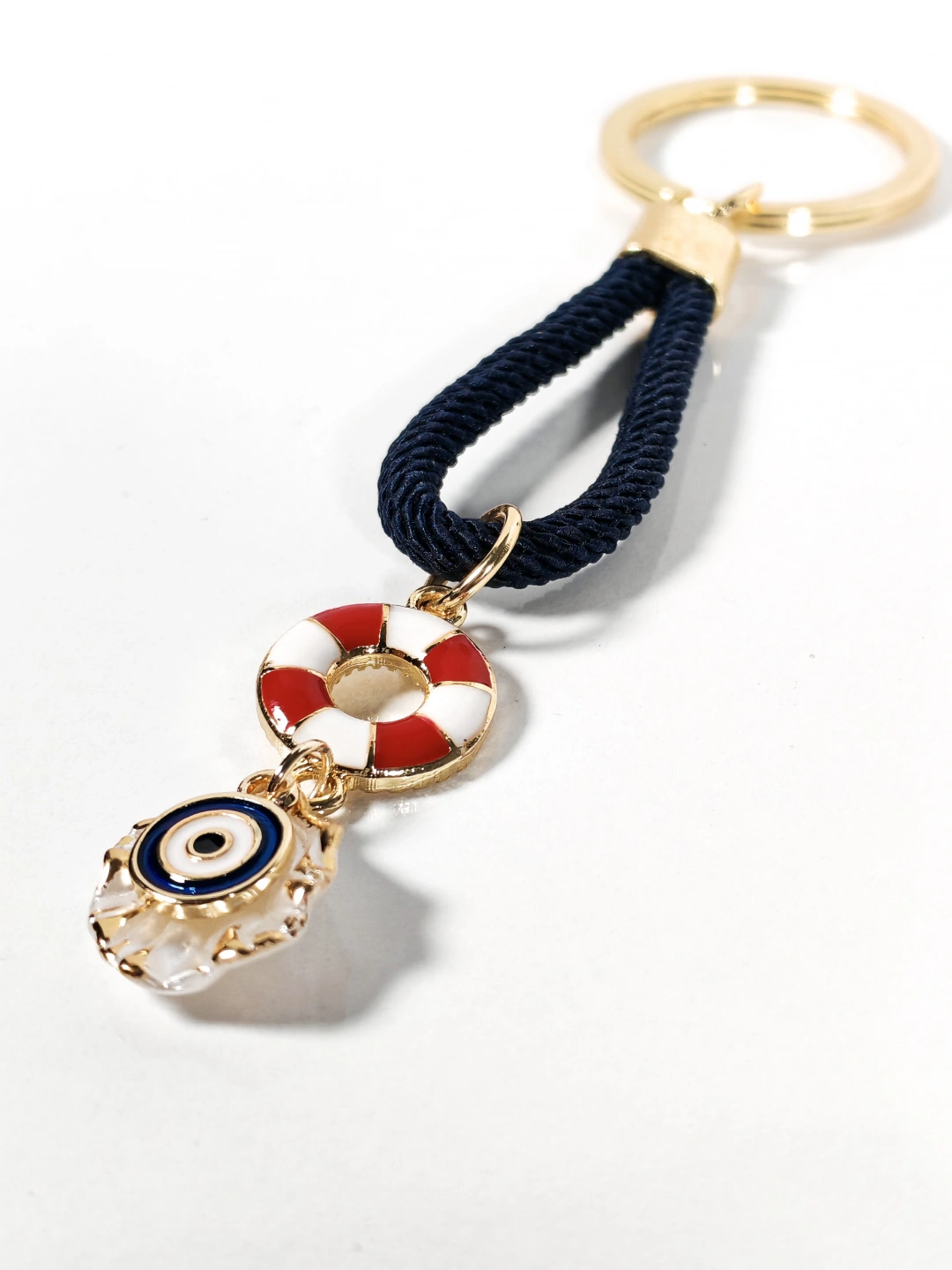 Lacivert örgü ip detayı, kırmızı-beyaz can simidi figürü ve altın tonlu nazar detayıyla tasarlanan bu özel anahtarlık; deniz temalı şıklığı, anlamlı sembolleri ve zarif duruşu bir araya getirir. Lacivert rengin sakinliği, can simidinin enerjik renkleriyle dengelenirken nazar figürü tasarıma anlamlı bir dokunuş katar.