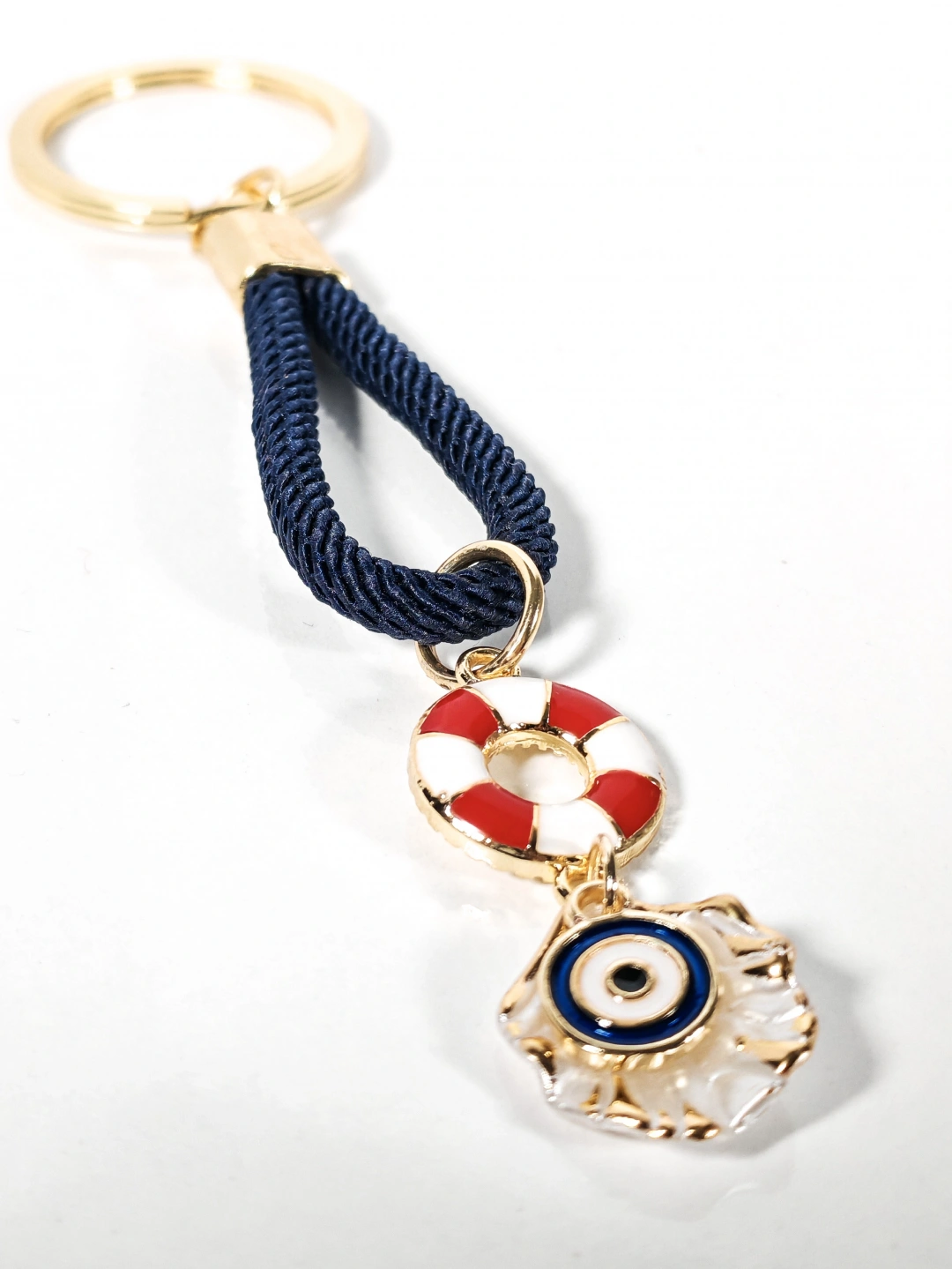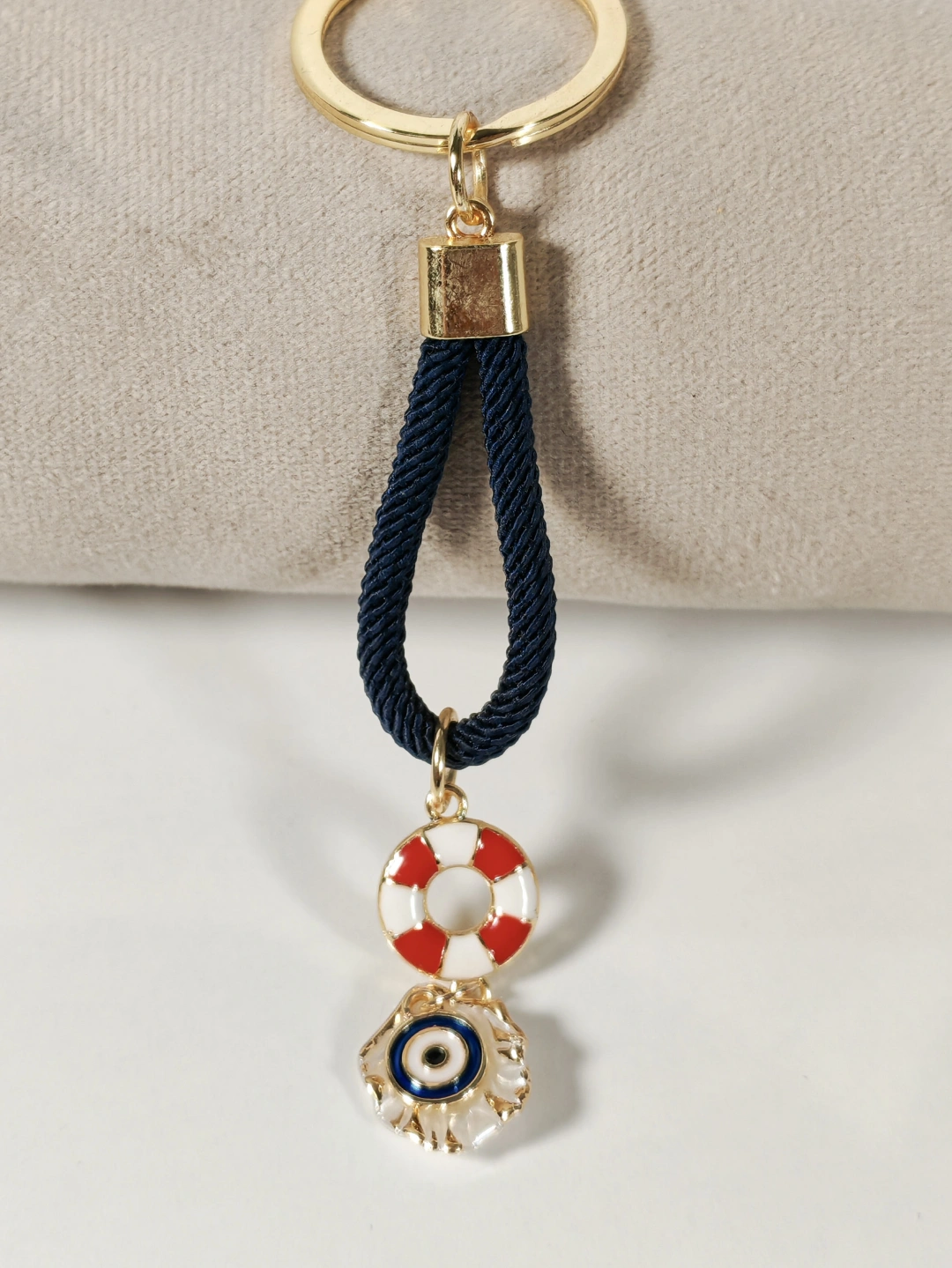 Lacivert Örgü İpli Can Simidi ve Nazar Figürlü Metal Anahtarlık – Deniz Temalı Şık ve Anlamlı Tasarım