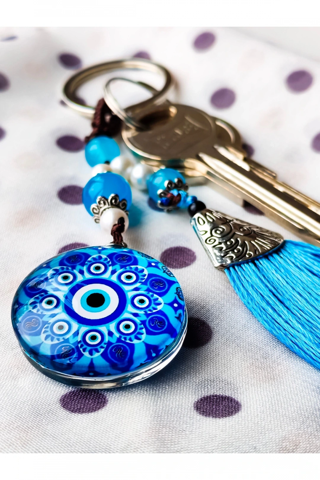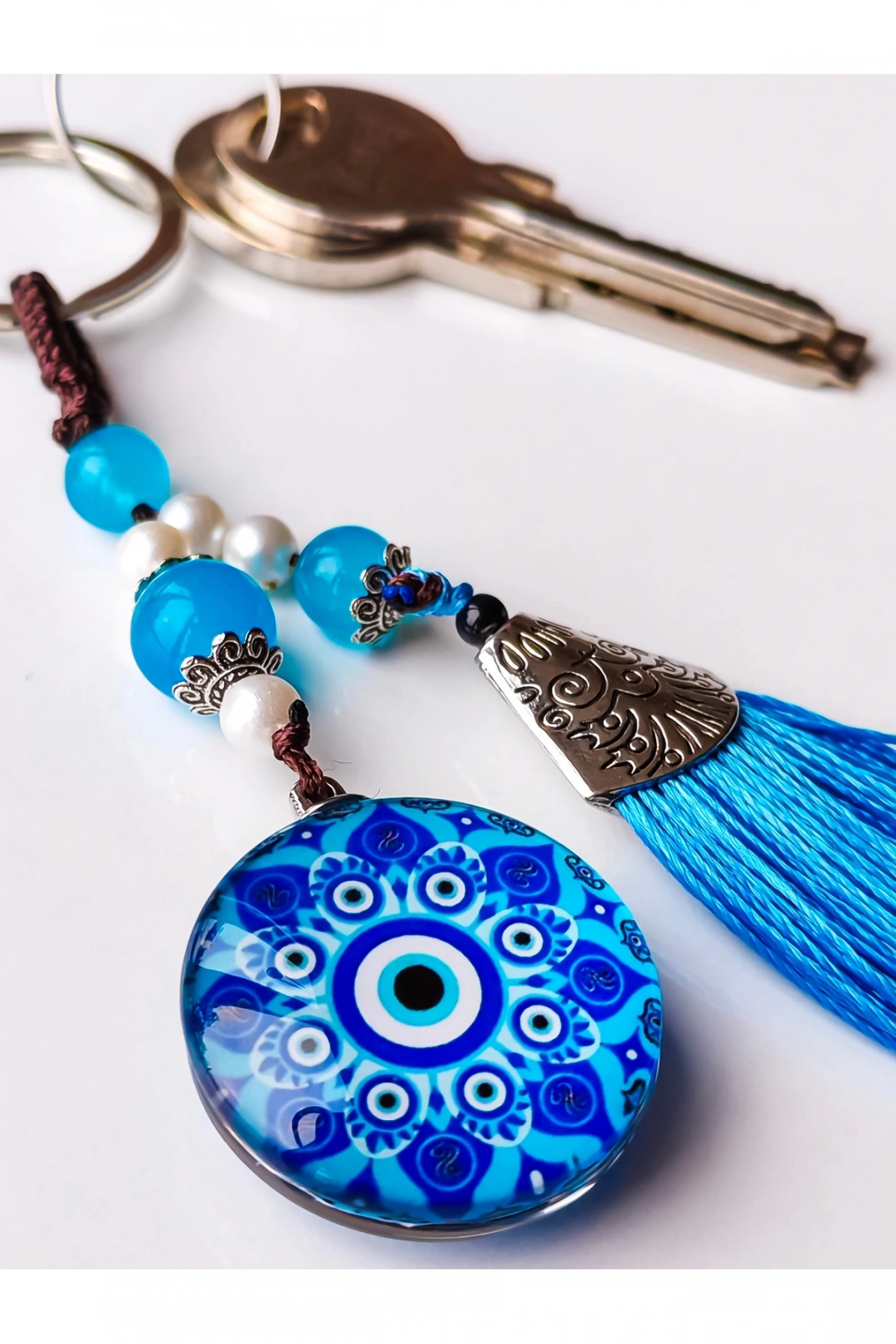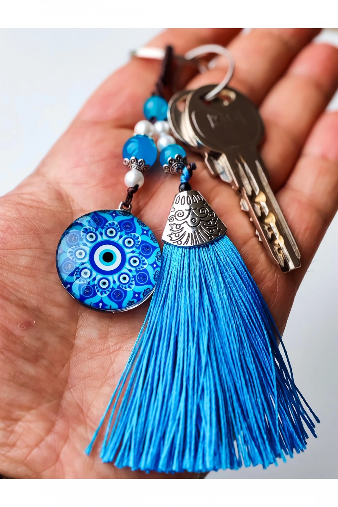 Mavi Cam ve Mavi Püsküllü Anahtarlık