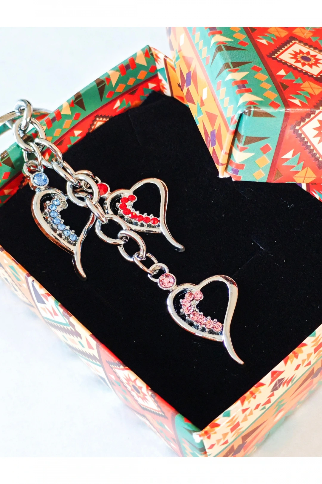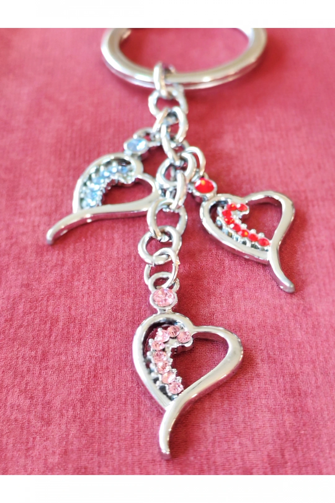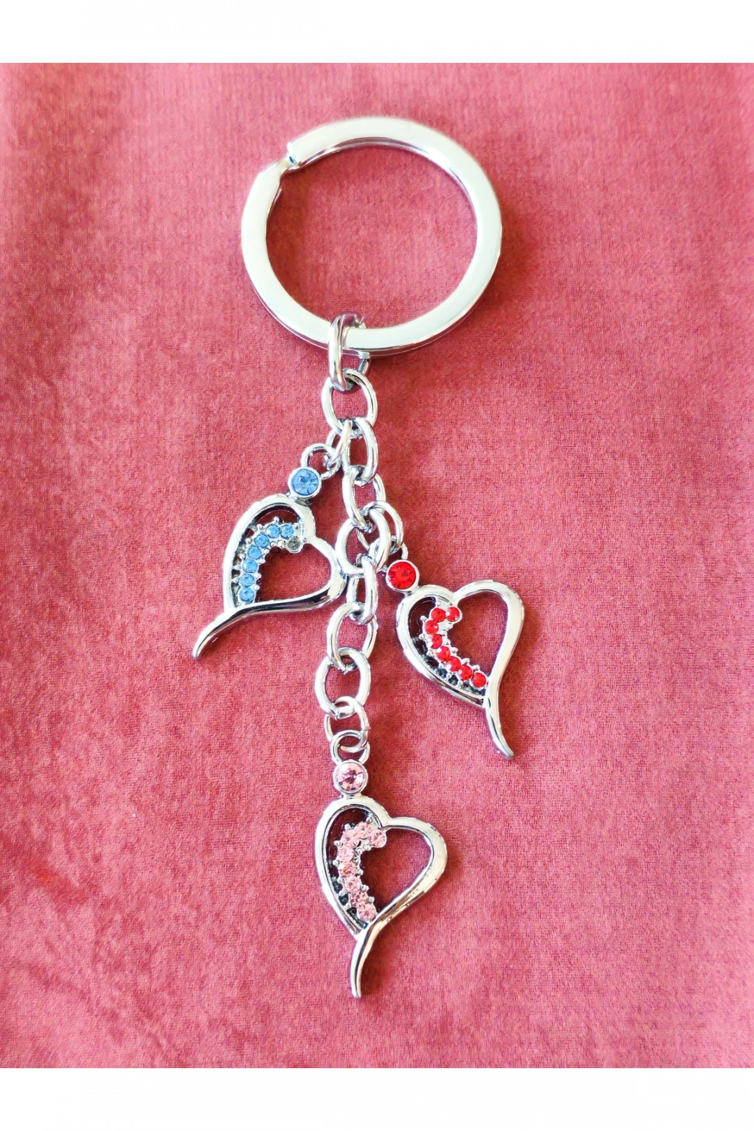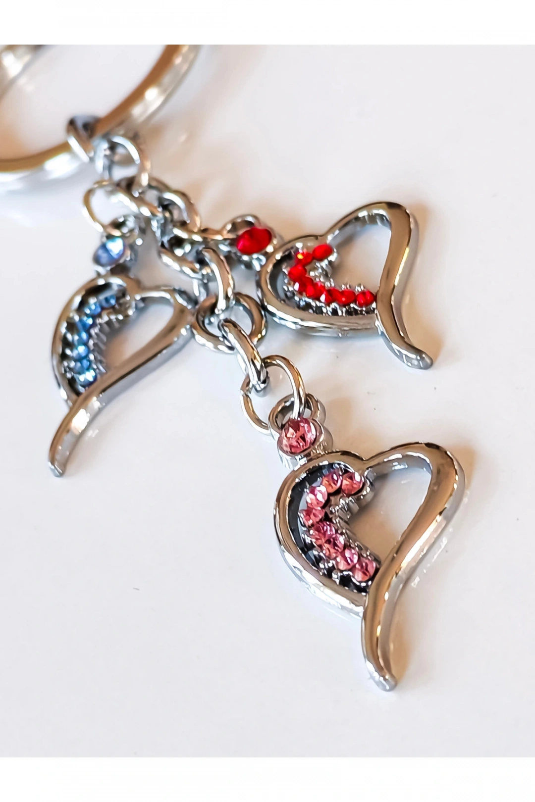 Mavi, Pembe ve Kırmızı Cam Kalplerden Metal Anahtarlık – Renk Renk Sevgi