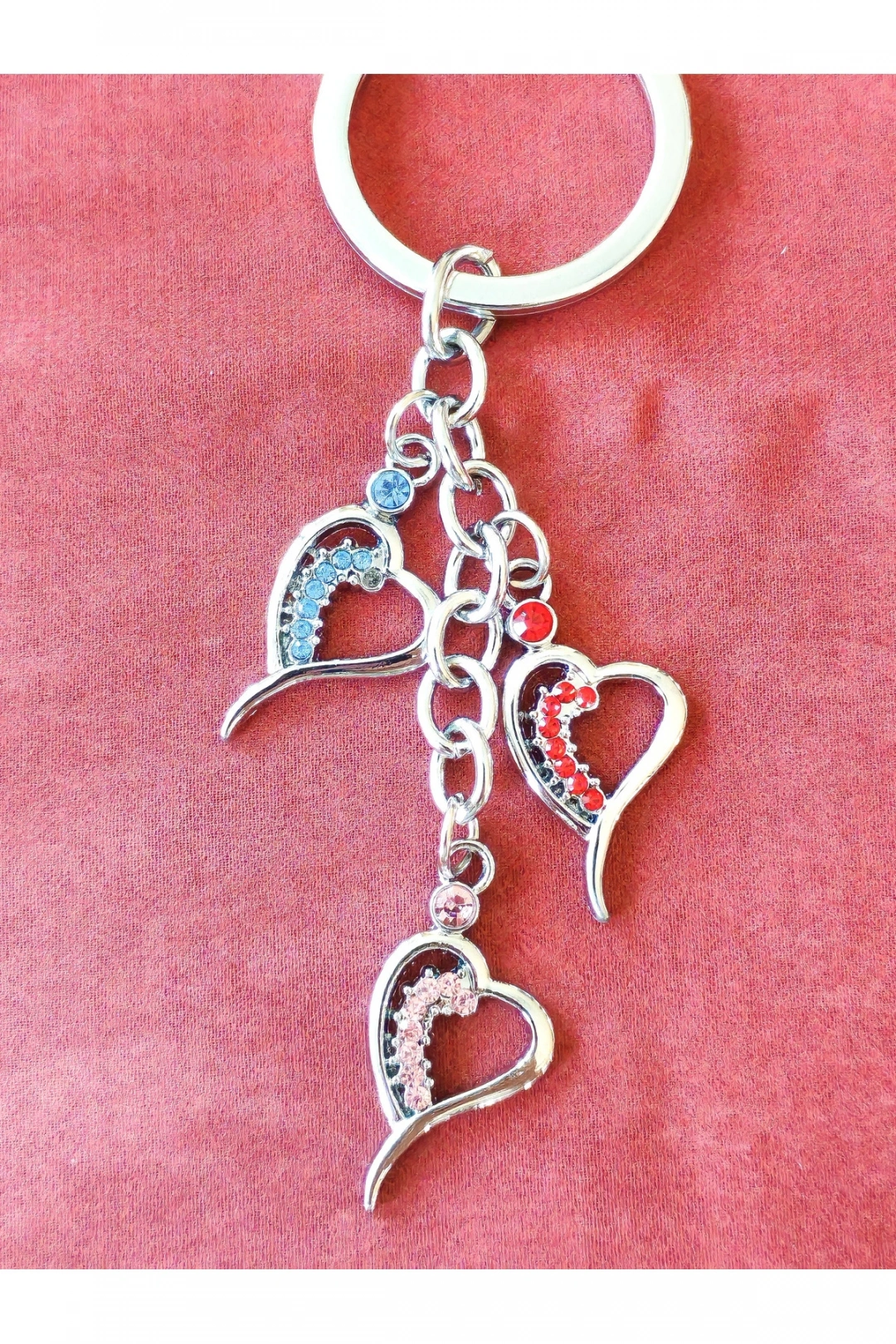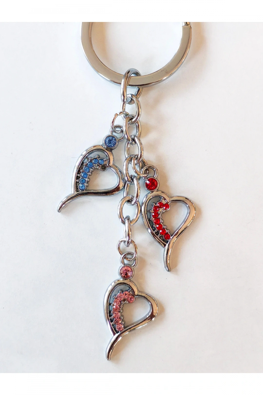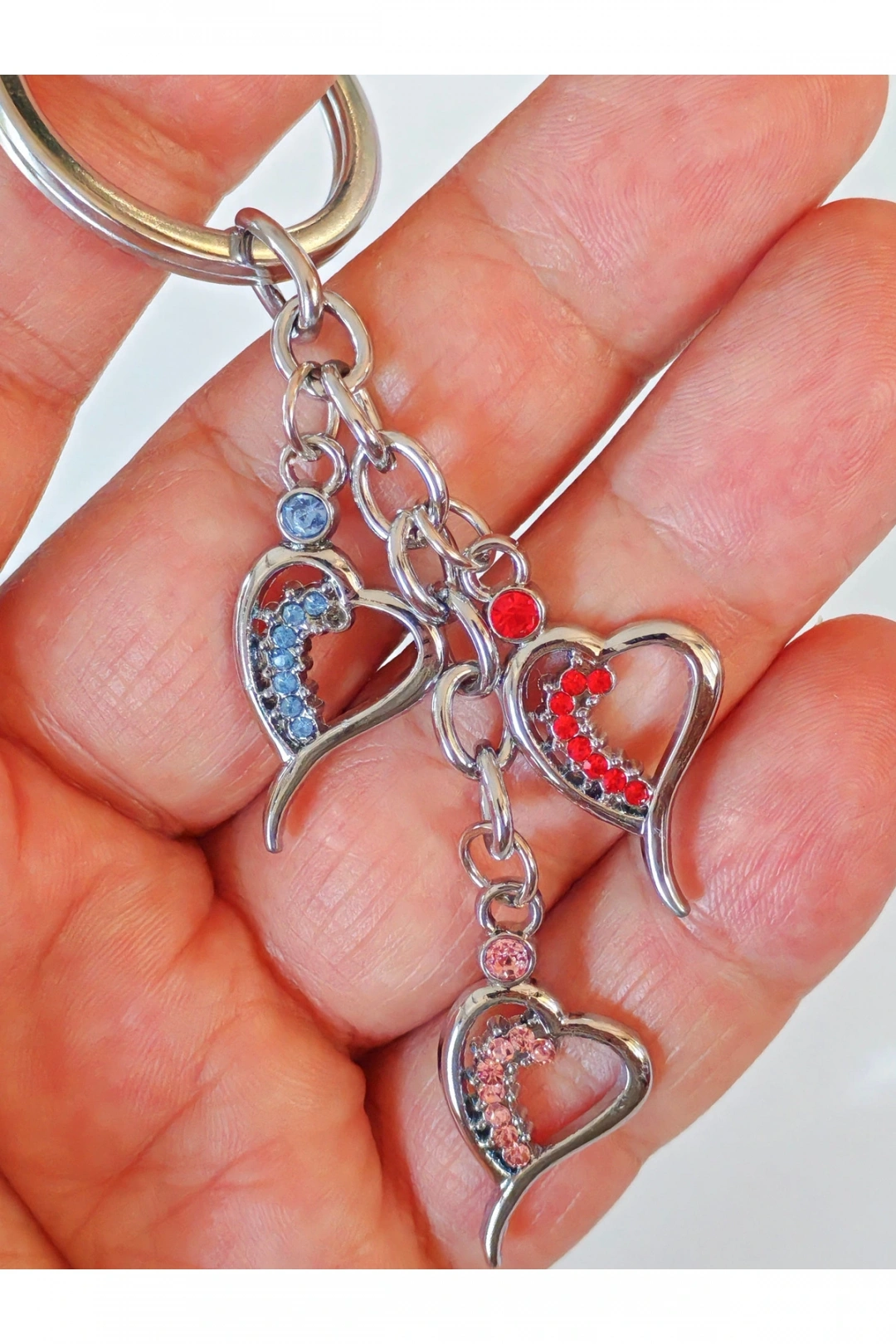 Üç farklı renk cam kalpten oluşan bu zarif metal anahtarlık, duygularınızı taşımak için hem renkli hem de anlamlı bir seçenek sunuyor. Günlük kullanımda şıklık katan bu tasarım, sevdiklerinize verilecek küçük ama etkileyici bir hediye alternatifi olabilir.
