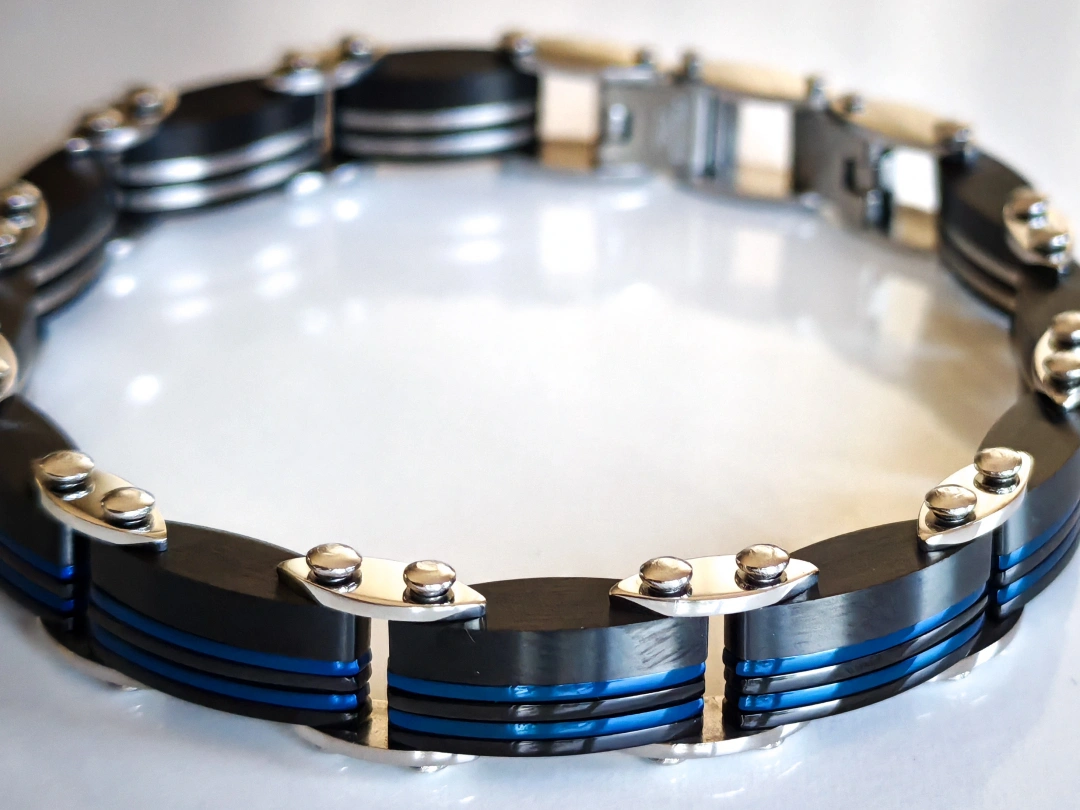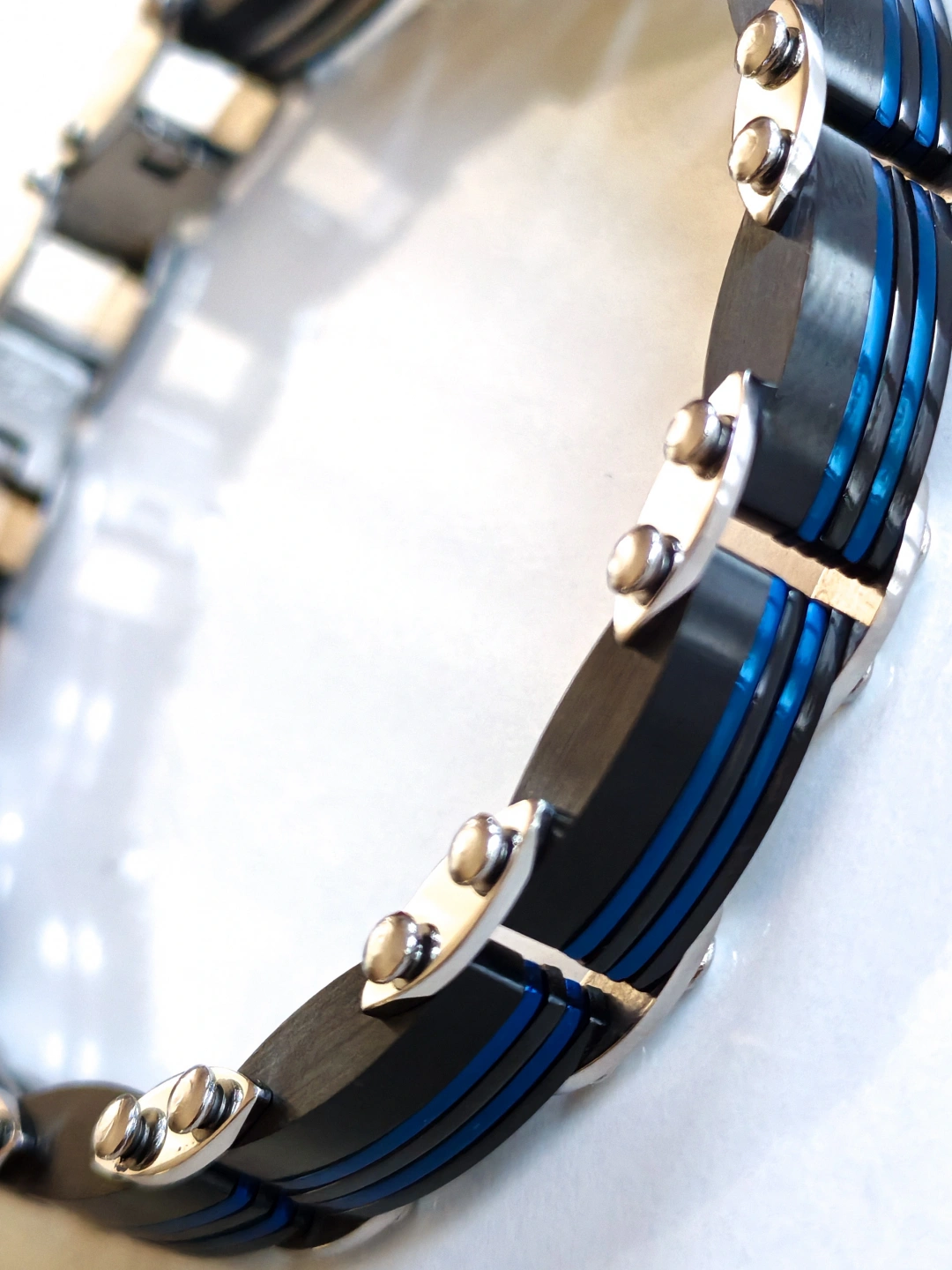 Mavi ve Siyah Çift Taraflı Çelik Erkek Bileklik – İki Tarafı Kullanılabilir Modern ve Maskülen Tasarım