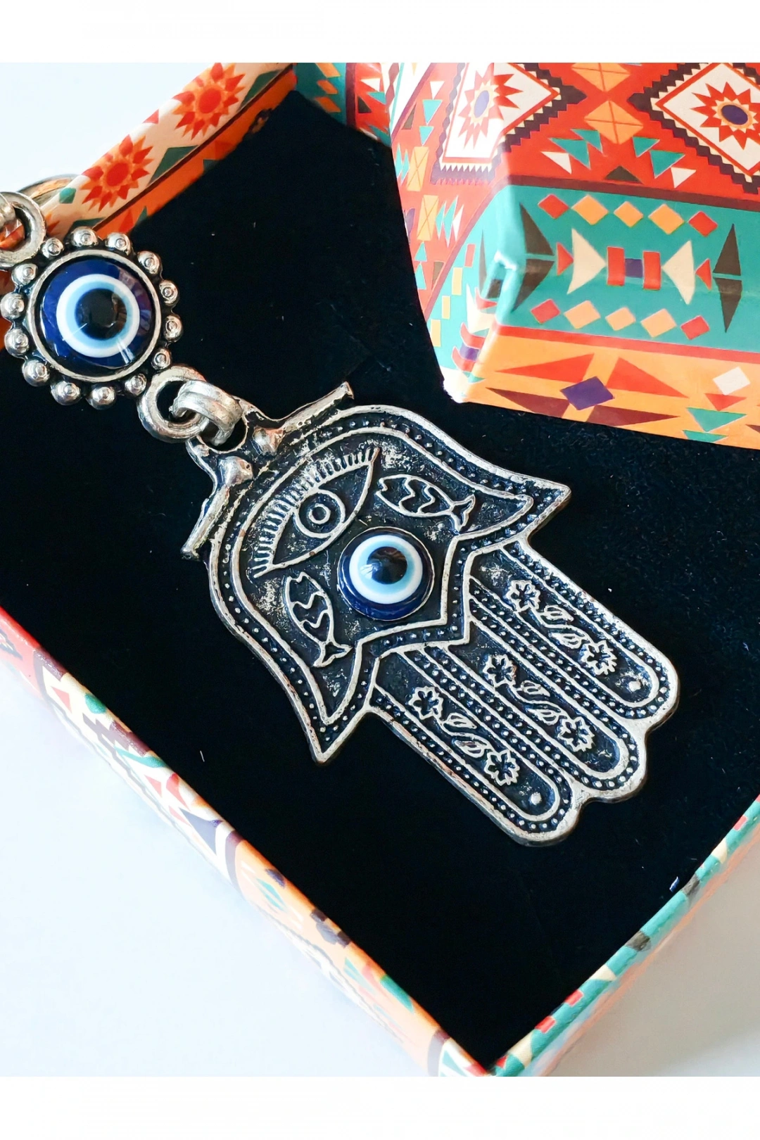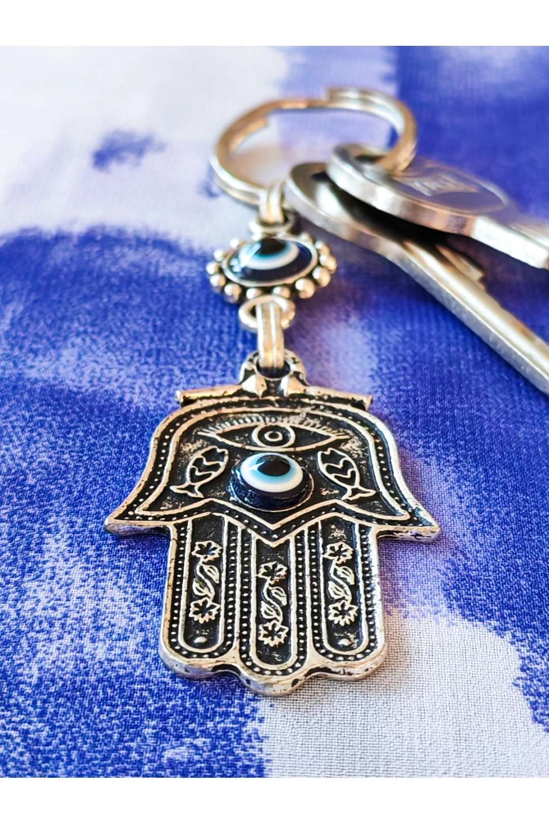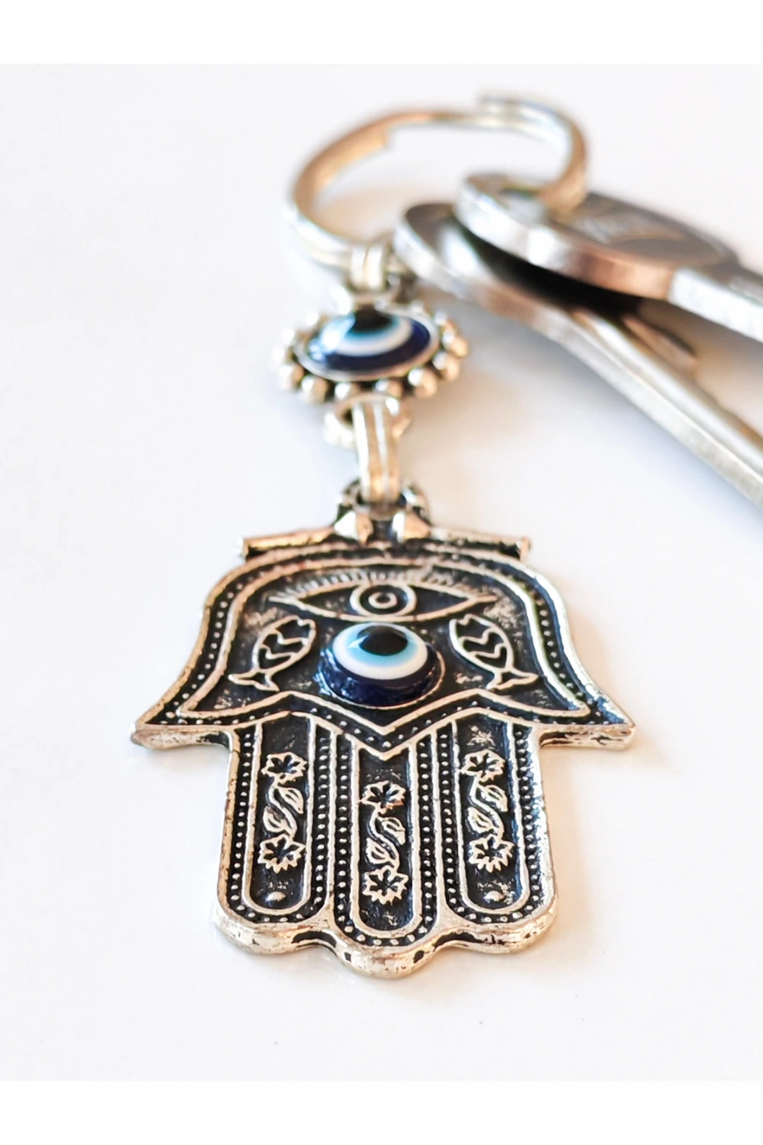 Bu özel anahtarlıkta, zarif metal işçiliği Fatımanın Eli figürüyle birleşiyor ve üzerini süsleyen cam nazar boncuklarıyla hem şık hem de anlamlı bir görünüm kazanıyor.
