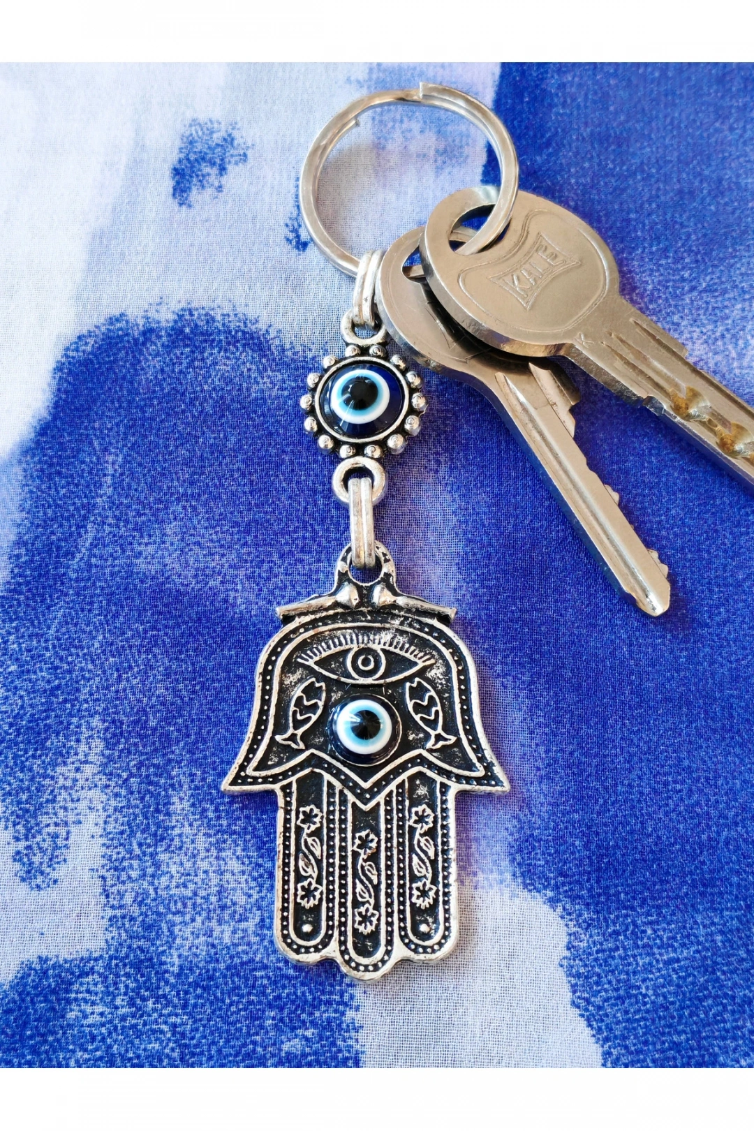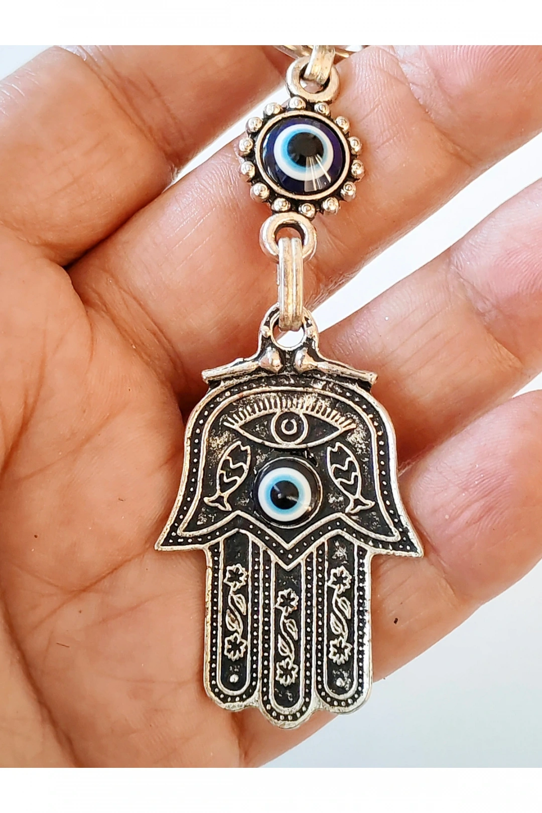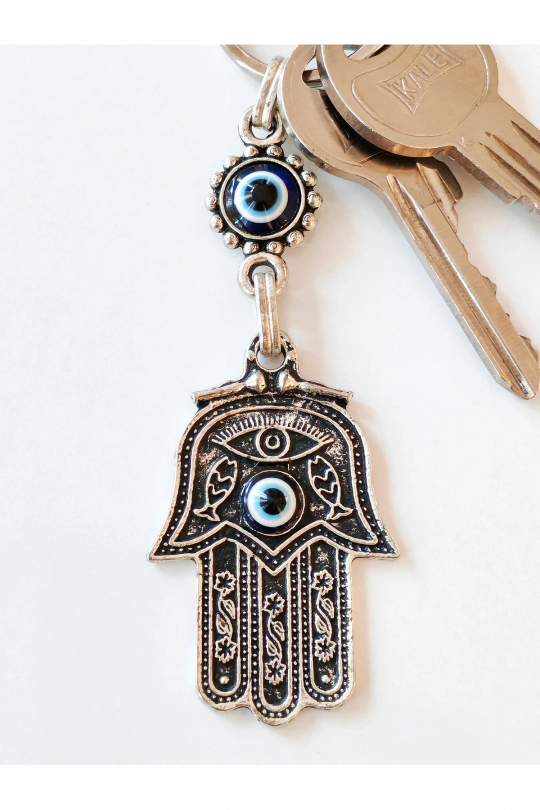 Bu özel anahtarlıkta, zarif metal işçiliği Fatımanın Eli figürüyle birleşiyor ve üzerini süsleyen cam nazar boncuklarıyla hem şık hem de anlamlı bir görünüm kazanıyor.