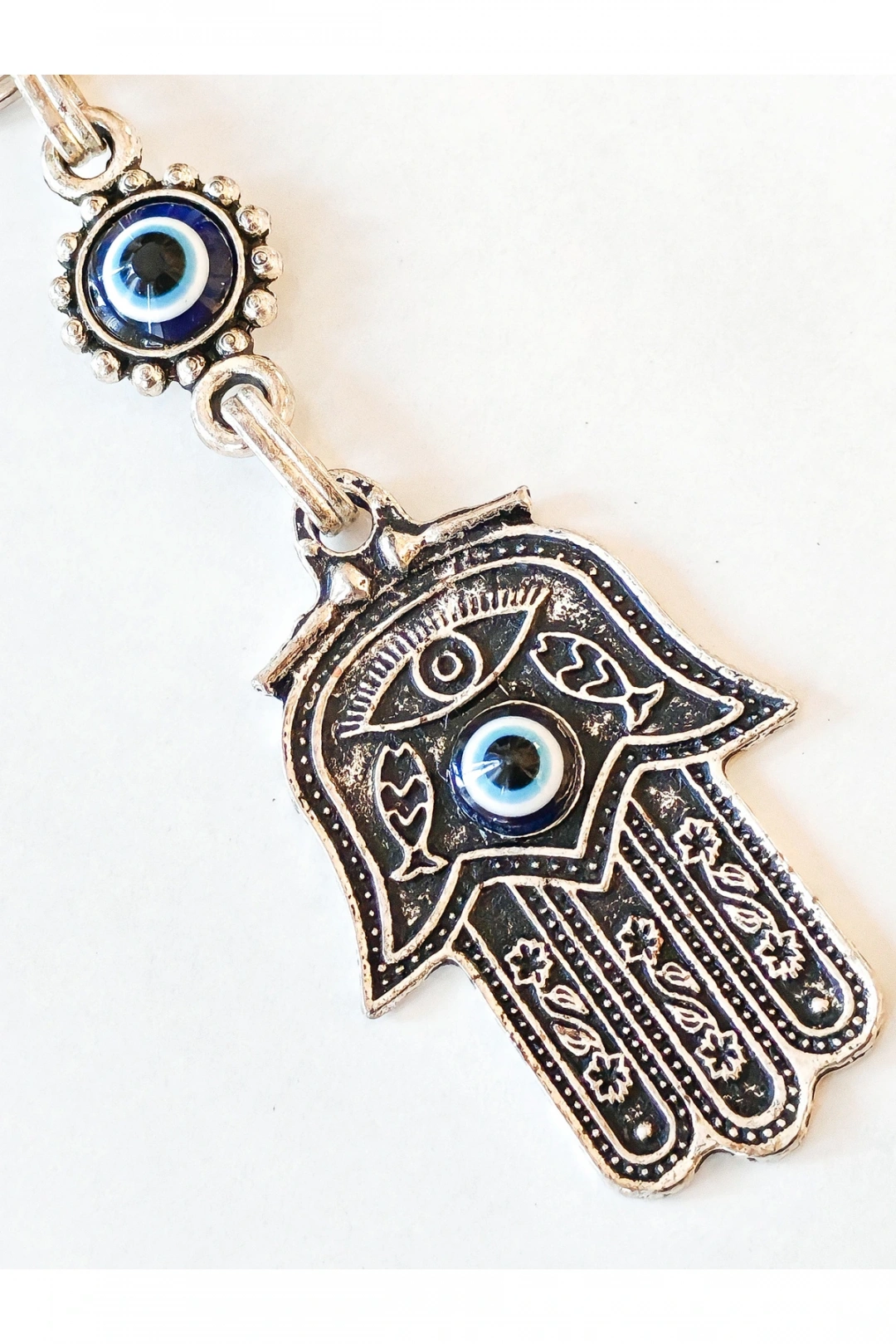 Metal Fatımanın Eli Şeklinde Üzeri Nazar Boncuğu Camlarıyla Bezeli Anahtarlık – Koruma ve Uğurun Güçlü Sembolü
