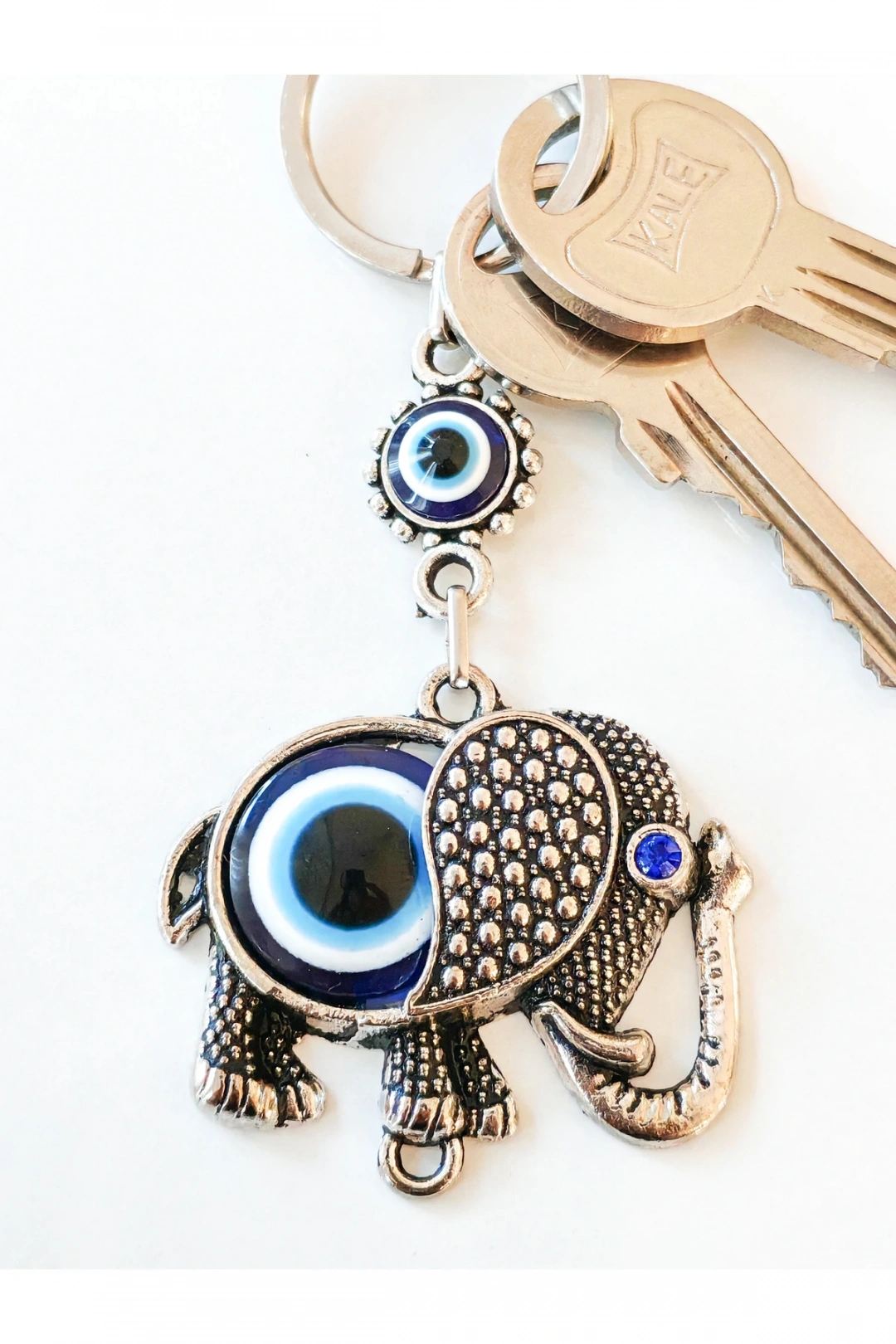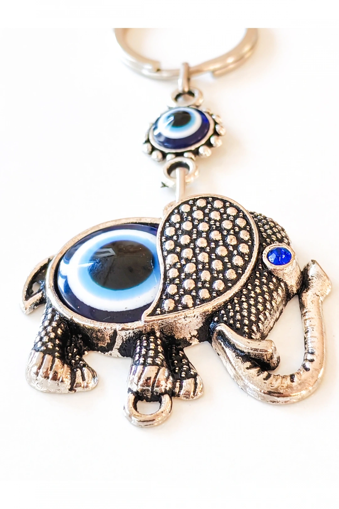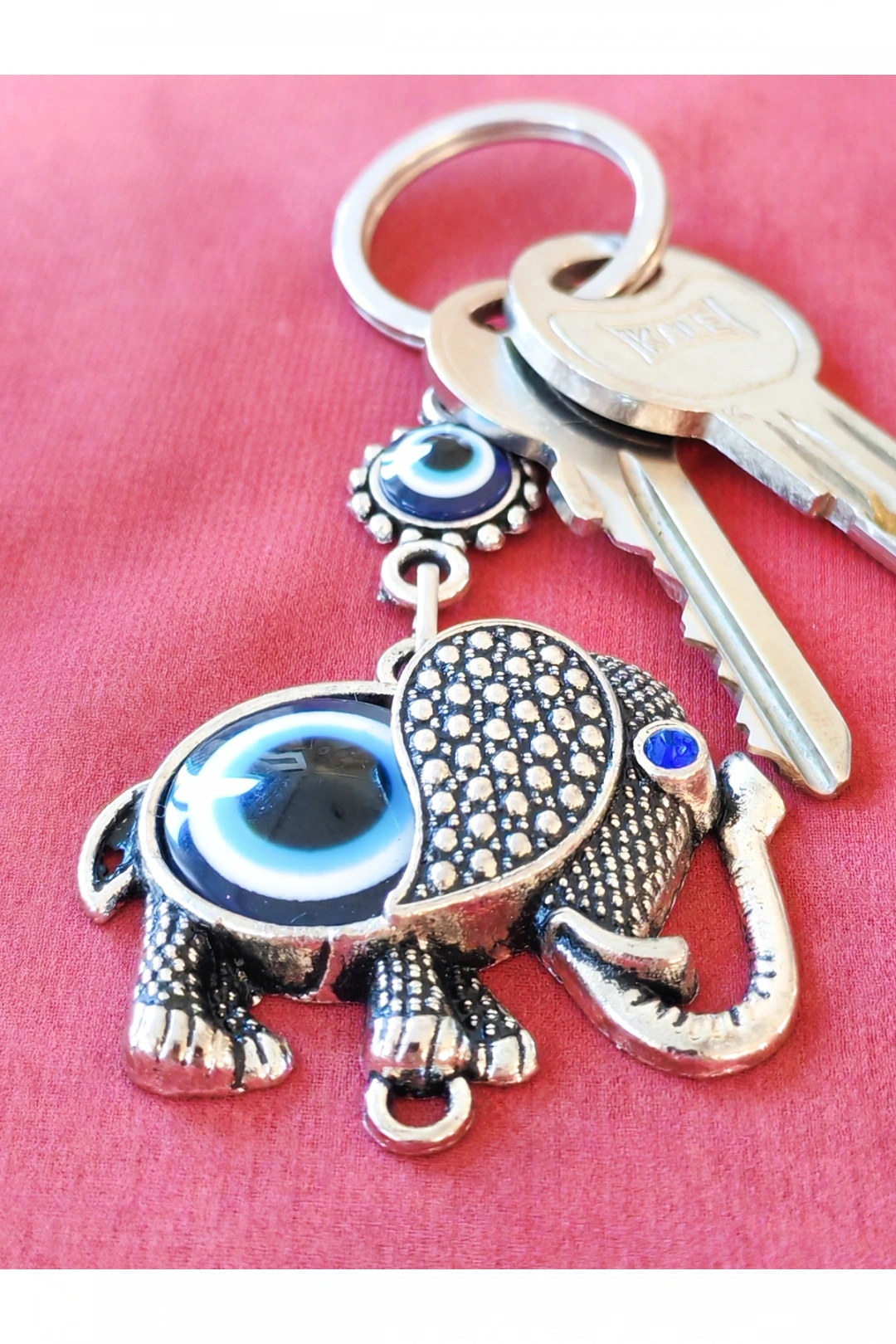 Metal Fil Şekilli Üzeri Cam Göz Süslemeli İnce İşlemeli Anahtarlık – Şans, Bereket ve Koruma Bir Arada