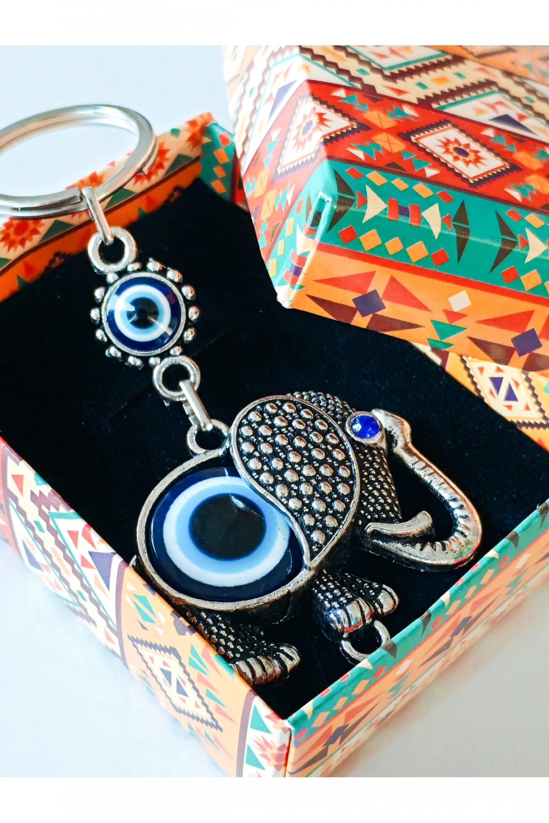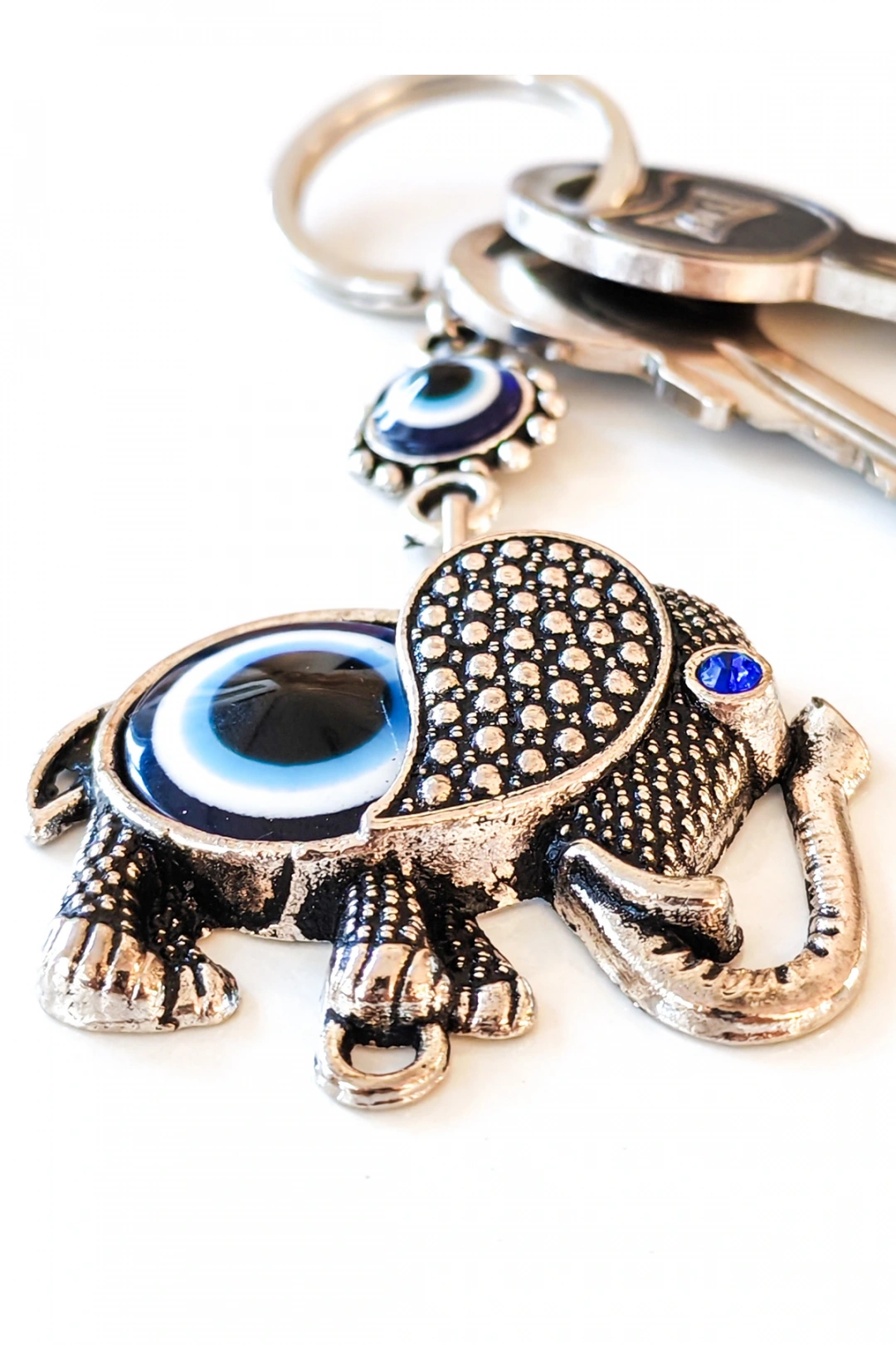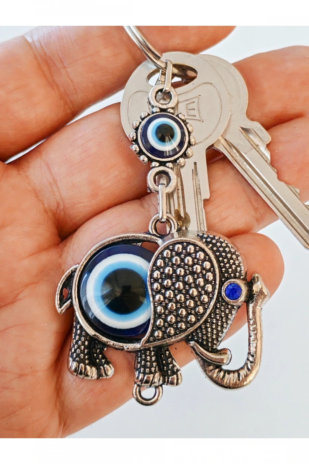 Metal Fil Şekilli Üzeri Cam Göz Süslemeli İnce İşlemeli Anahtarlık – Şans, Bereket ve Koruma Bir Arada