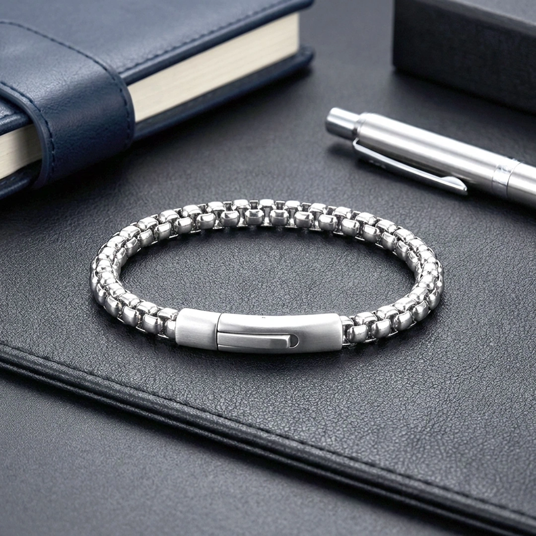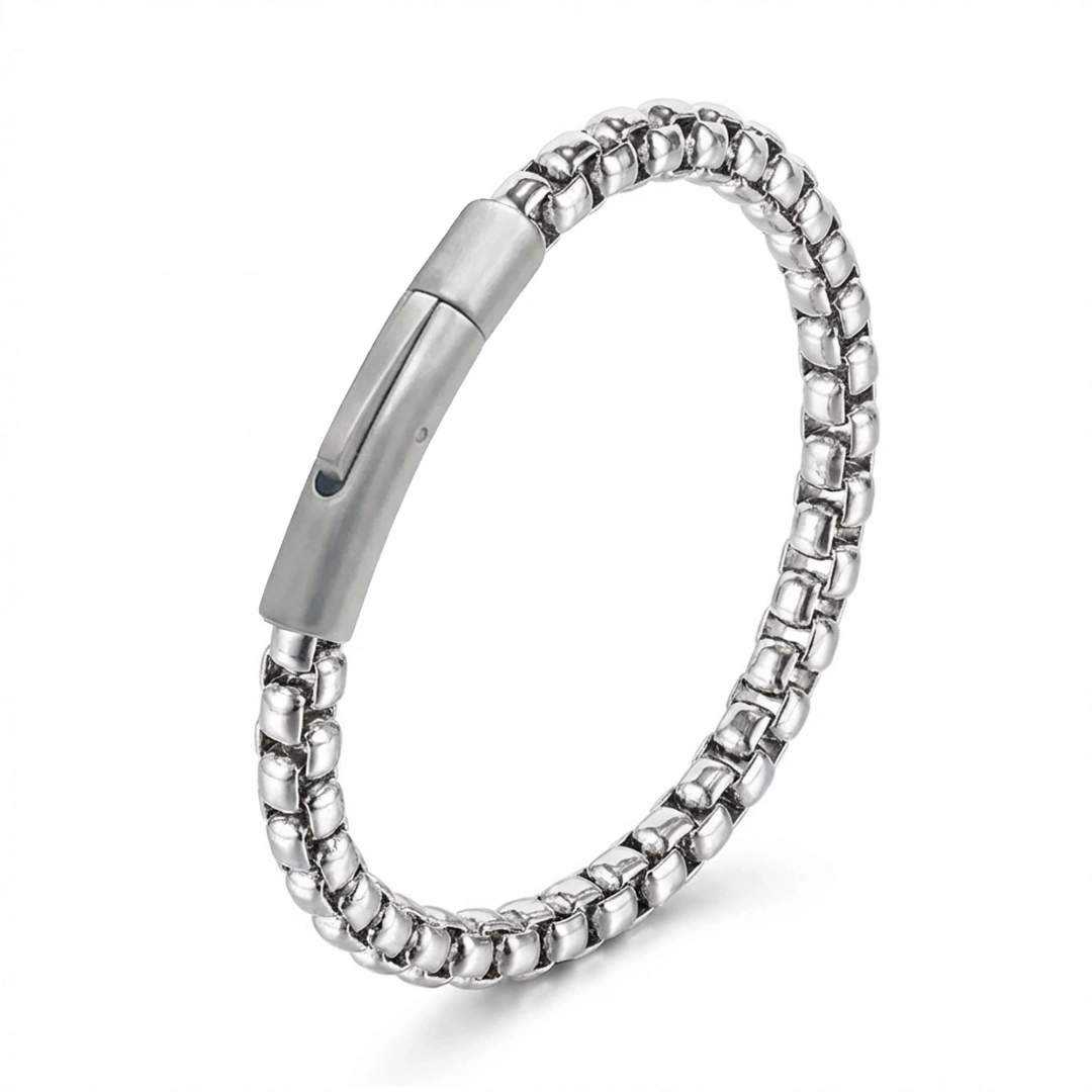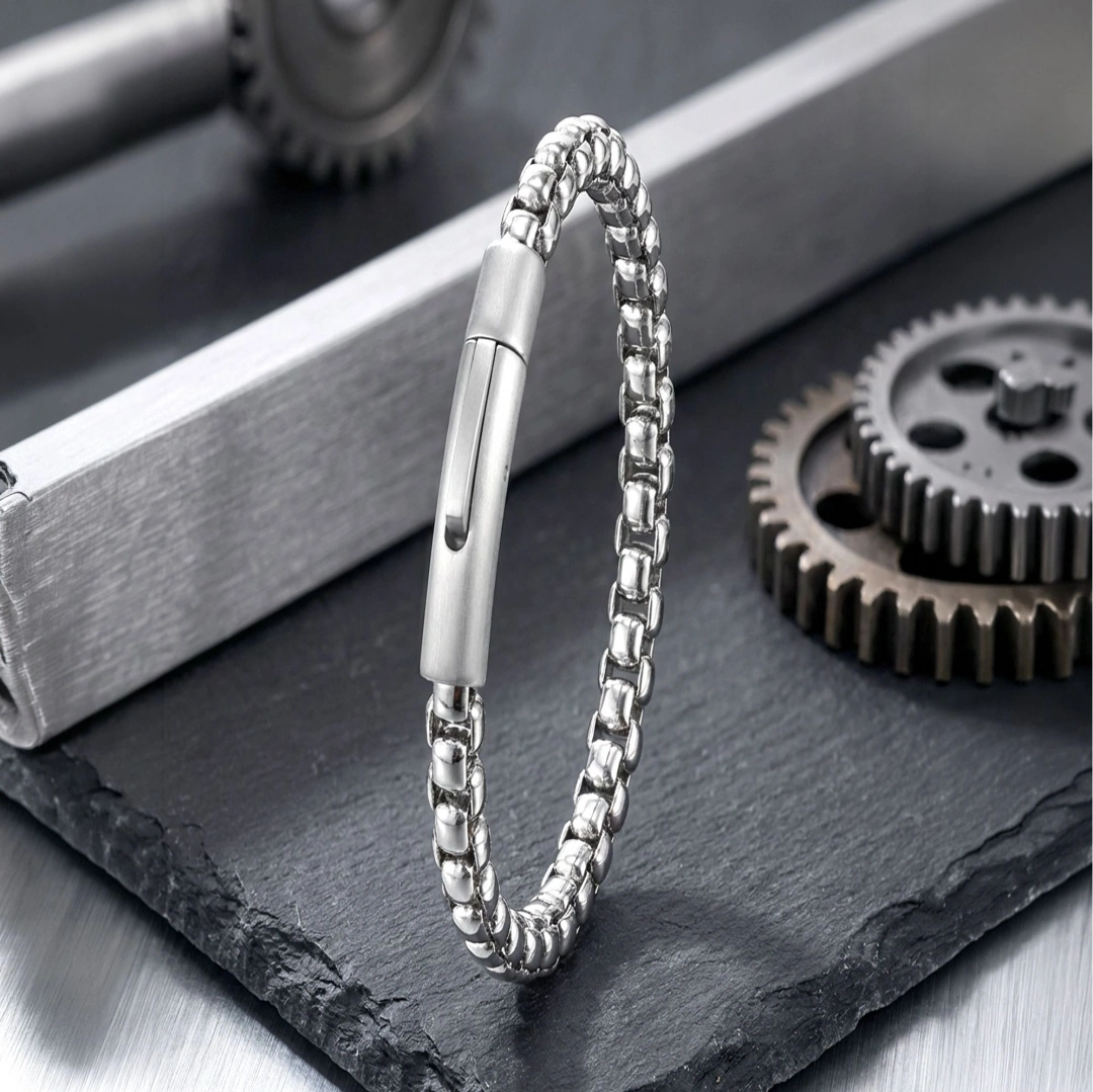 Arnavut model zincirin akıcı ve kesintisiz formu, bilekte güçlü bir duruş sergileyerek sade ama etkileyici bir stil oluşturur. Parlak çelik yüzeyin dengeli yapısı, modern çizgiyi ön plana çıkarırken detaylardaki bütünlük tasarıma karakter kazandırır.