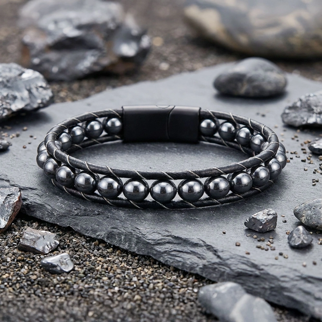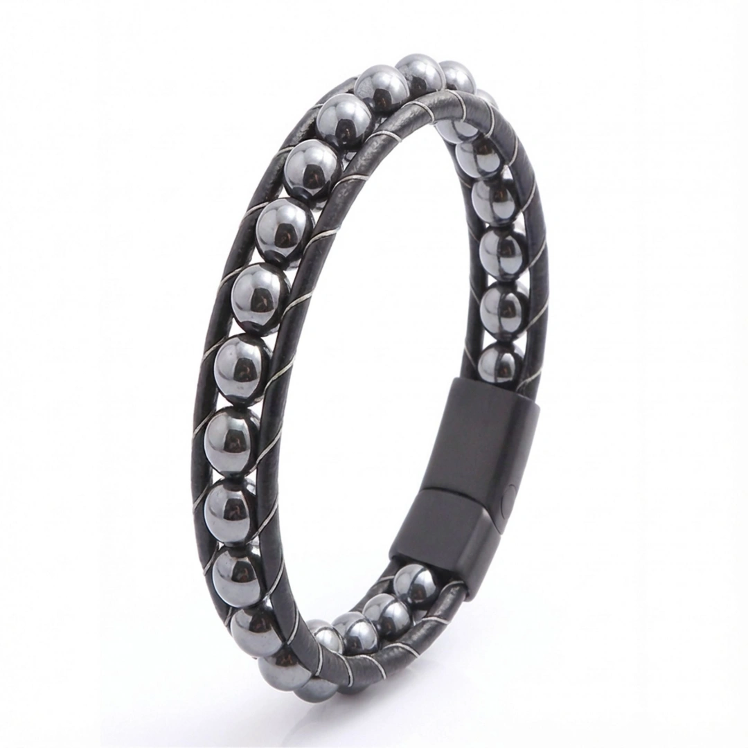 Gücün, dengenin ve zarafetin sembolü olan bu bileklik, modern erkeğin stilini tamamlayan vazgeçilmez bir parçadır. Derinin zamansız şıklığı ile hematit taşının mistik enerjisinin birleştiği bu tasarım, bileğinizde taşıdığınız anda hem stilinize hem de ruhunuza dokunur. Sadece bir aksesuar değil, aynı zamanda yaşamınıza lüks ve enerji katan ayrıcalıklı bir deneyim sunar. Bu özel bileklik, maskülen şıklığın ve güçlü bir duruşun en estetik ifadesi olacaktır.