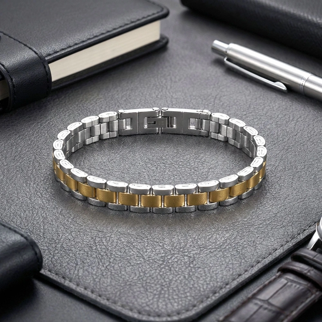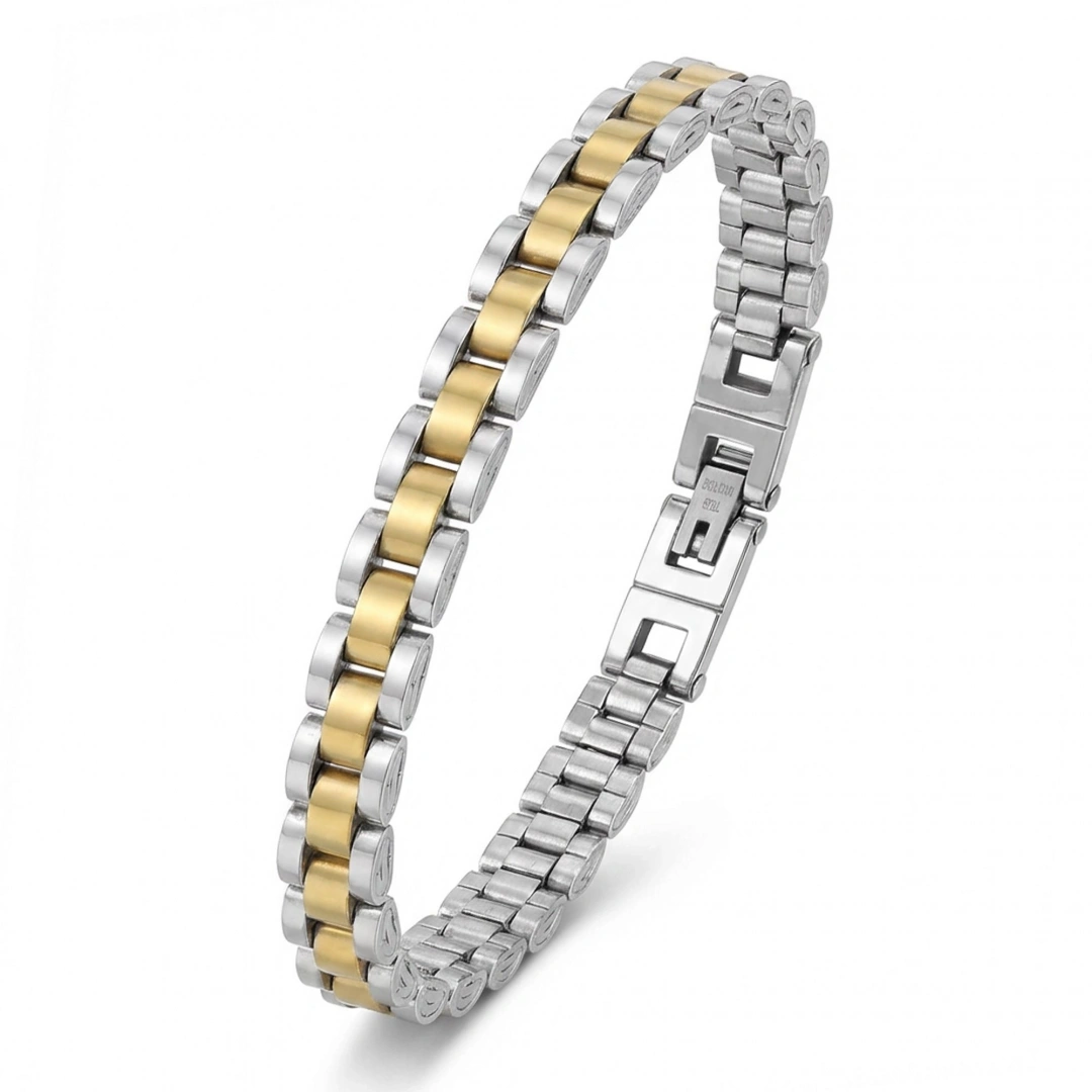 Sarı ve gümüş tonlarının dengeli uyumu, bu bilekliğe zarif ama dikkat çekici bir karakter kazandırır. İnce ve akıcı formu sayesinde bilekte hafif bir duruş sergilerken, modern çizgisiyle sade şıklığı ön plana çıkarır. Günlük kullanımda abartısız bir stil isteyenler için estetik ve dengeli bir tamamlayıcıdır.