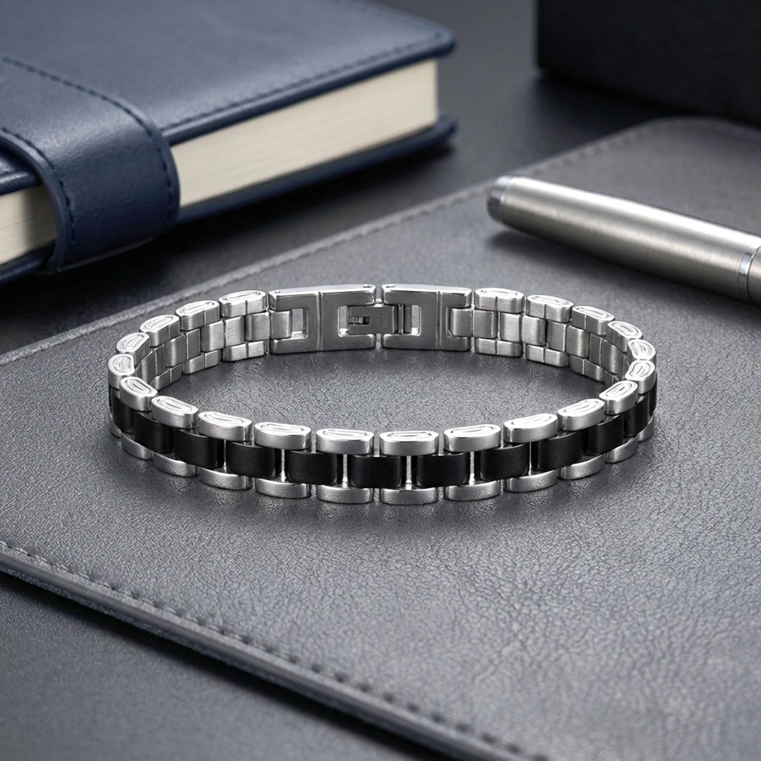 316L paslanmaz çelikten üretilmiş, orta kısmı siyah titanyum detaylı erkek bileklik. 20 cm ölçüsü ve güvenli klips mekanizması ile günlük kullanıma uygundur.