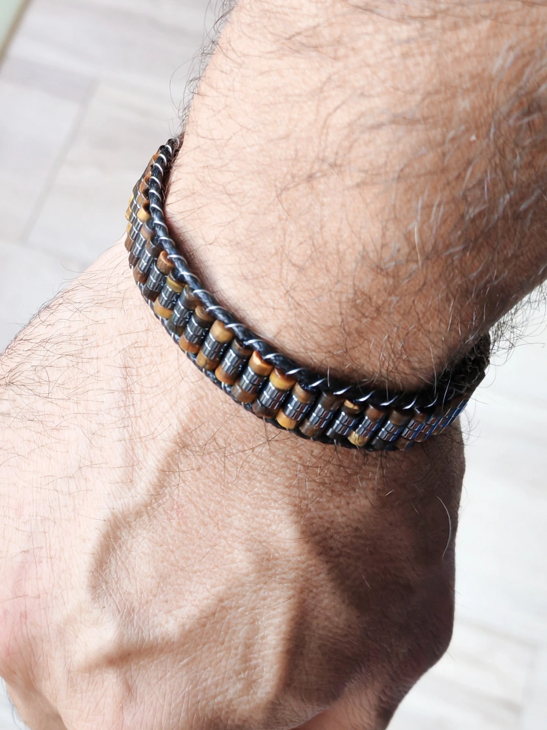Esnek örgü yapısı bileğe tam uyum sağlayarak gün boyu konfor sunar. Doğal taşların kendine özgü dokusu ve sıcak renk geçişleri, bilekliği hem günlük kombinlerde hem de daha şık tercihlerde mükemmel bir tamamlayıcı hale getirir. Her taşın doğadan gelen benzersiz yapısı nedeniyle her bileklik özgün bir karakter taşır.