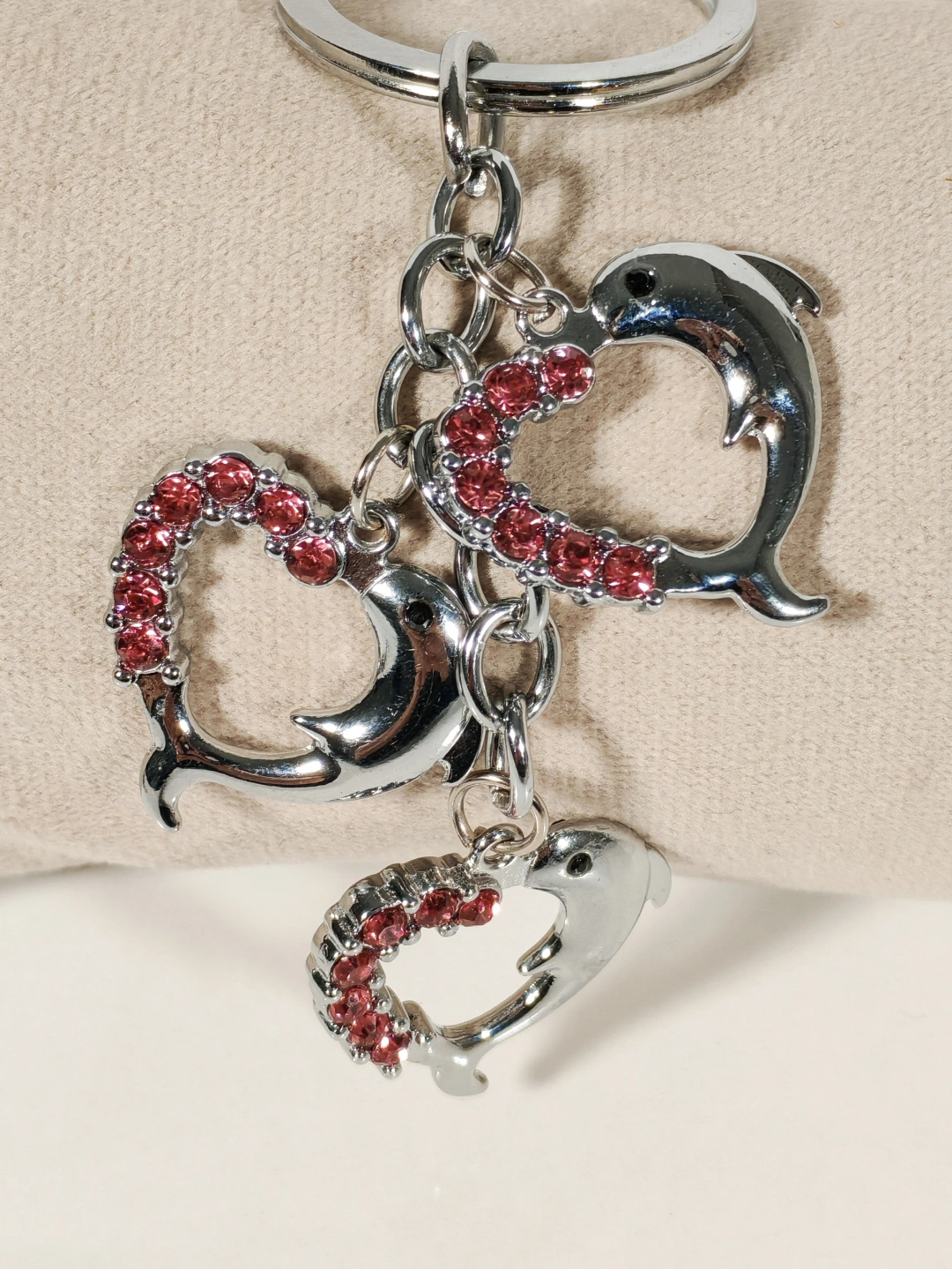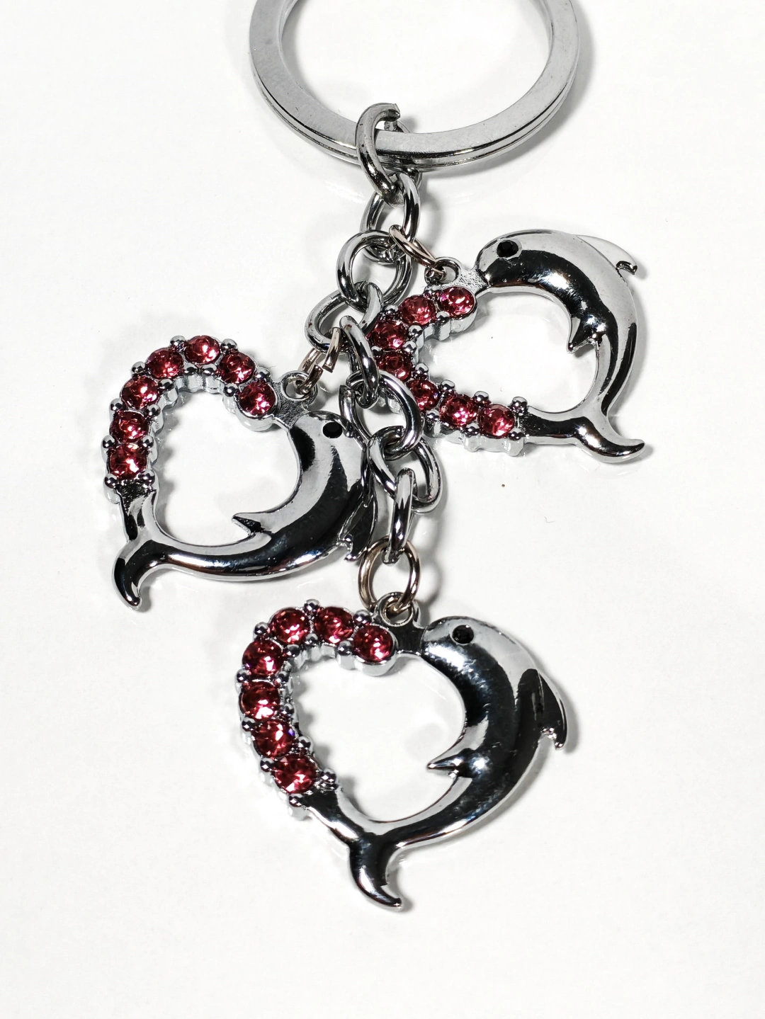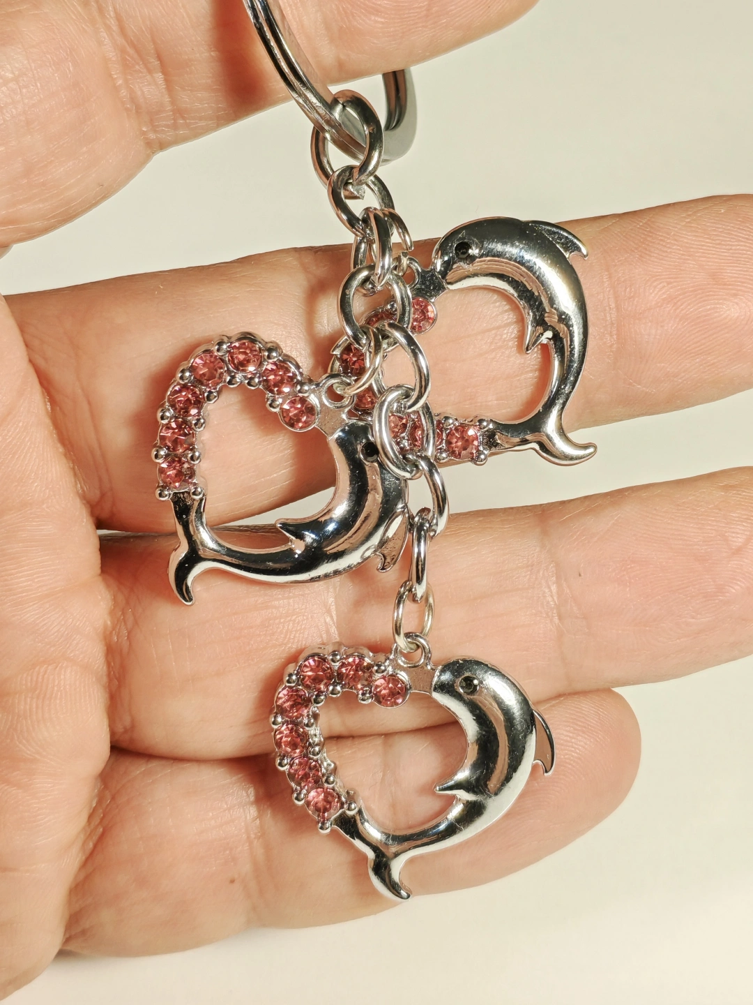 Pembe Taşlı Kalp Şeklinde Yunus Balıklarından Metal Anahtarlık – Sevgi, Neşe ve Pozitif Enerjinin Zarif İfadesi