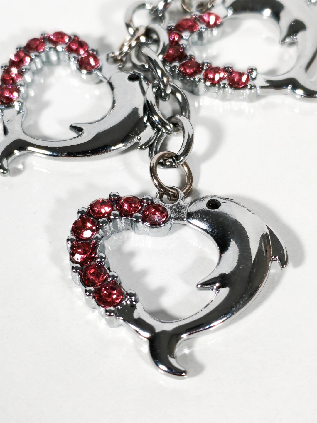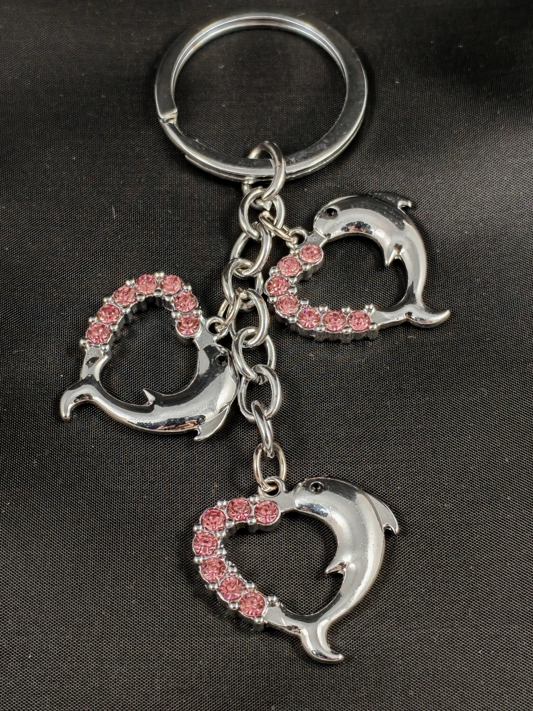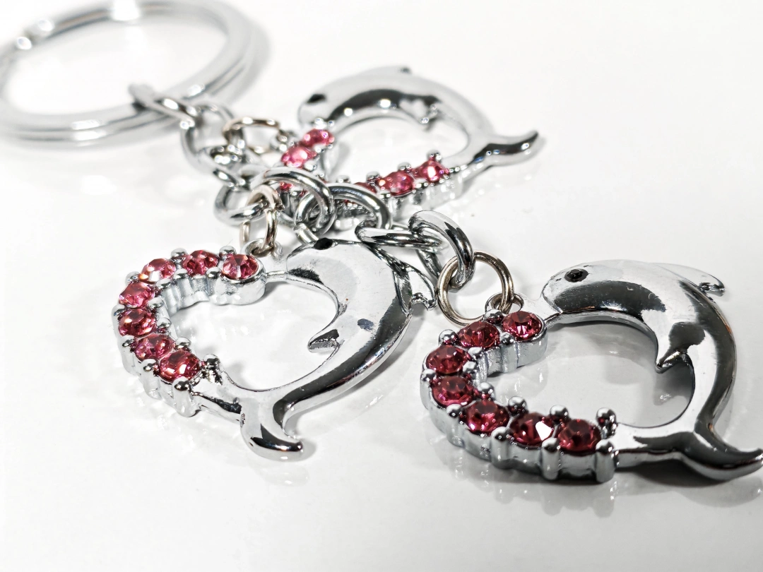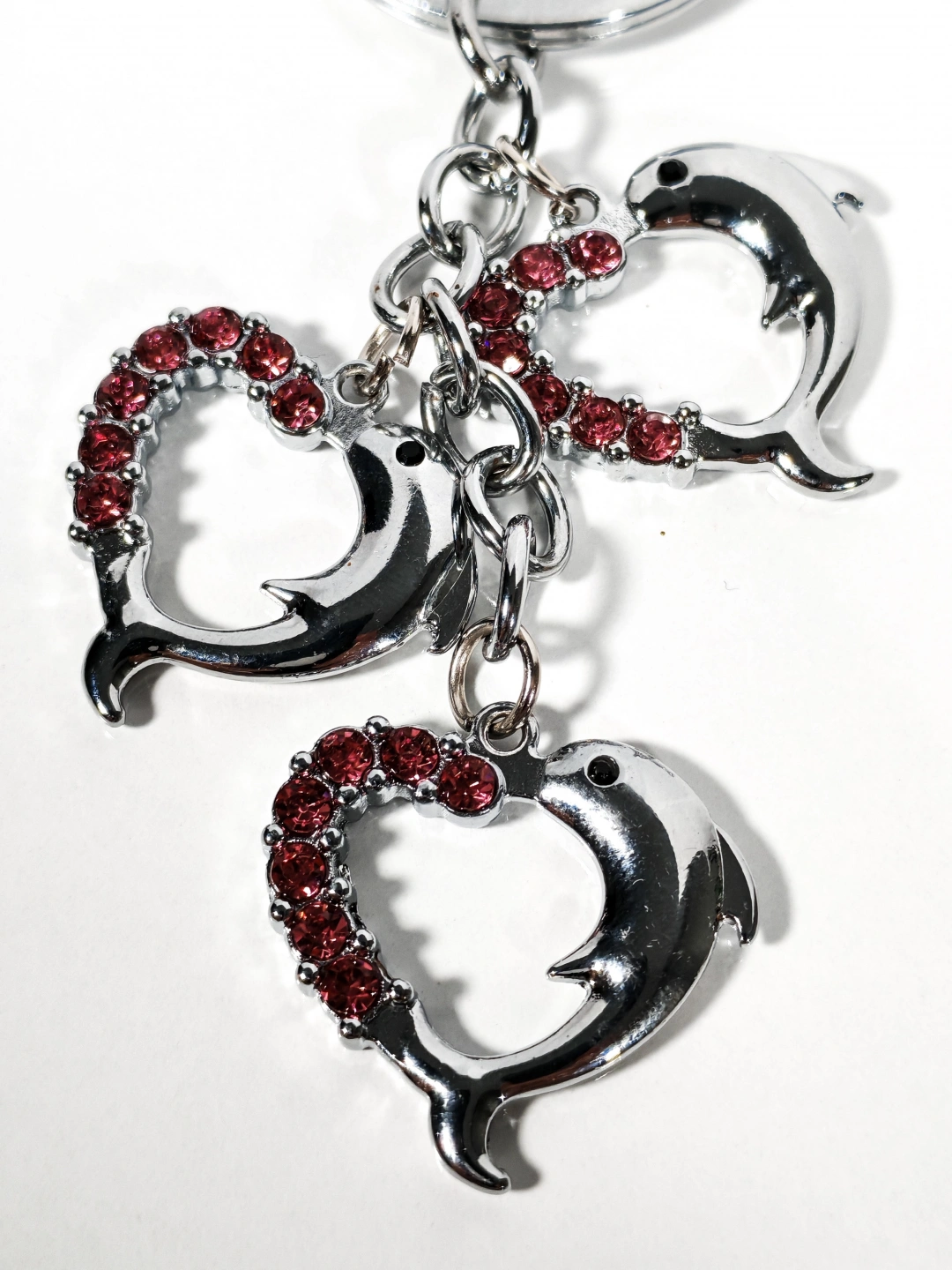 Pembe Taşlı Kalp Şeklinde Yunus Balıklarından Metal Anahtarlık – Sevgi, Neşe ve Pozitif Enerjinin Zarif İfadesi
