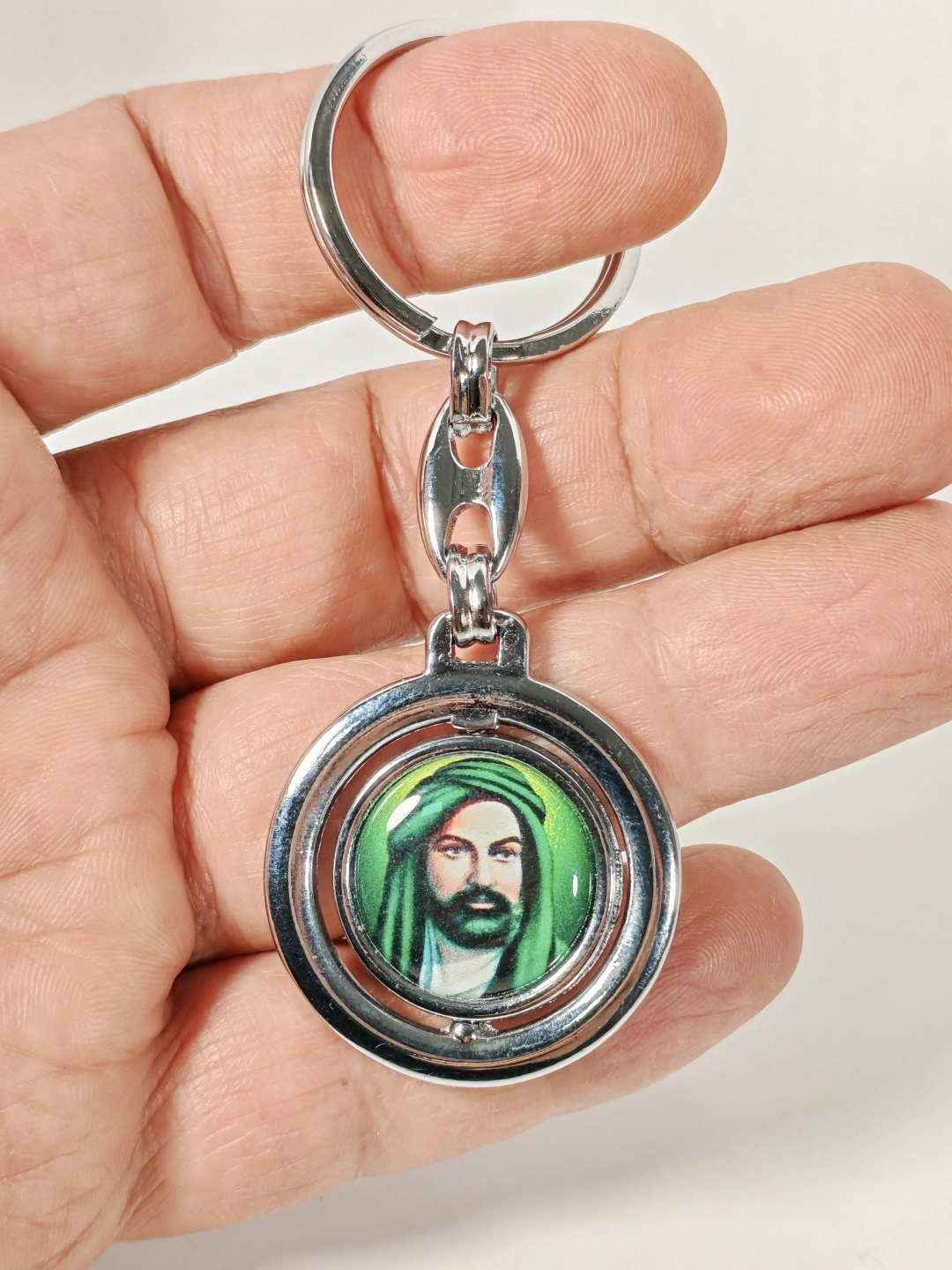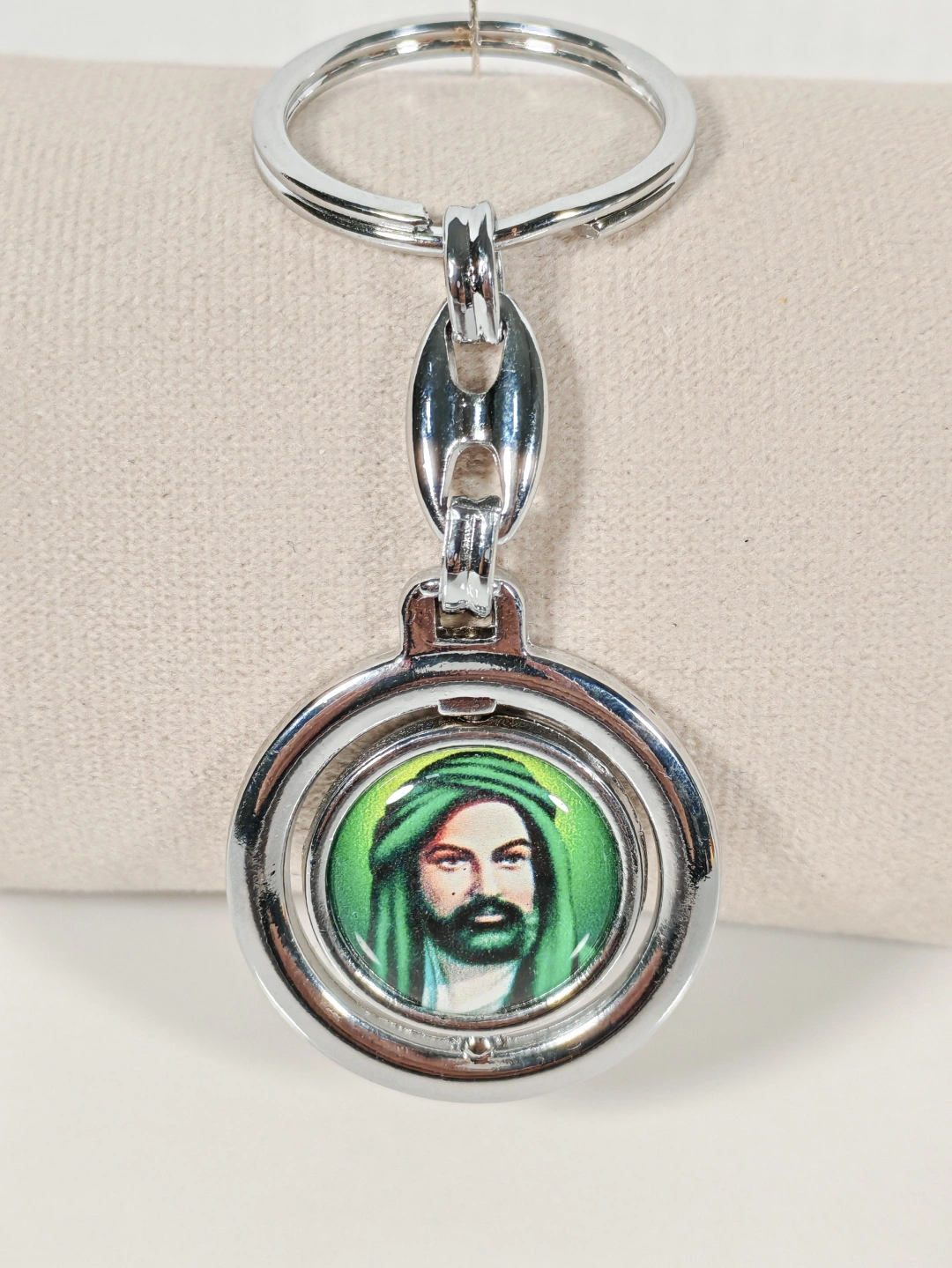 Merkezinde yer alan Hz. Ali figürüyle tasarlanan bu yuvarlak metal anahtarlık, güçlü manevi anlamı ve sade şıklığı bir arada sunar. Yeşil tonların hâkim olduğu figür detayı, metal çerçeve ile bütünleşerek ürüne hem dikkat çekici hem de dengeli bir görünüm kazandırır. Yuvarlak formu sayesinde klasik ve zamansız bir duruş sergiler.