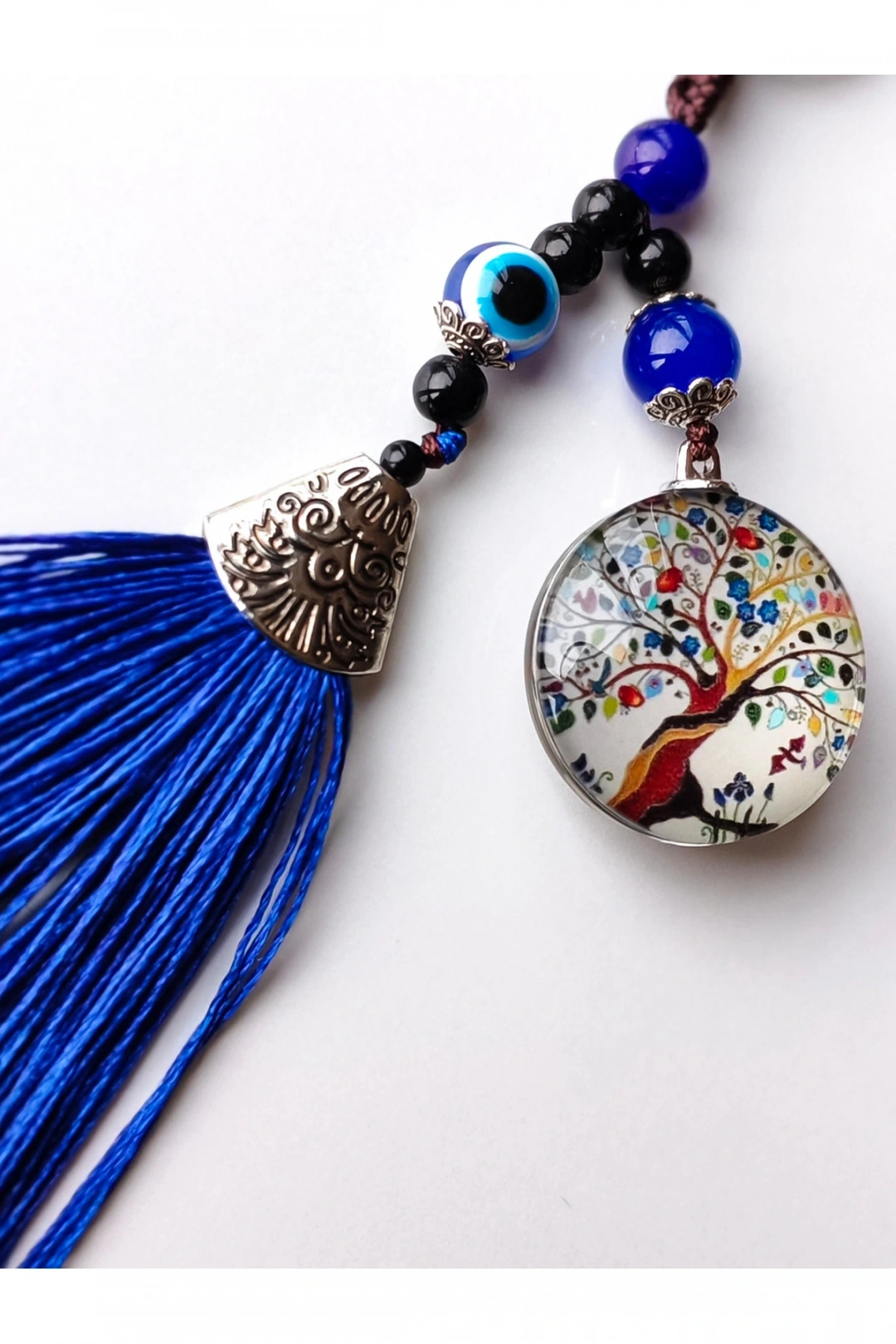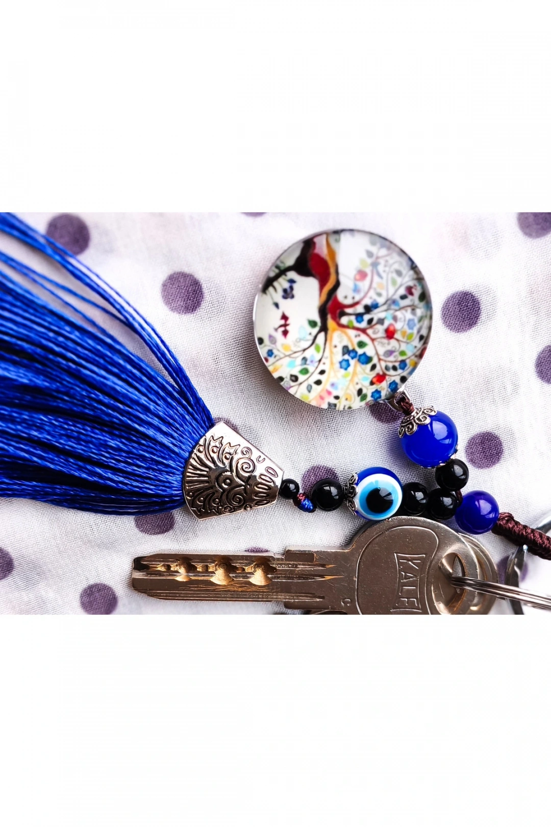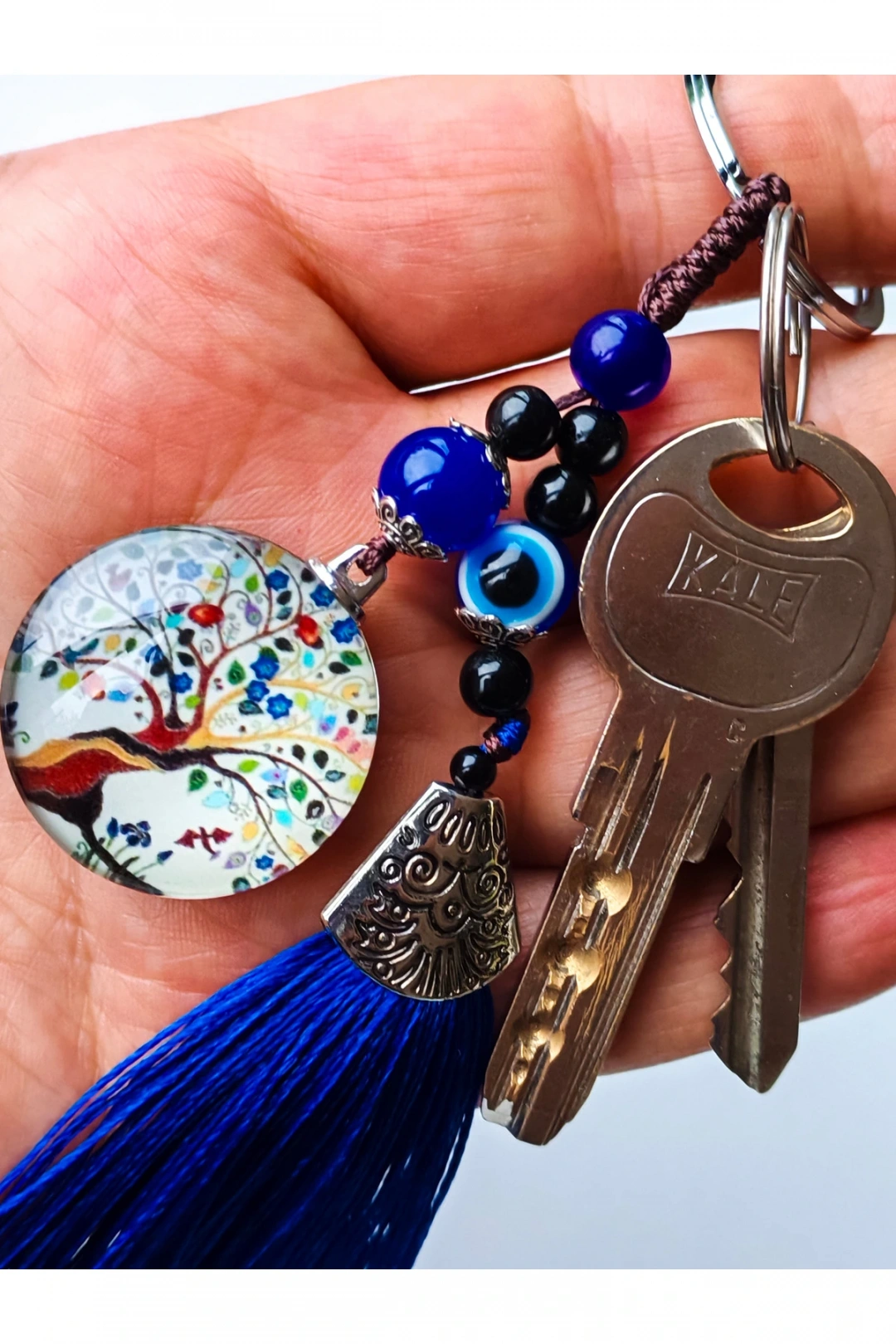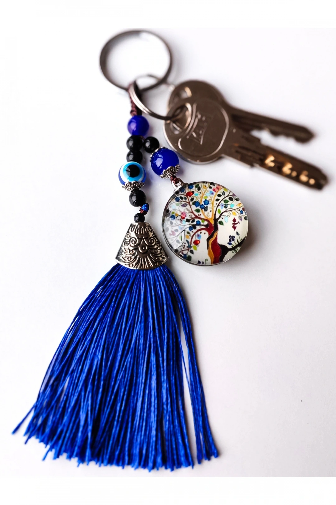 Renkli Cam Hayat Ağacı Mavi Püsküllü Anahtarlık – Anlamlı ve Estetik Tasarım