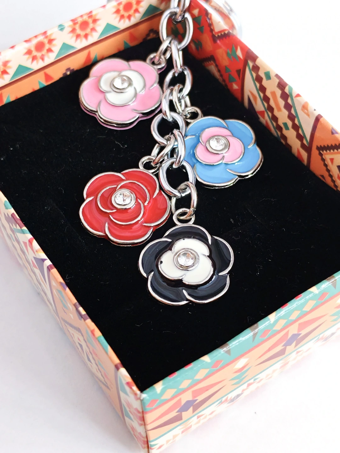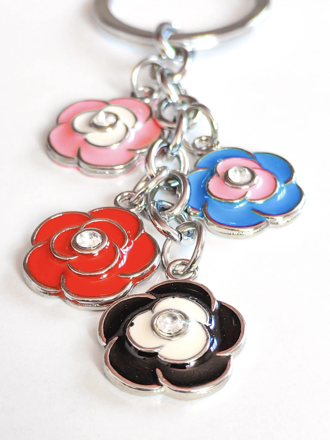 Göz alıcı ve şık tasarımıyla dikkat çeken bu özel metal anahtarlık, her biri ayrı zincire takılmış dört farklı renkte gül figüründen oluşuyor. Her gül, aşkın, zarafetin ve farklı duyguların simgesi olarak ayrı bir anlam taşırken, birlikte bütünleşerek estetik bir uyum sağlıyor. Renkli detayları sayesinde neşeli, canlı ve romantik bir görünüm sunar.