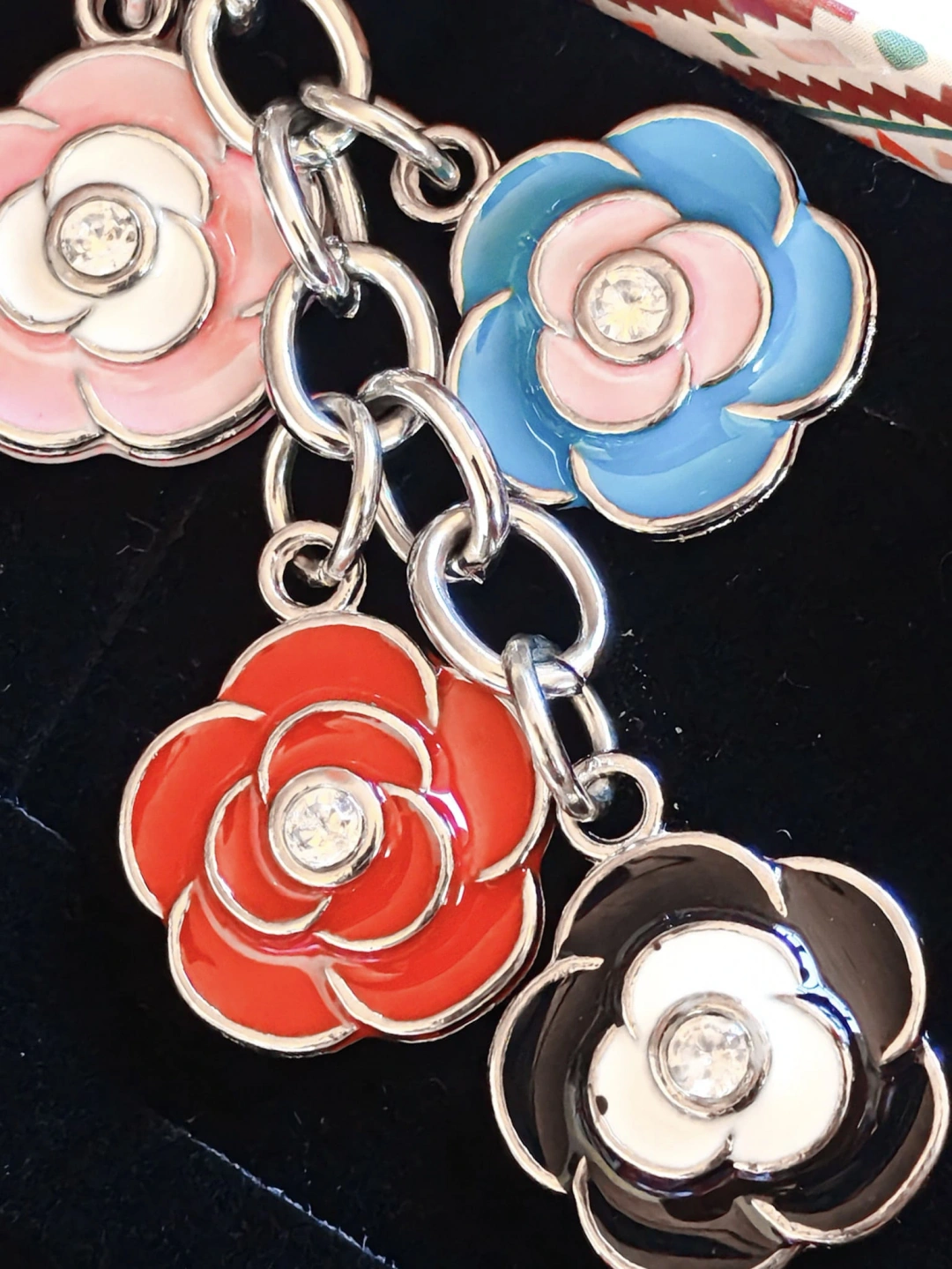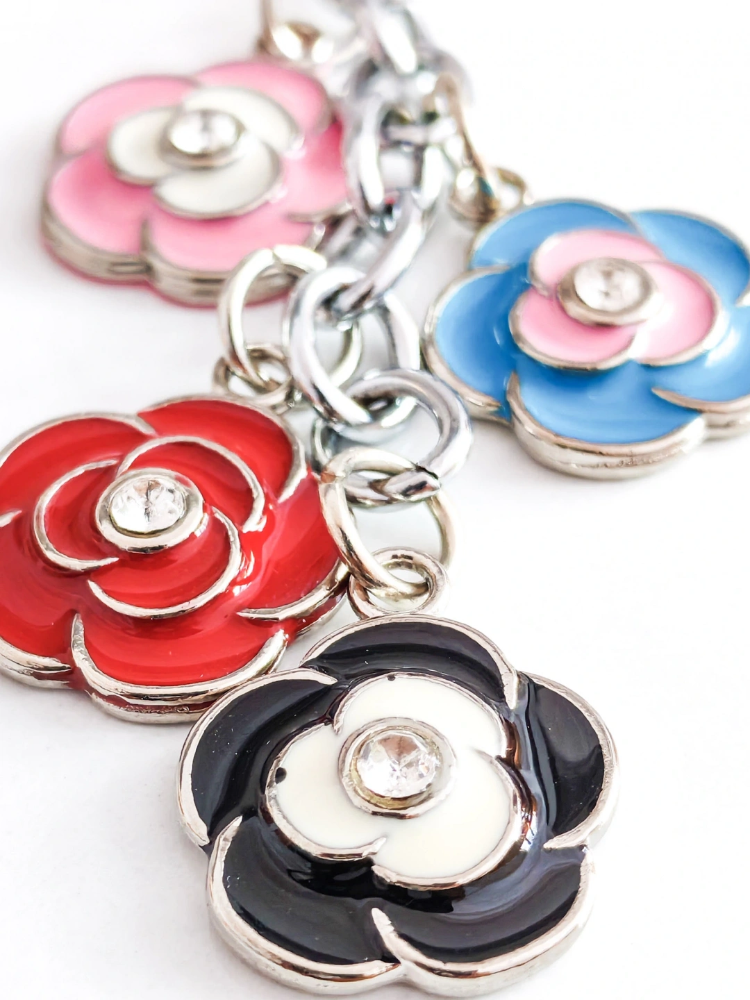 Her biri ayrı zincire takılmış 4 farklı renkte gül figürü